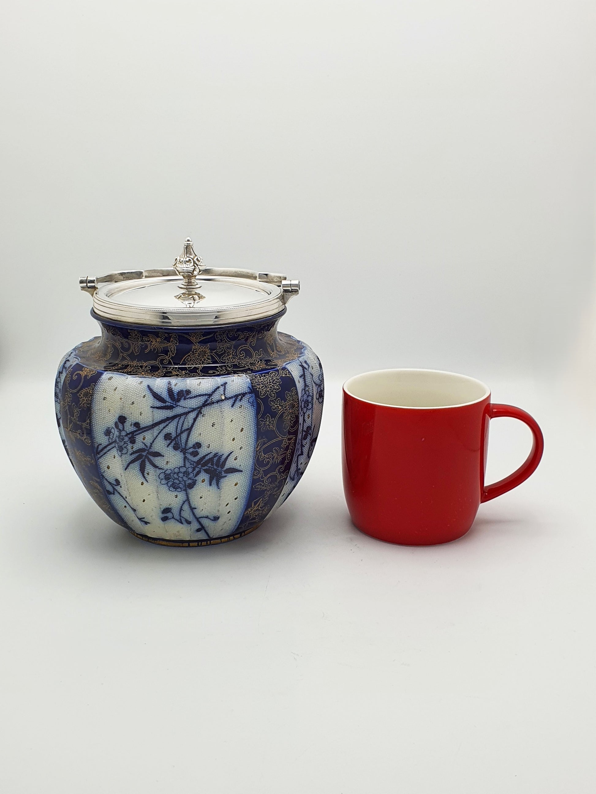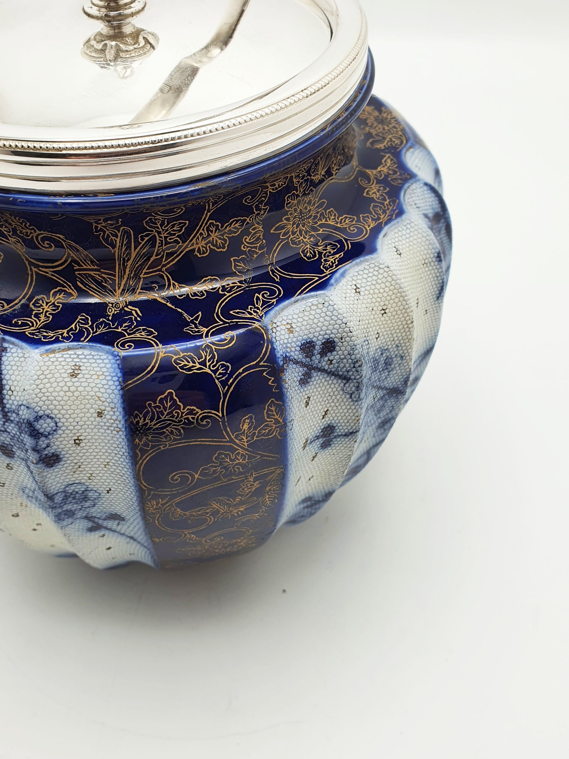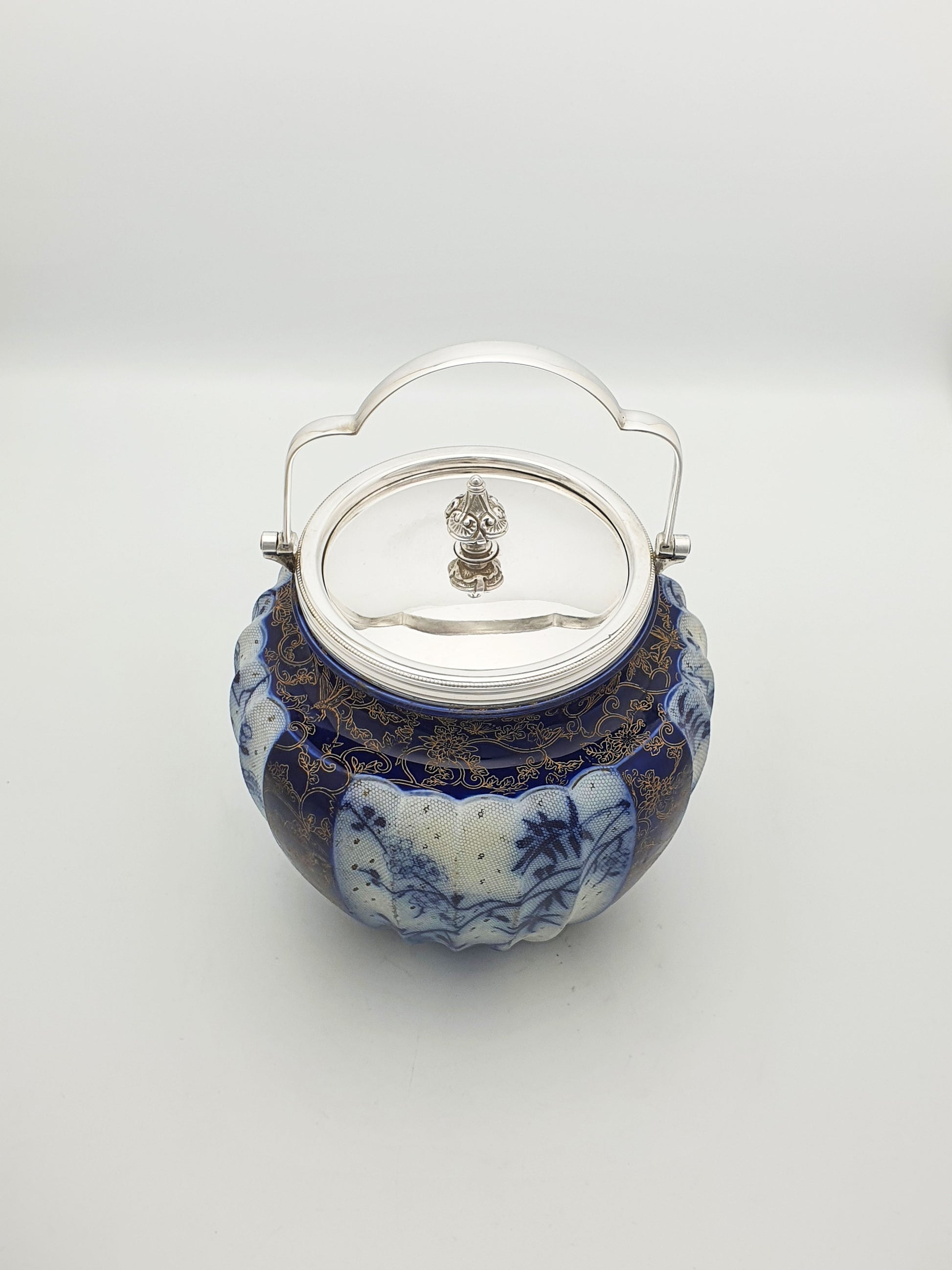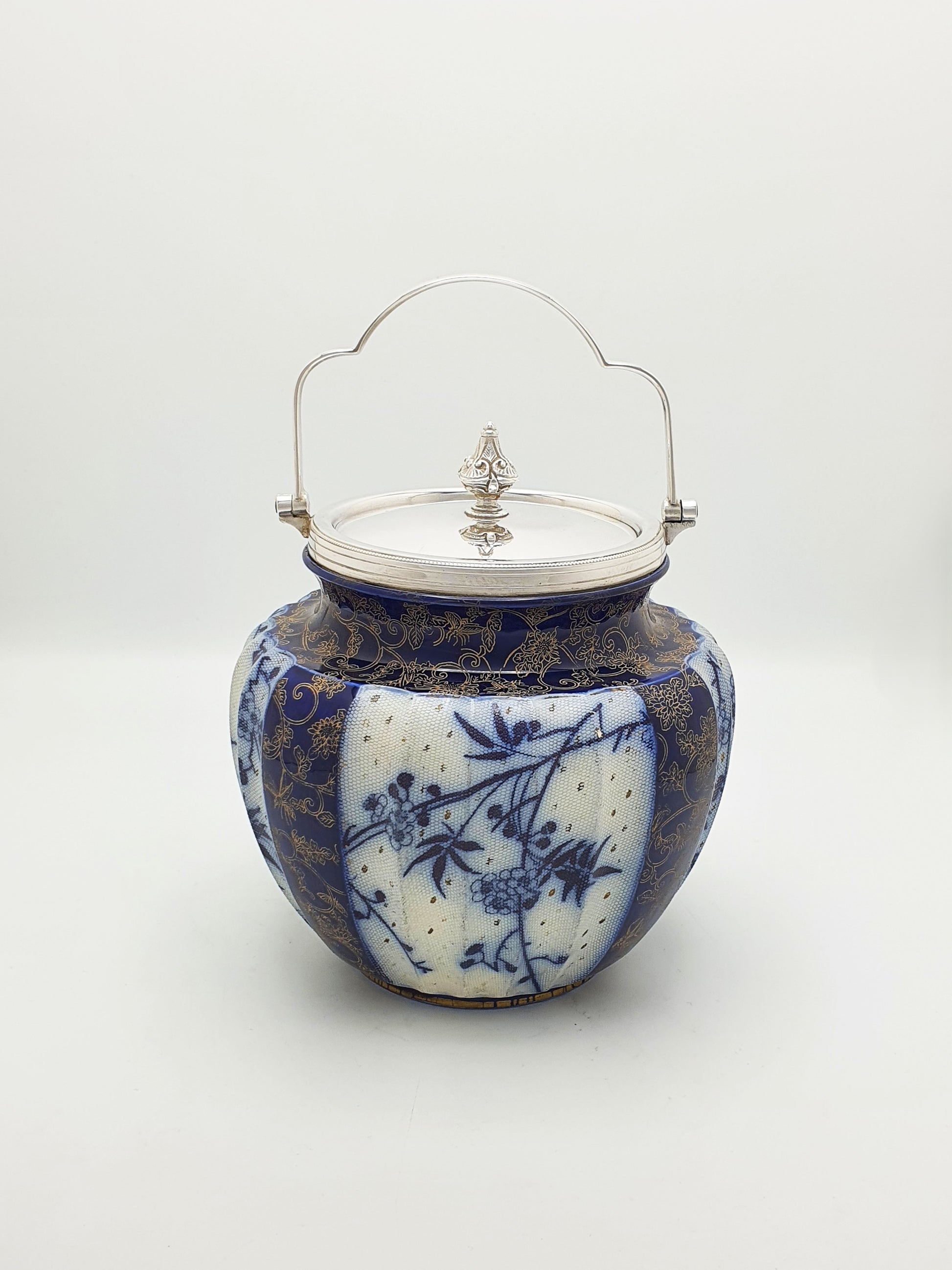 A Lovely Antique Victorian Royal Doulton Biscuit Barrel beautifully adorned in flow blue and finished with delicate gilded floral detailing. This charming piece is topped with a polished silver plated lid and handle, completing the refined look of a quintessential Victorian–Edwardian era biscuit jar.