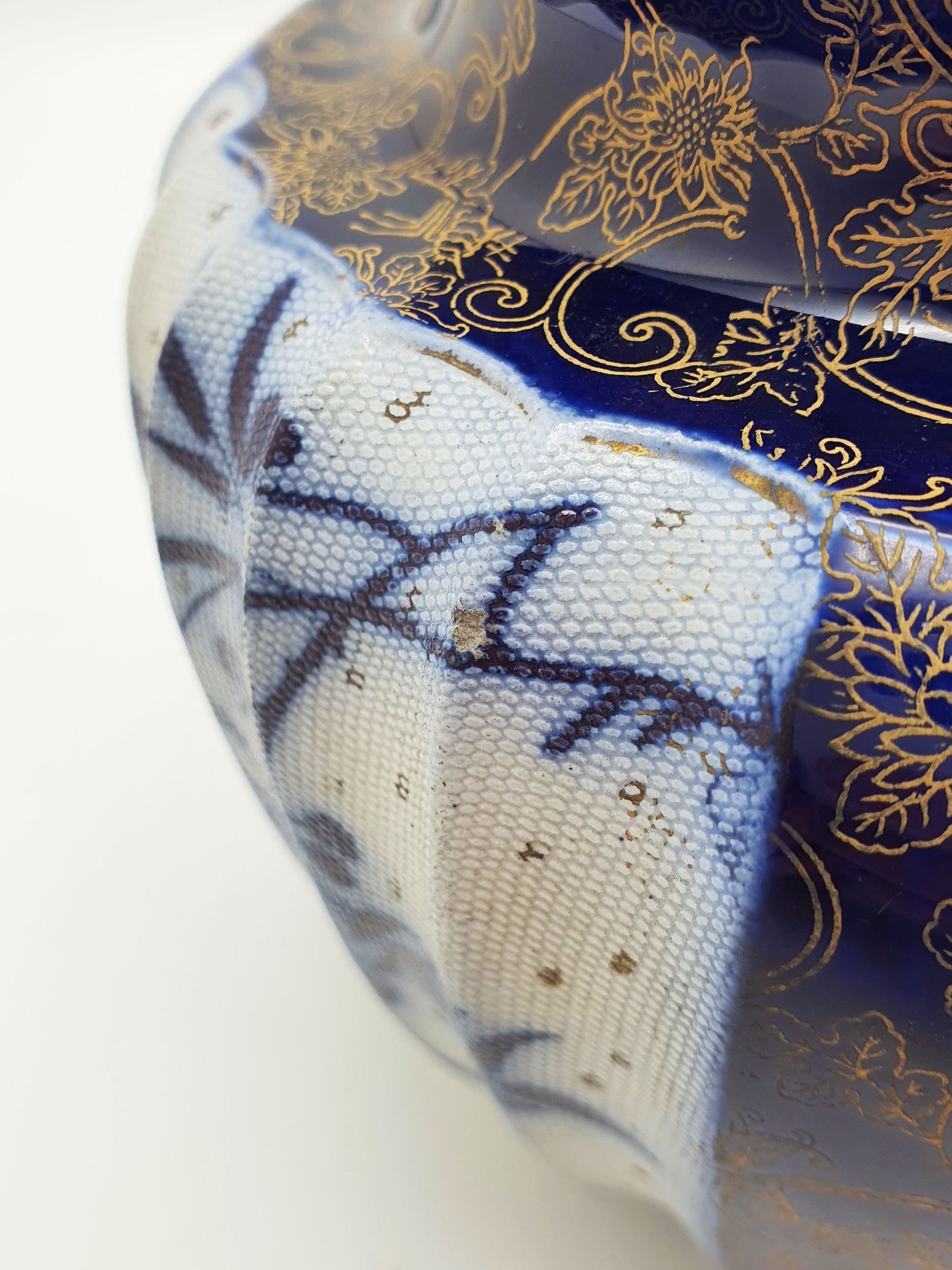 Deep cobalt panels with classic flow blue decoration - a prized Victorian technique where the blue glaze gently bleeds into the porcelain. Panels alternate with raised honeycomb texture and intricate hand-applied gilt floral overlays, creating rich contrast and a tactile surface – circa 1890.