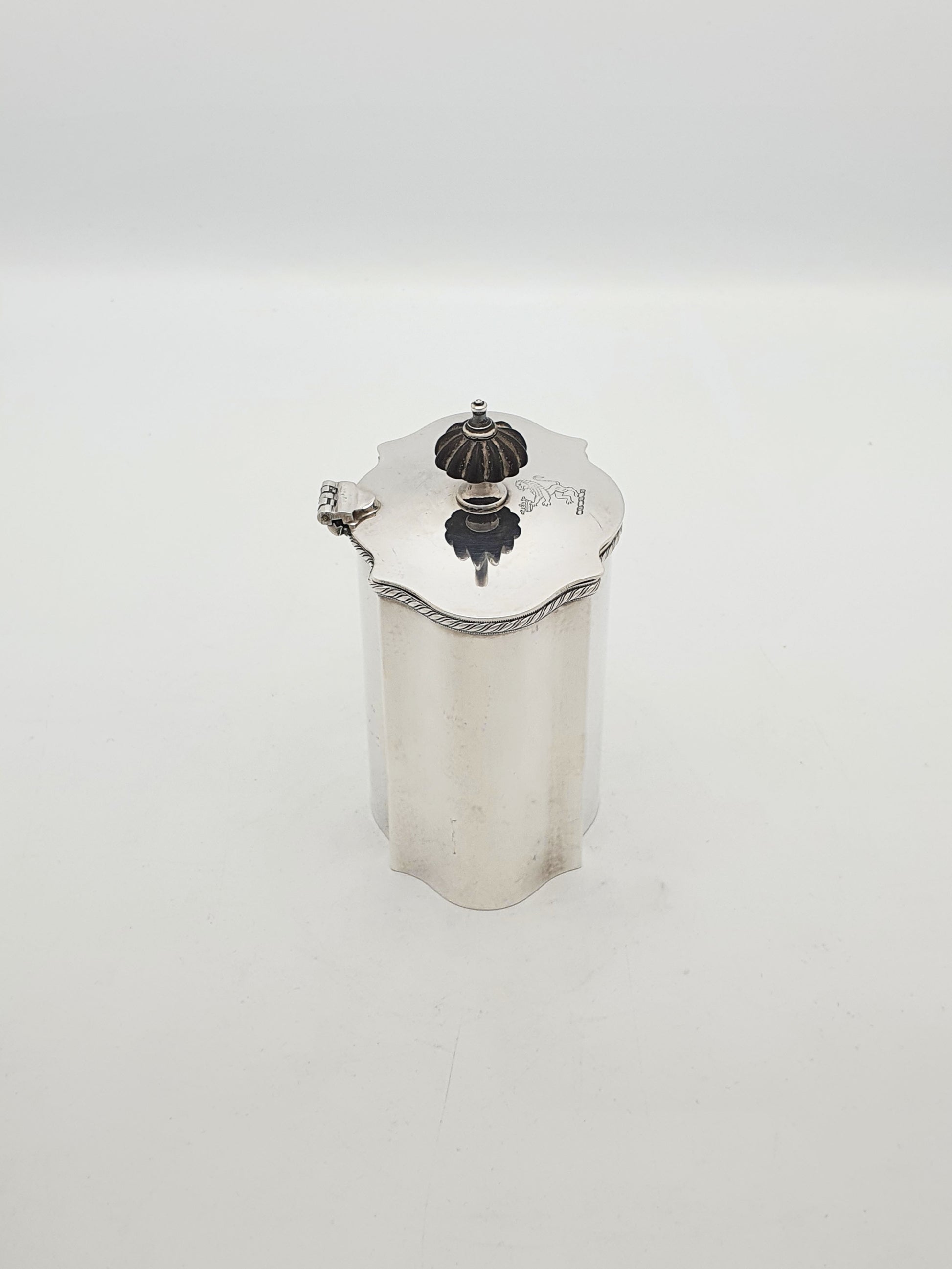 A Lovely Antique Georgian-Style Silver Plated Tea Caddy featuring a charming lobed body and a hinged lid topped with a ribbed finial. Its bold yet graceful form is further enhanced by the engraved crest of a lion holding a crown, lending a sense of aristocratic heritage. Crafted in a Georgian style this caddy was designed not only for storing fine tea leaves but also to display the status and taste of its owner – circa 1920.