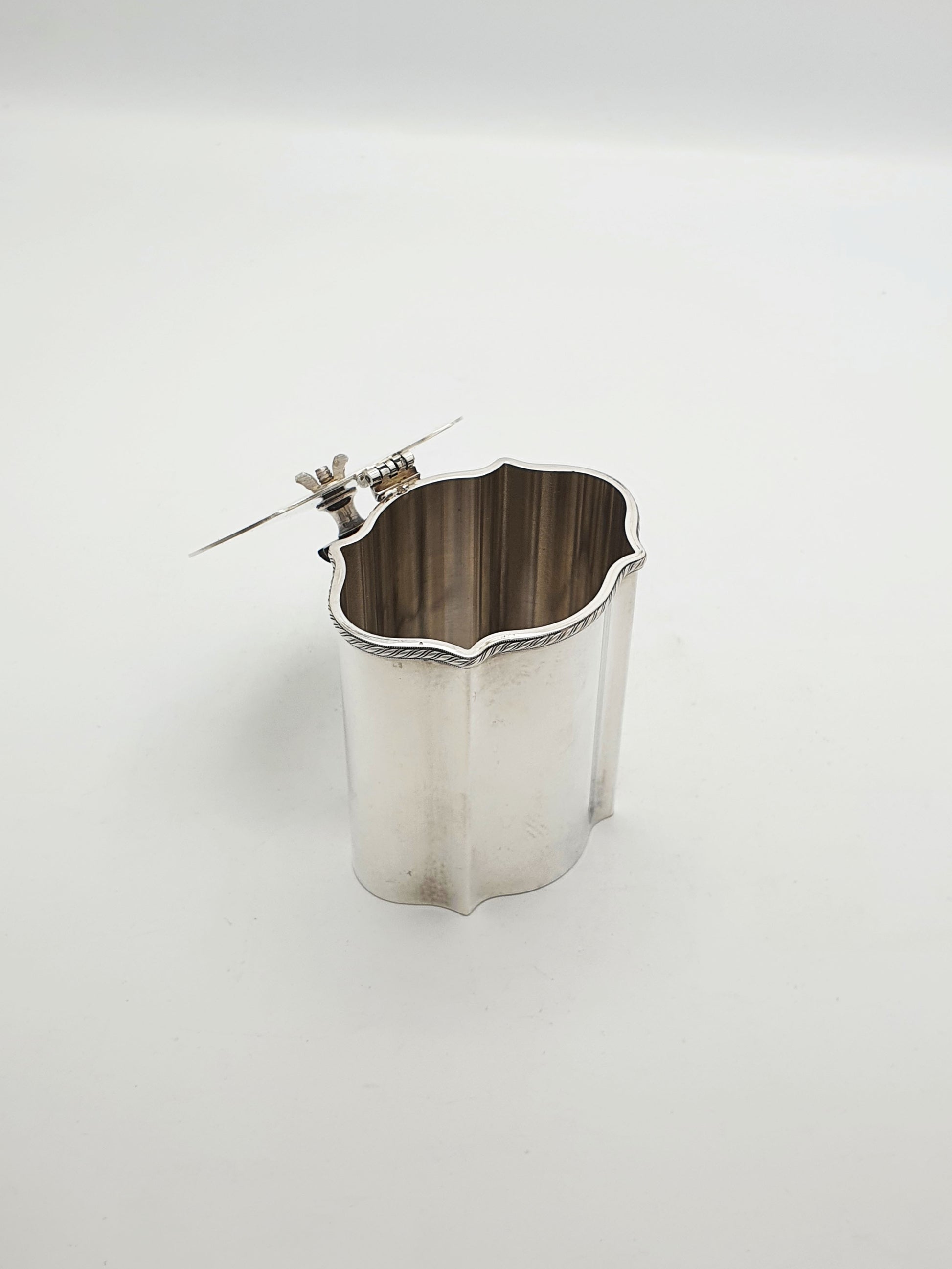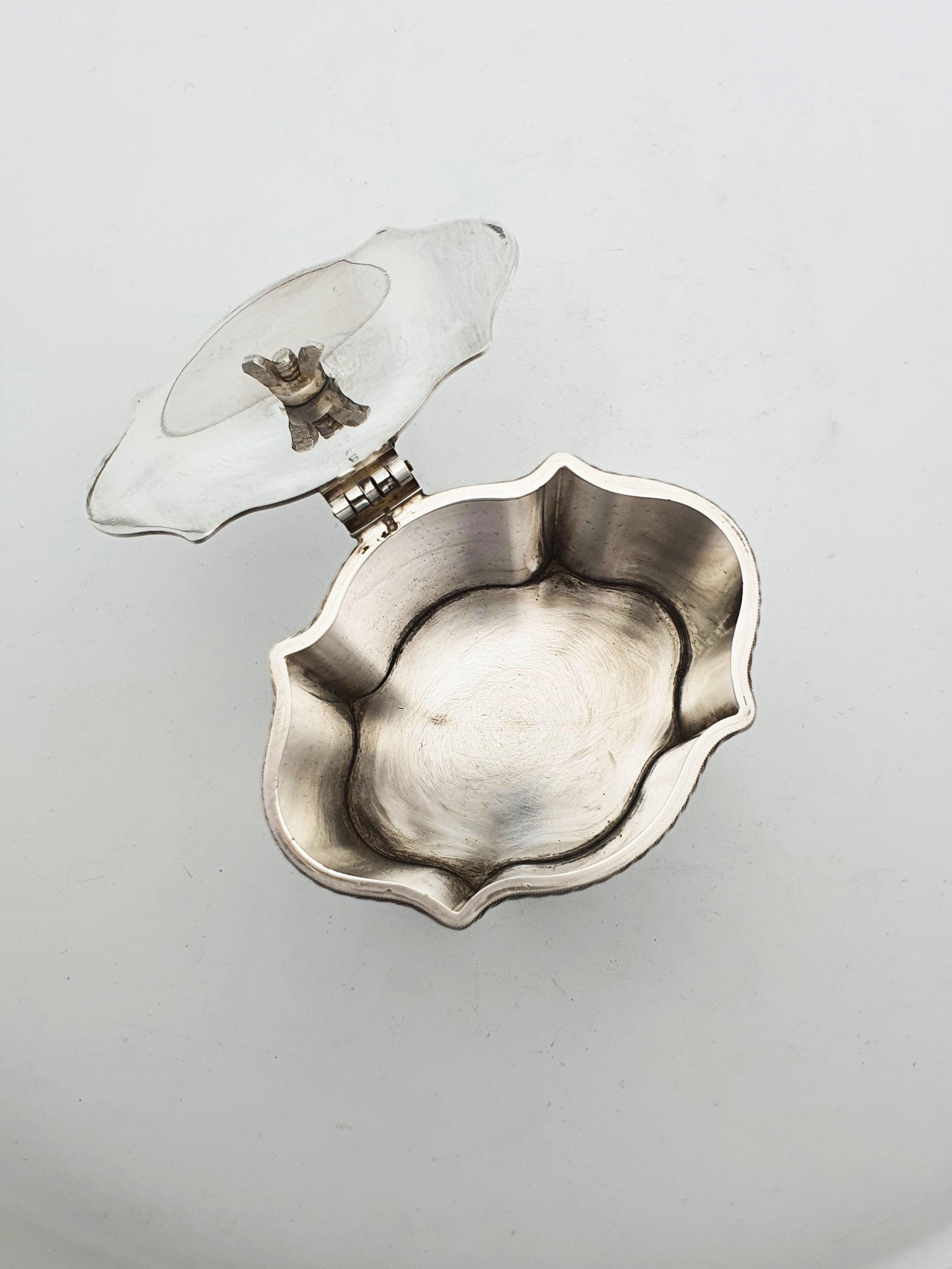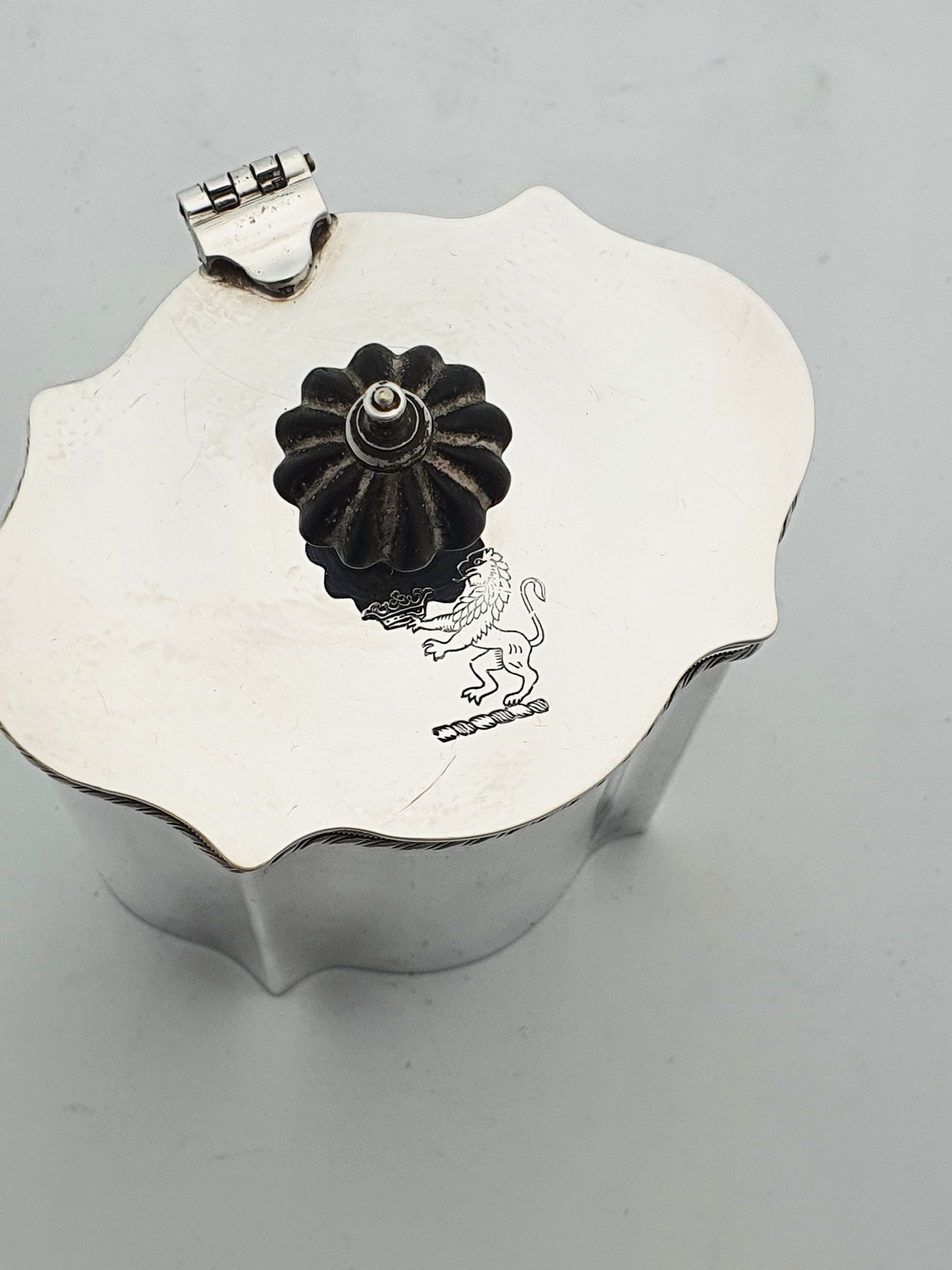 In good condition – no structural damage and a beautifully aged surface. The silver has a soft, even patina, and the engraved crest remains sharp and legible. The hinged lid opens and closes cleanly.