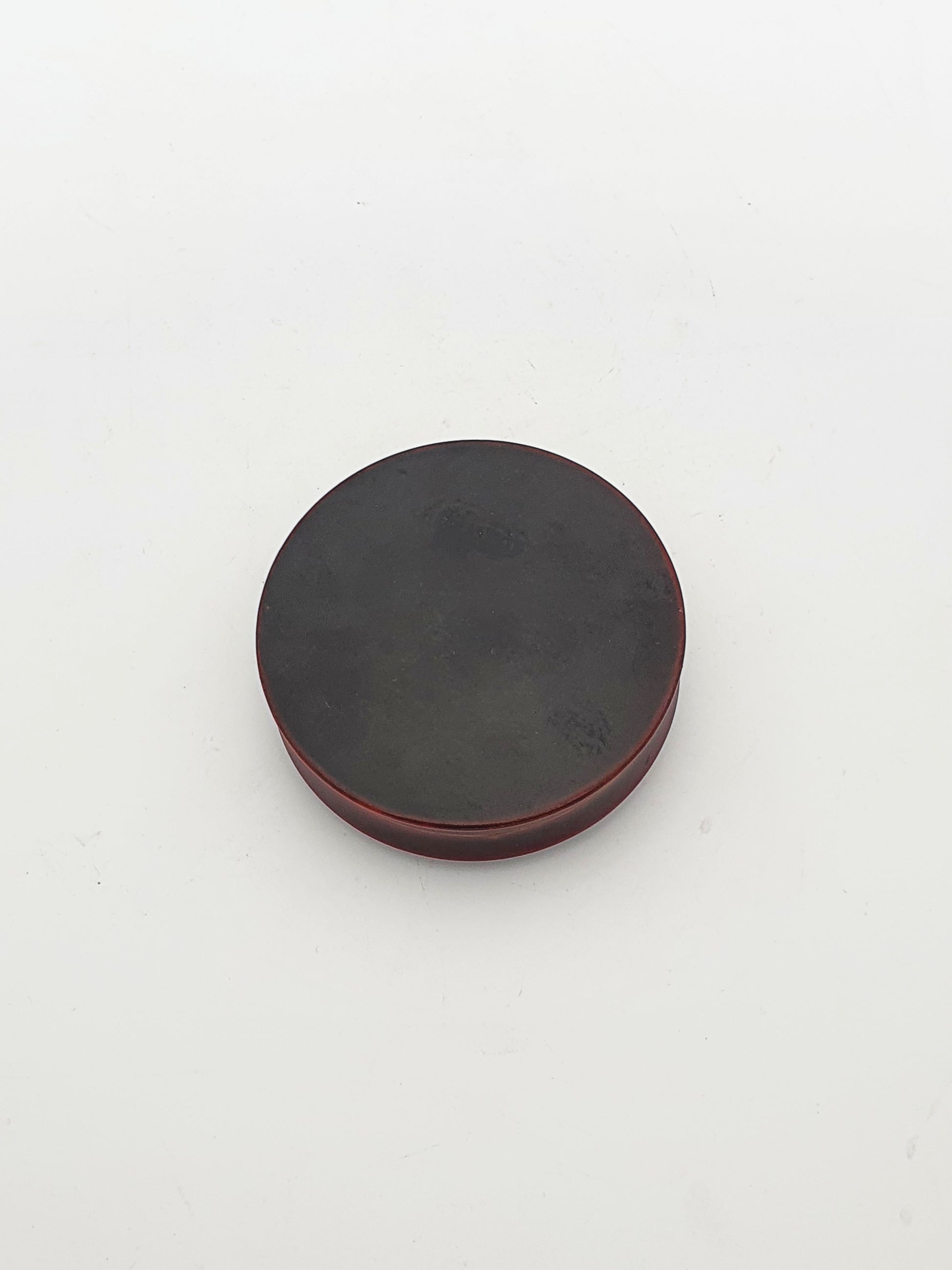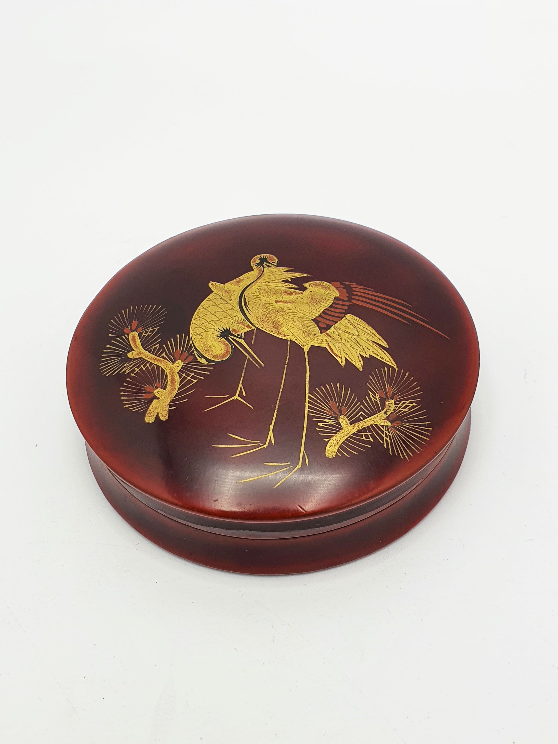 A Lovely Antique Japanese Lacquer Box featuring a golden crane design on a rich, deep red-brown surface. Perfectly round and delicately finished, it showcases the time-honoured artistry of Japanese lacquerware—both functional and highly collectible – circa 1920.