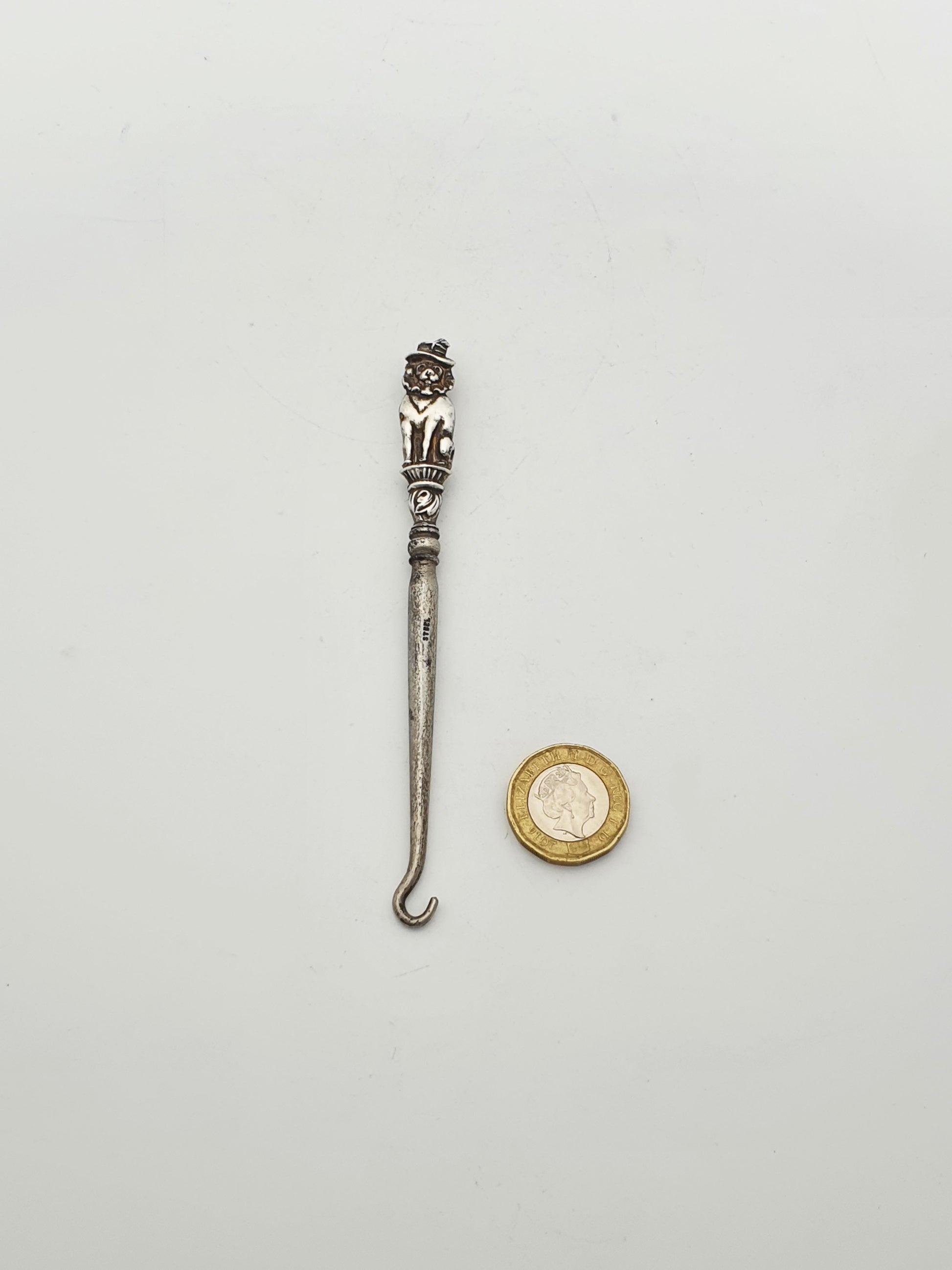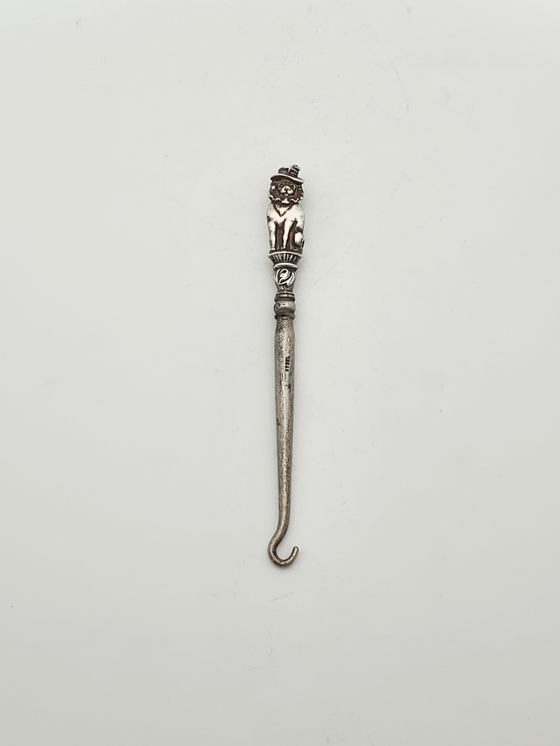 A Lovely Antique Silver Button Hook with a finely detailed finial featuring a seated lion wearing a hat, adding a nice touch of personality and humour to the piece. Hallmarked for Birmingham, 1907.