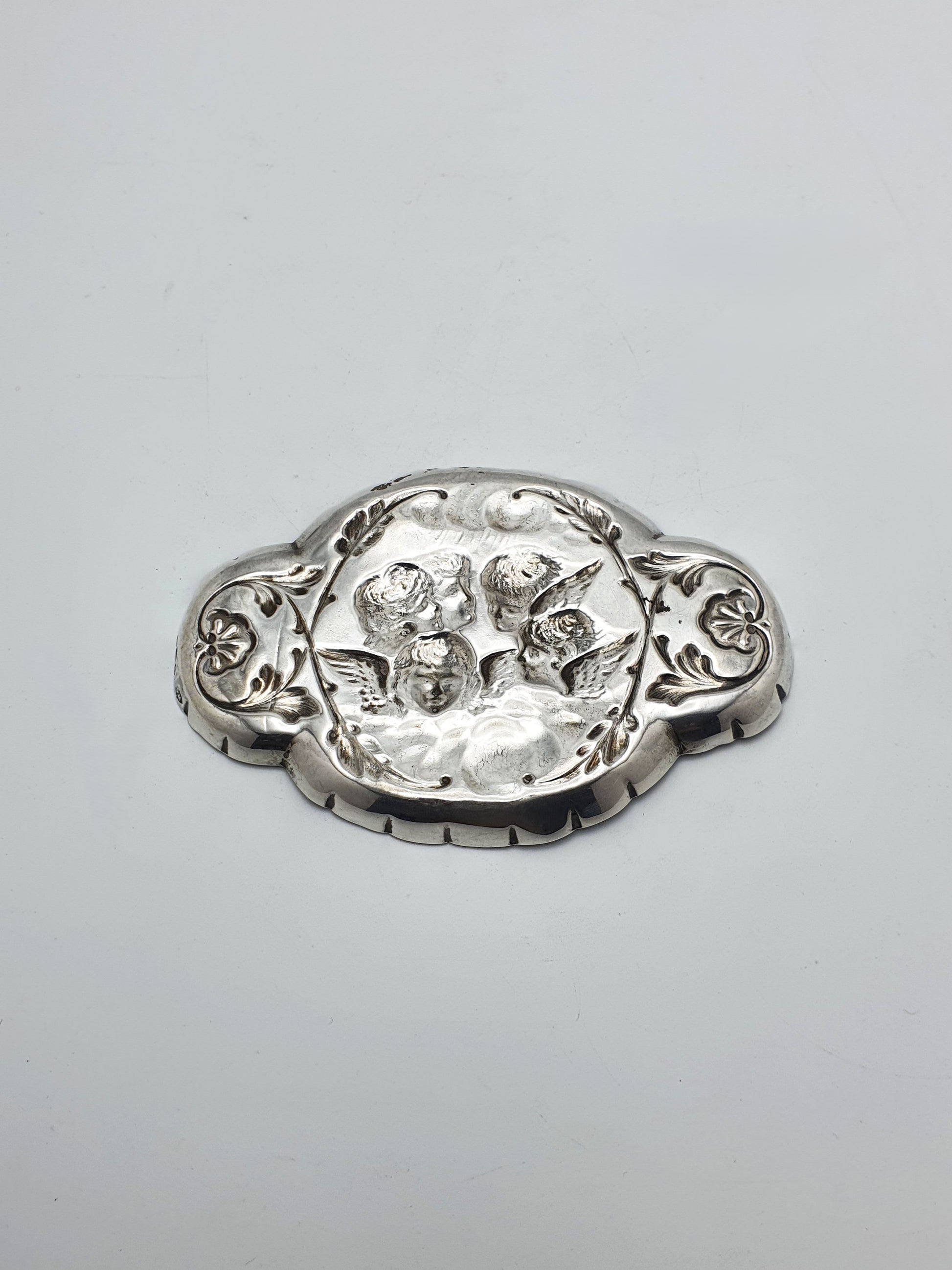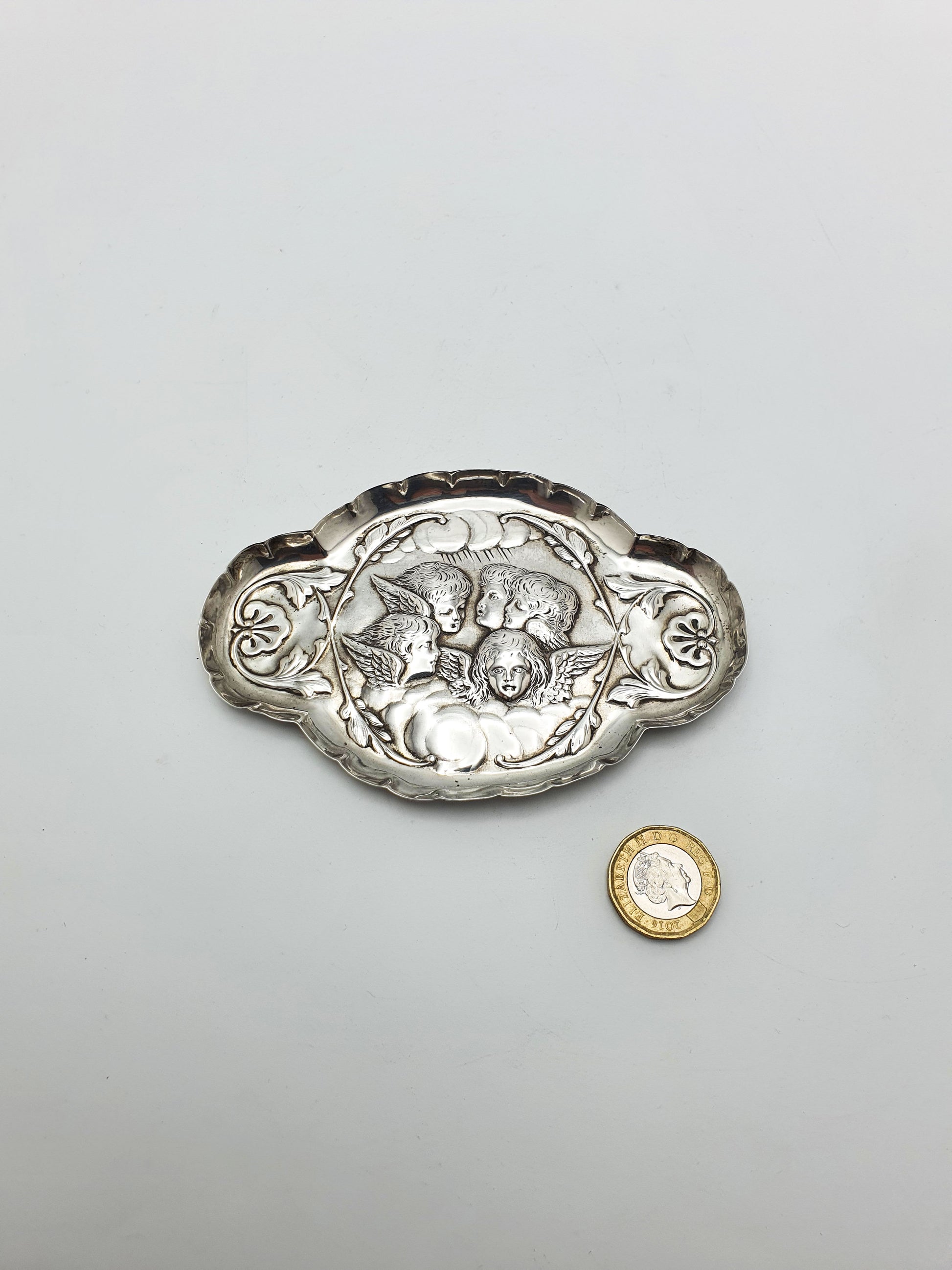 A Lovely Antique Silver Romantic Revivalist Cherub Dish. At the heart of the dish, three angelic faces with feathered wings emerge from clouds, surrounded by a garland-like oval border. Hallmarked for London, 1896.