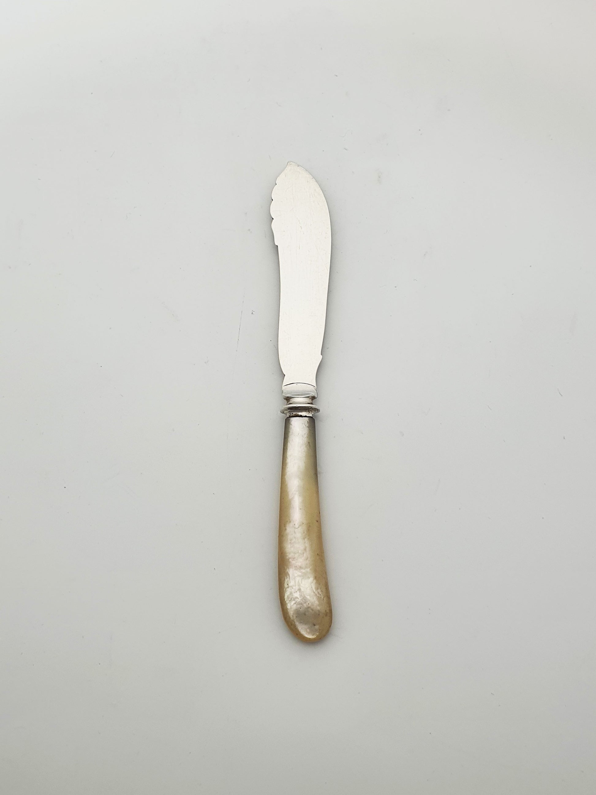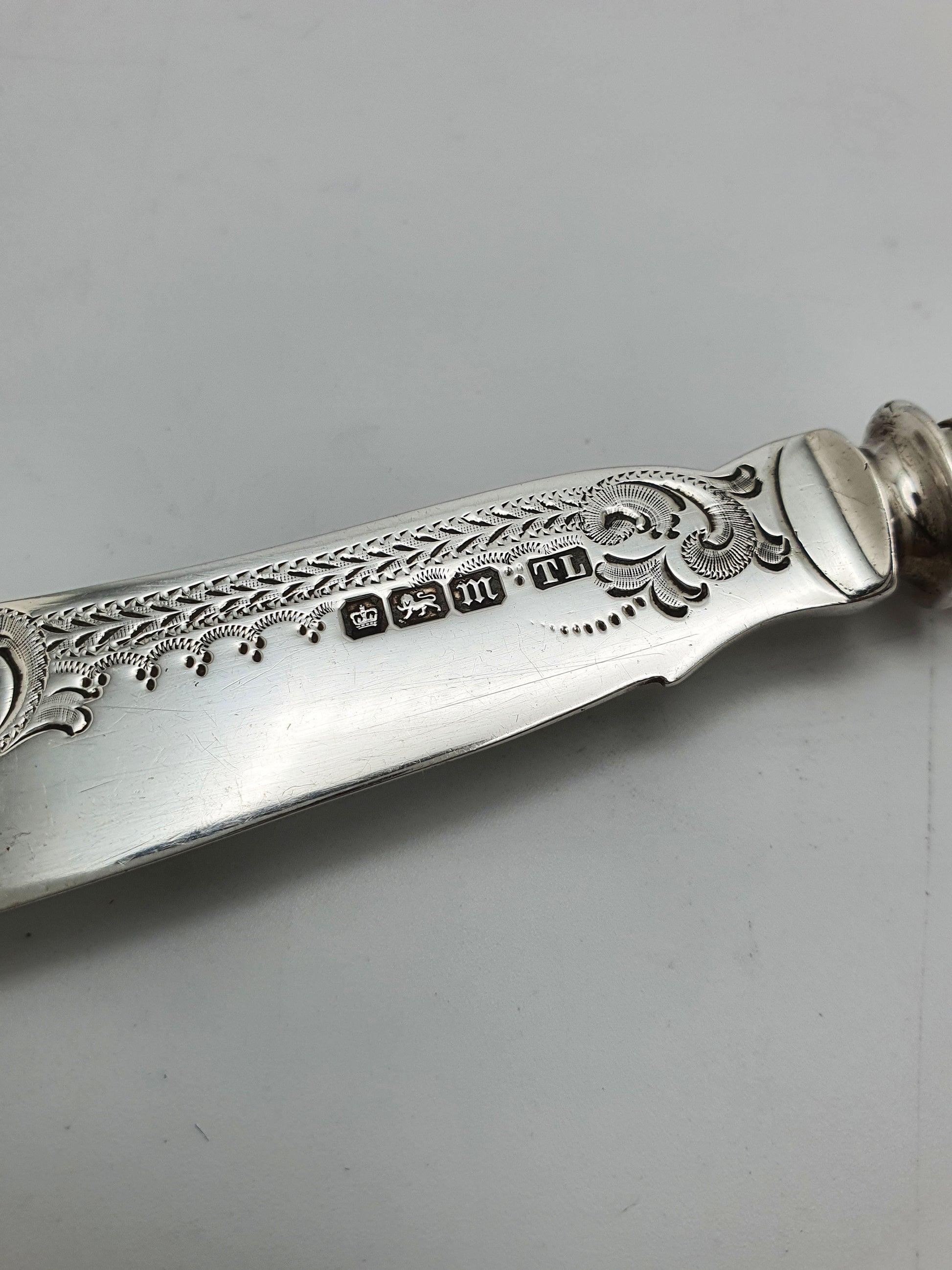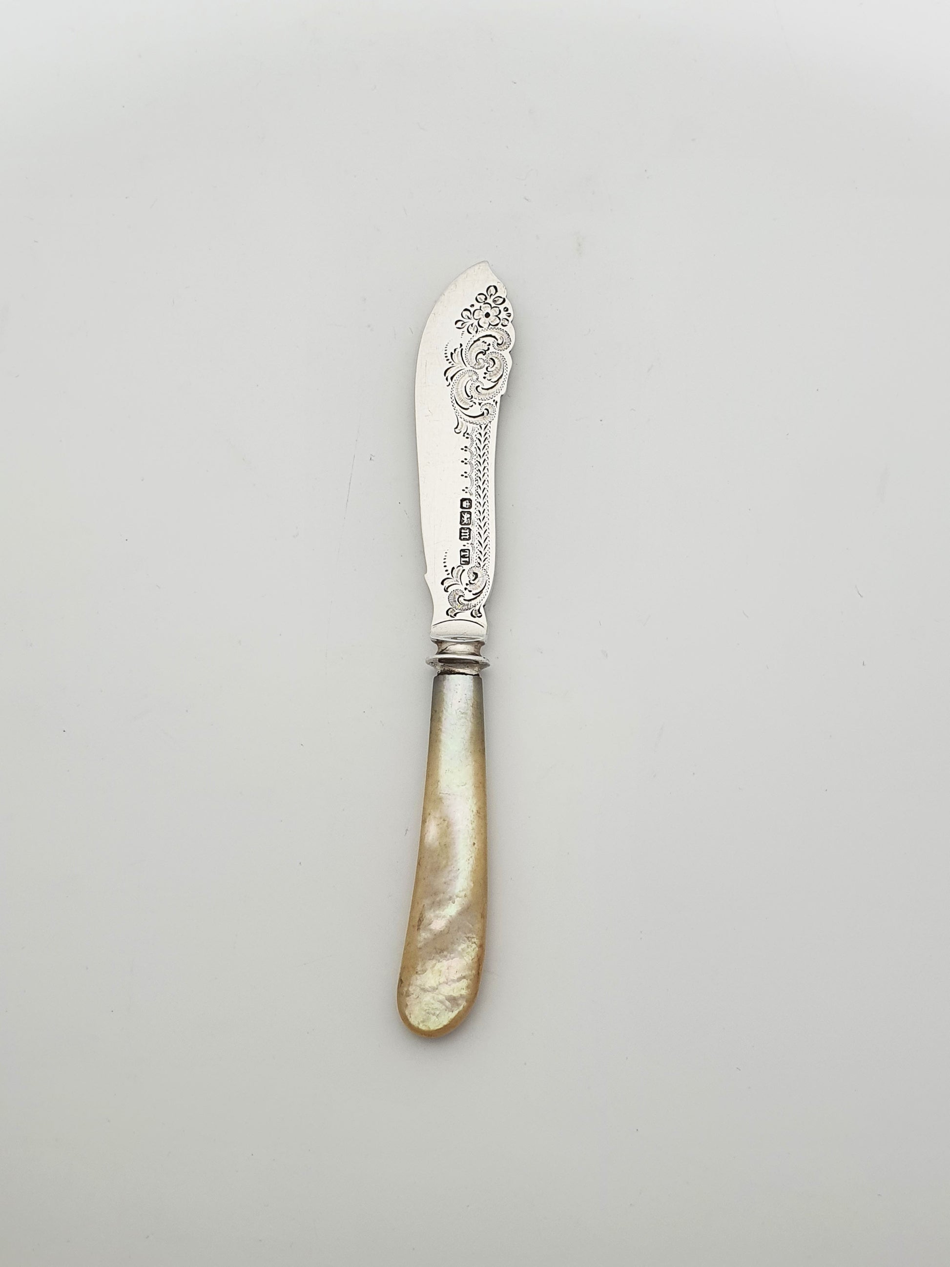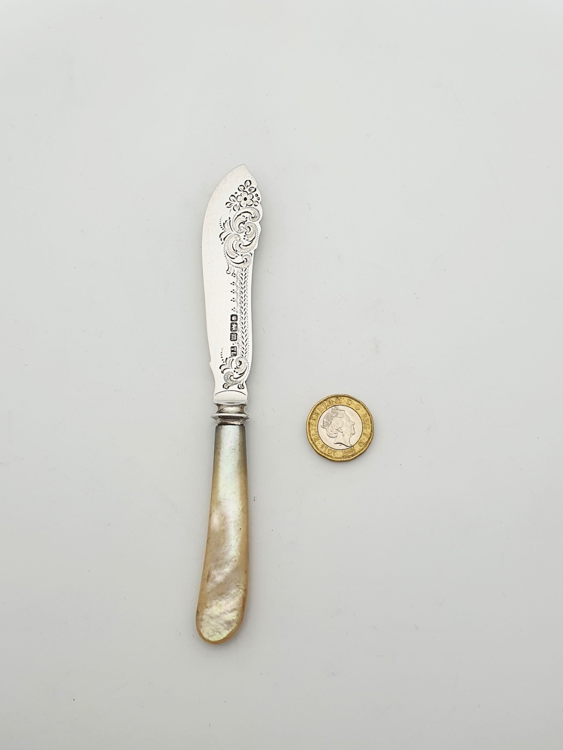 In good condition – The silver blade is free from dents or bends, with clear and legible hallmarks. The etched detailing remains sharp and defined. The mother-of-pearl handle is in excellent condition, with no chips or cracks and a well-aged lustre.