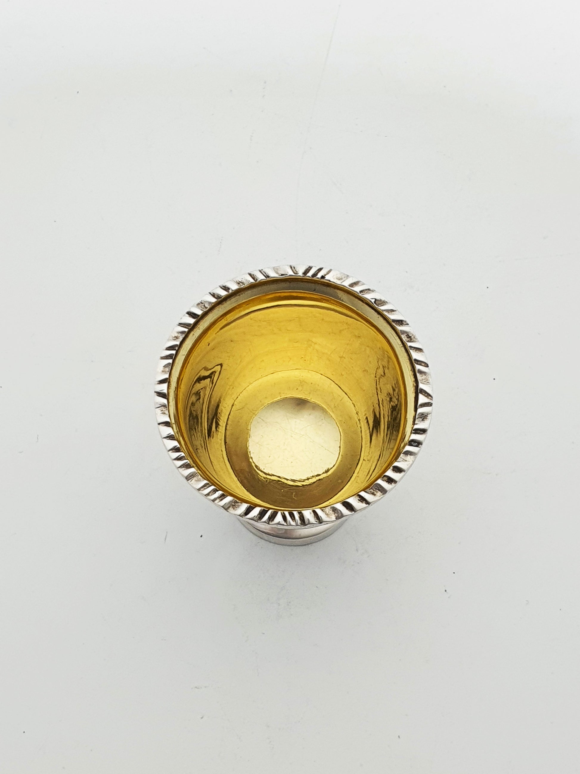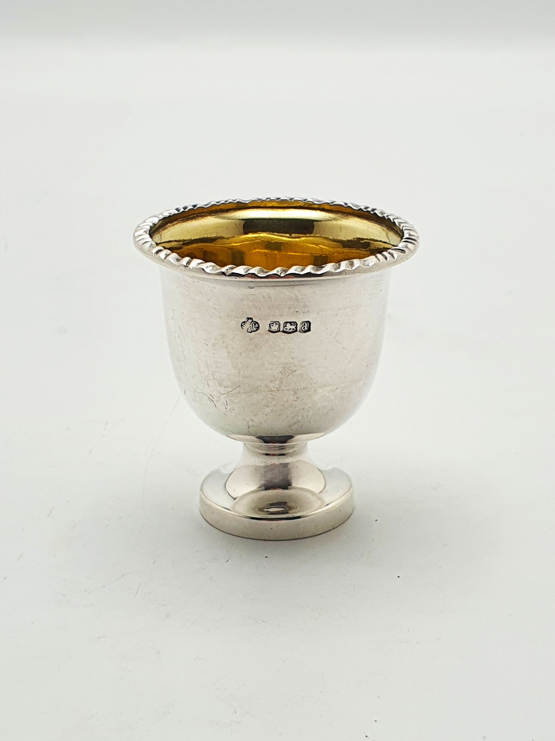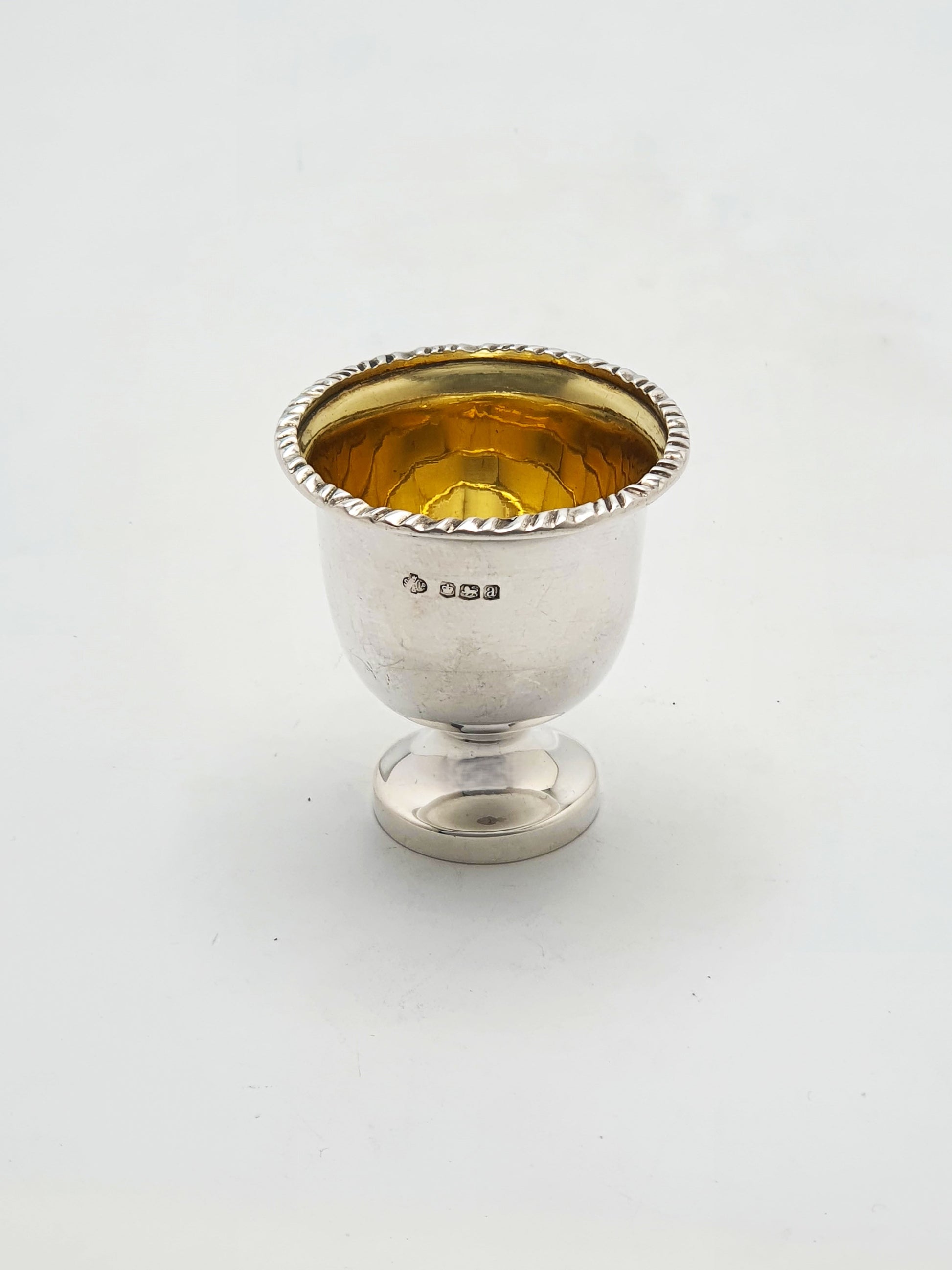 A Lovely Antique Sterling Silver Egg Cup with Gilt Interior and a neat pedestal foot. A twisted rope-style border runs around the rim, giving a crisp decorative finish. The interior is gilded, creating a warm golden contrast to the bright silver exterior. The gilt wash is a traditional detail often used to protect silver surfaces and add visual richness. Hallmarked for Sheffield, 1918.