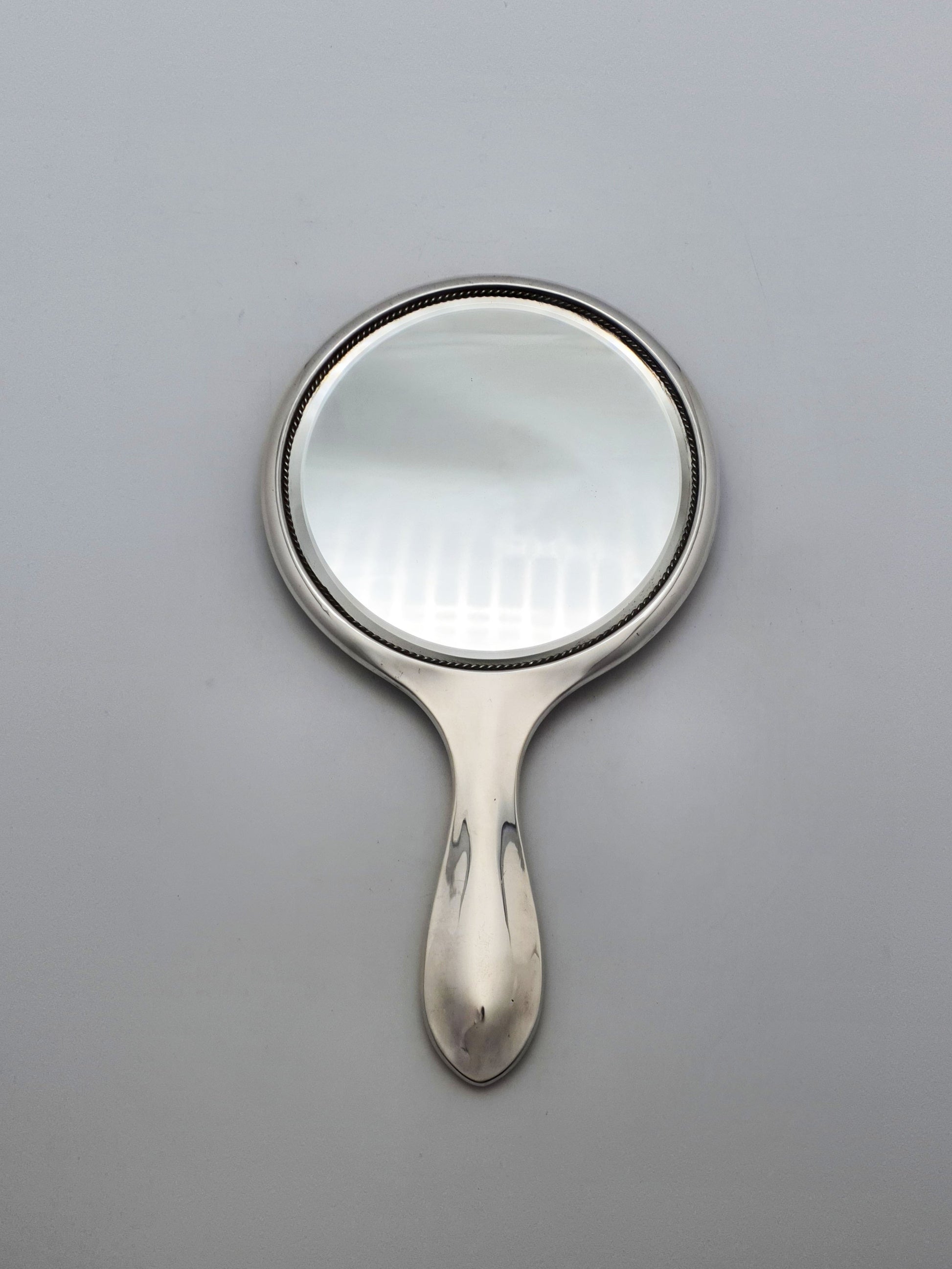 A Lovely Antique Sterling Silver Hand Mirror with delicately embossed foliate cartouche and classic beaded border, this piece is both a functional vanity item and a cherished collectible. Hallmarked for Birmingham, 1912.