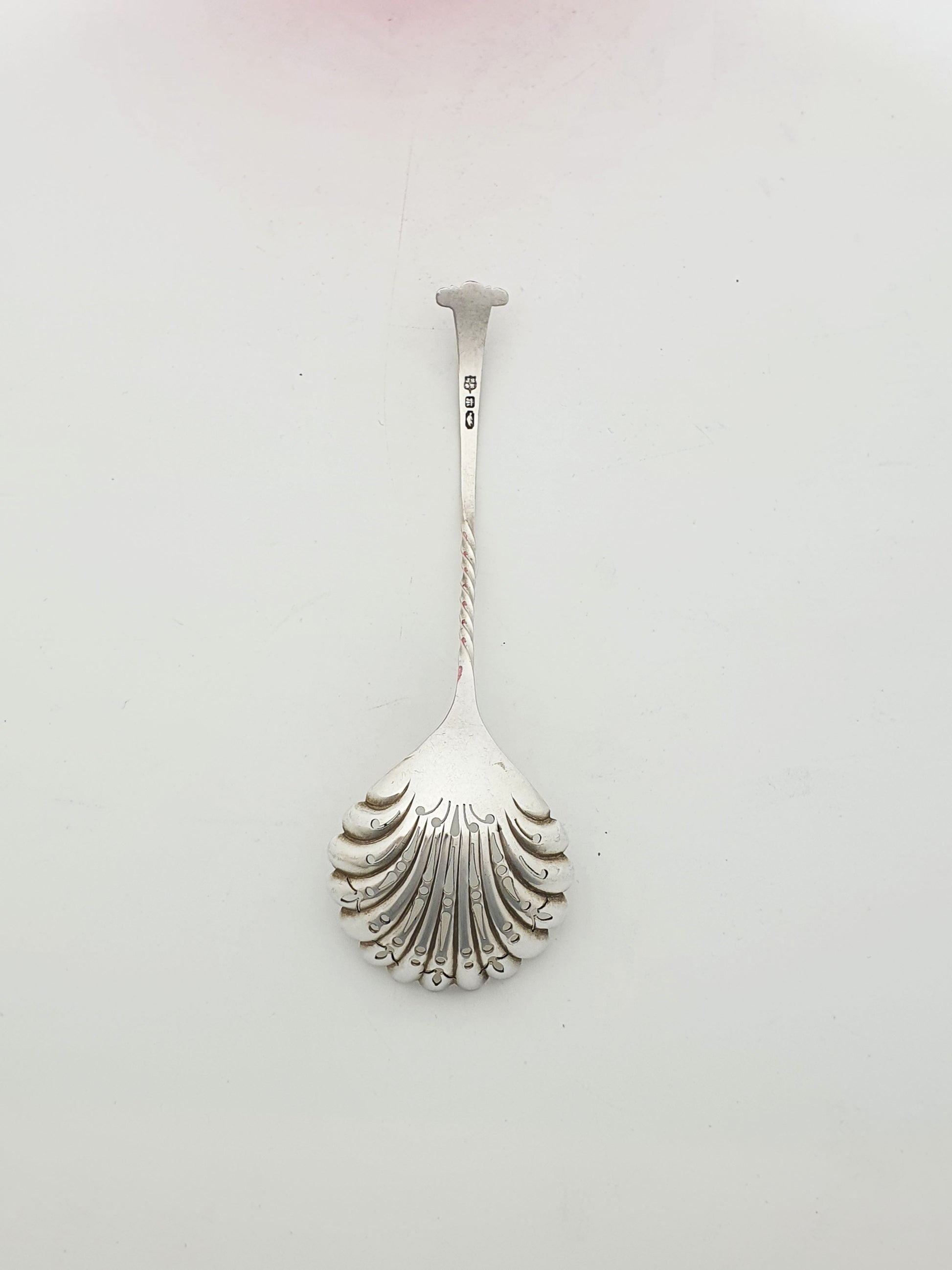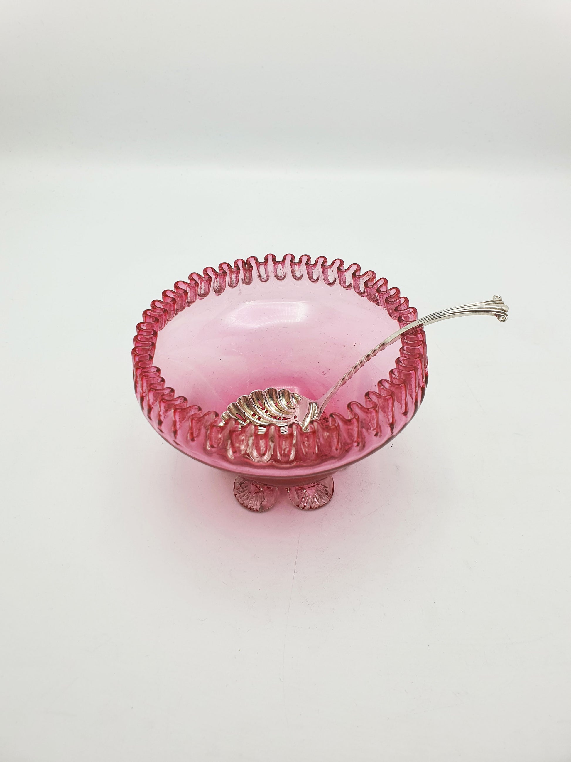 A Lovely Antique Victorian Cranberry Glass Bowl crafted in a delicate pink hue with a distinctive clear ruffled rim. The bowl features a hand-blown construction with visible pontil mark and an ornate, footed base composed of six shell-like glass feet, adding both charm and stability. Accompanying the bowl is an elegant silver plated spoon, designed in a shell form with fine piercing and a twisted handle, topped with a flared, fan-like motif – circa 1890.