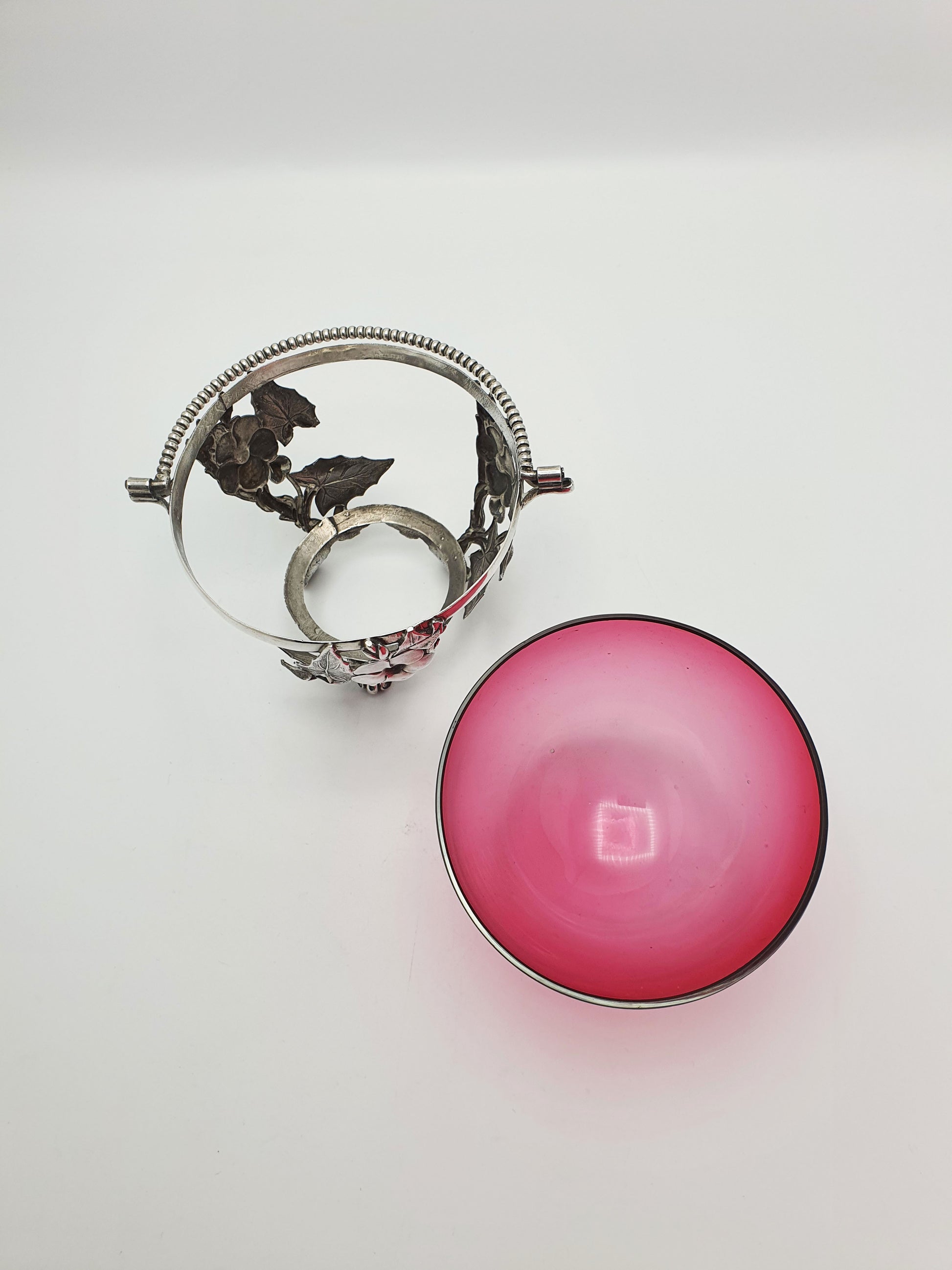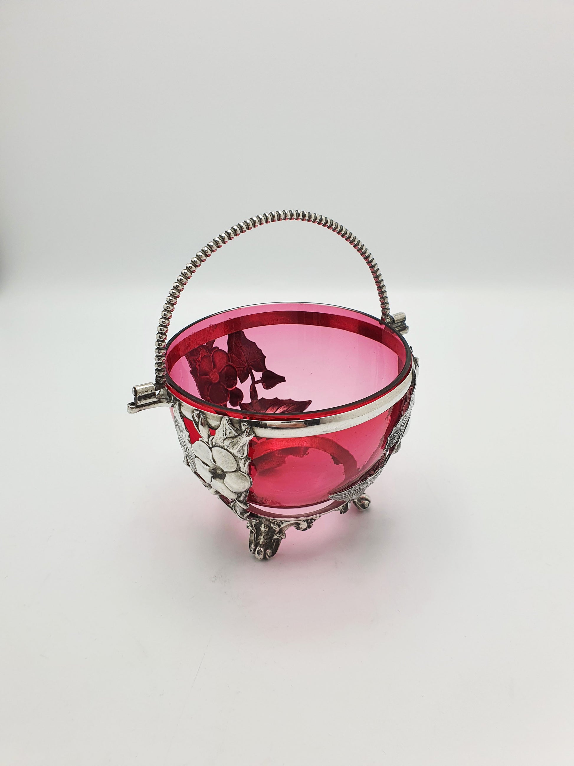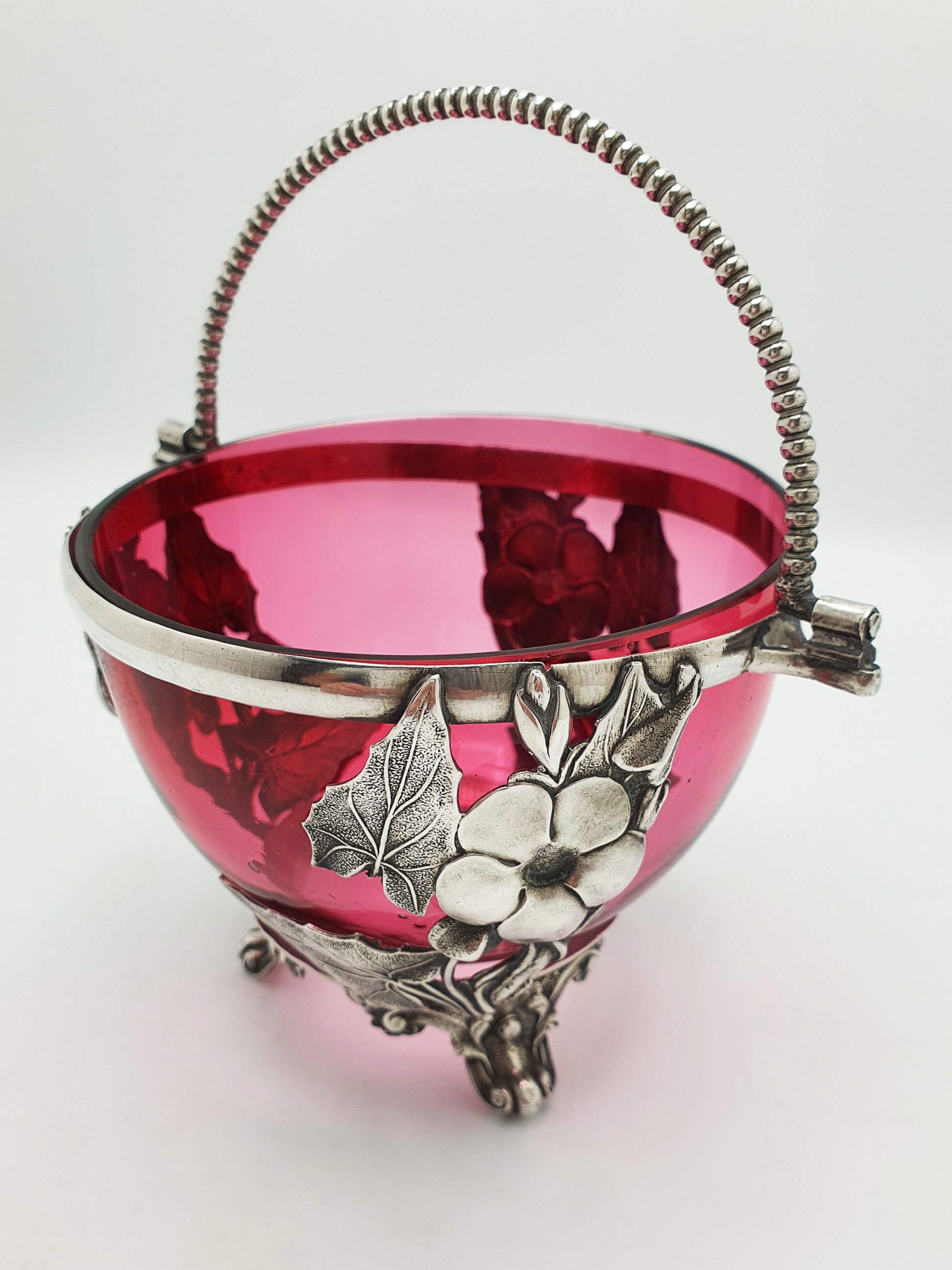 In good condition – Cranberry glass is free from chips, cracks, or repairs. Silver plate frame retains its shine with minor age-related wear and a gentle patina. Handle is secure and moves freely.