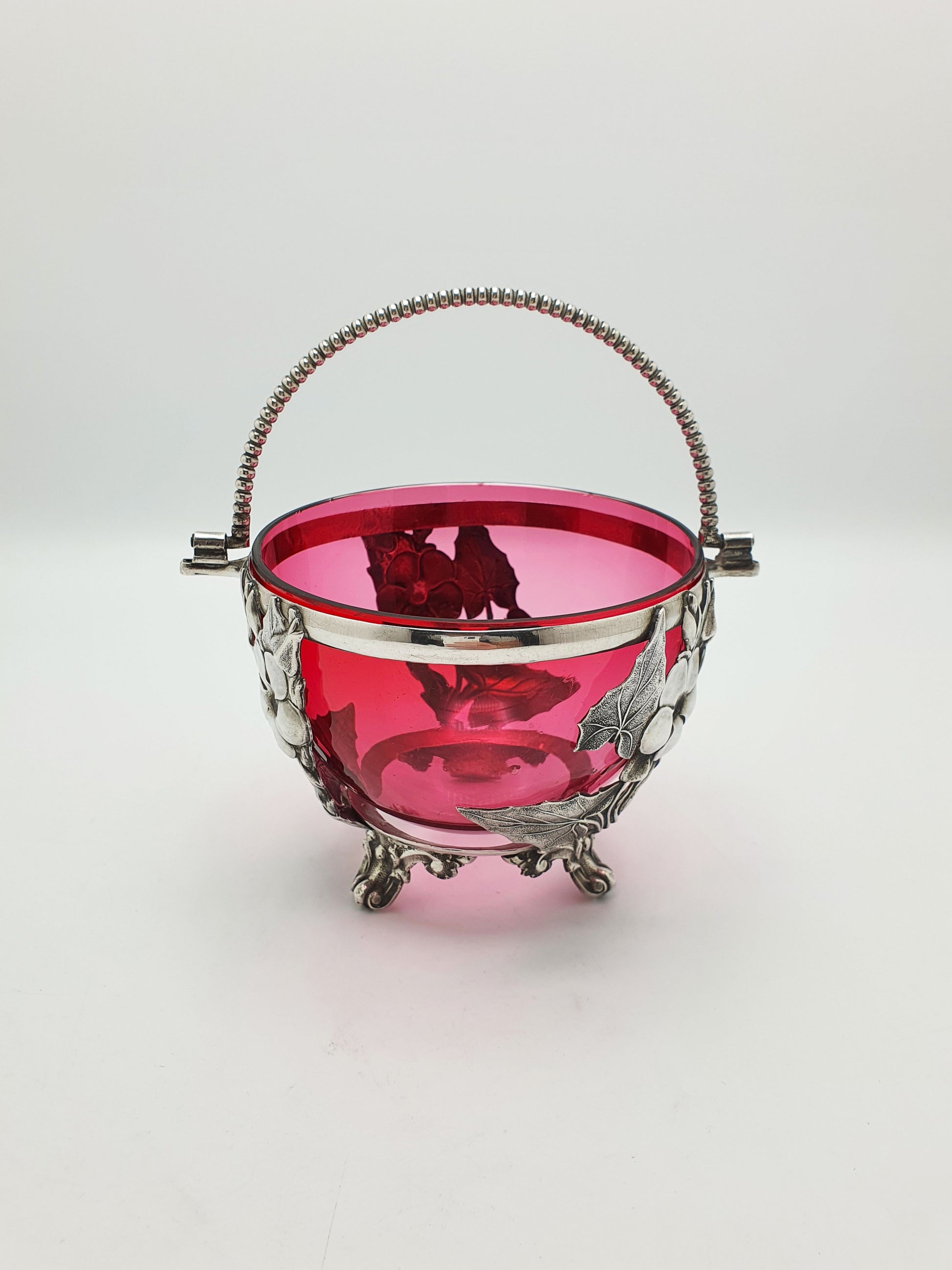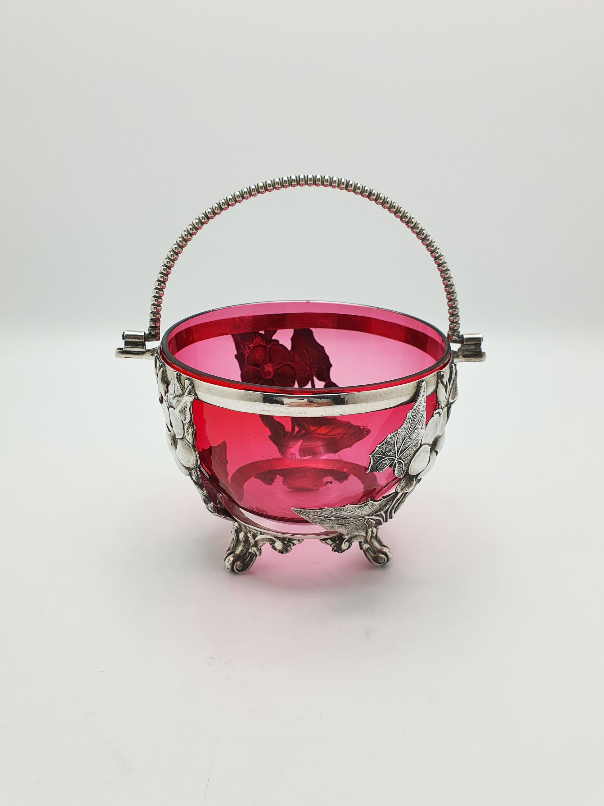 A Lovely Antique Victorian Sugar Bowl featuring an exquisite cranberry glass bowl sitting nestled in an ornate silver plated holder adorned with floral and leaf details. Raised on four decorative feet and topped with a beaded swing handle, this versatile piece blends delicate artistry with refined functionality – circa 1890.