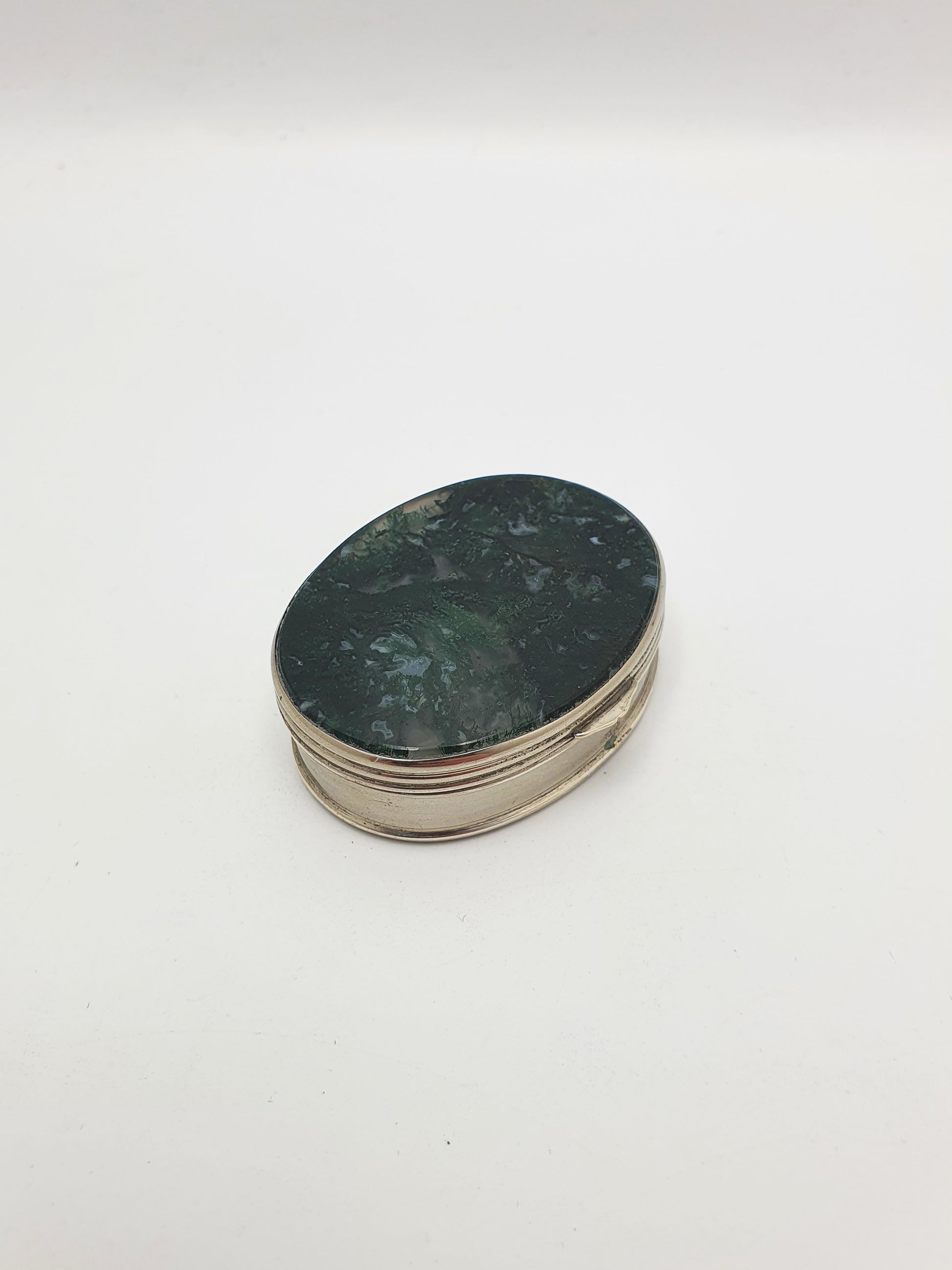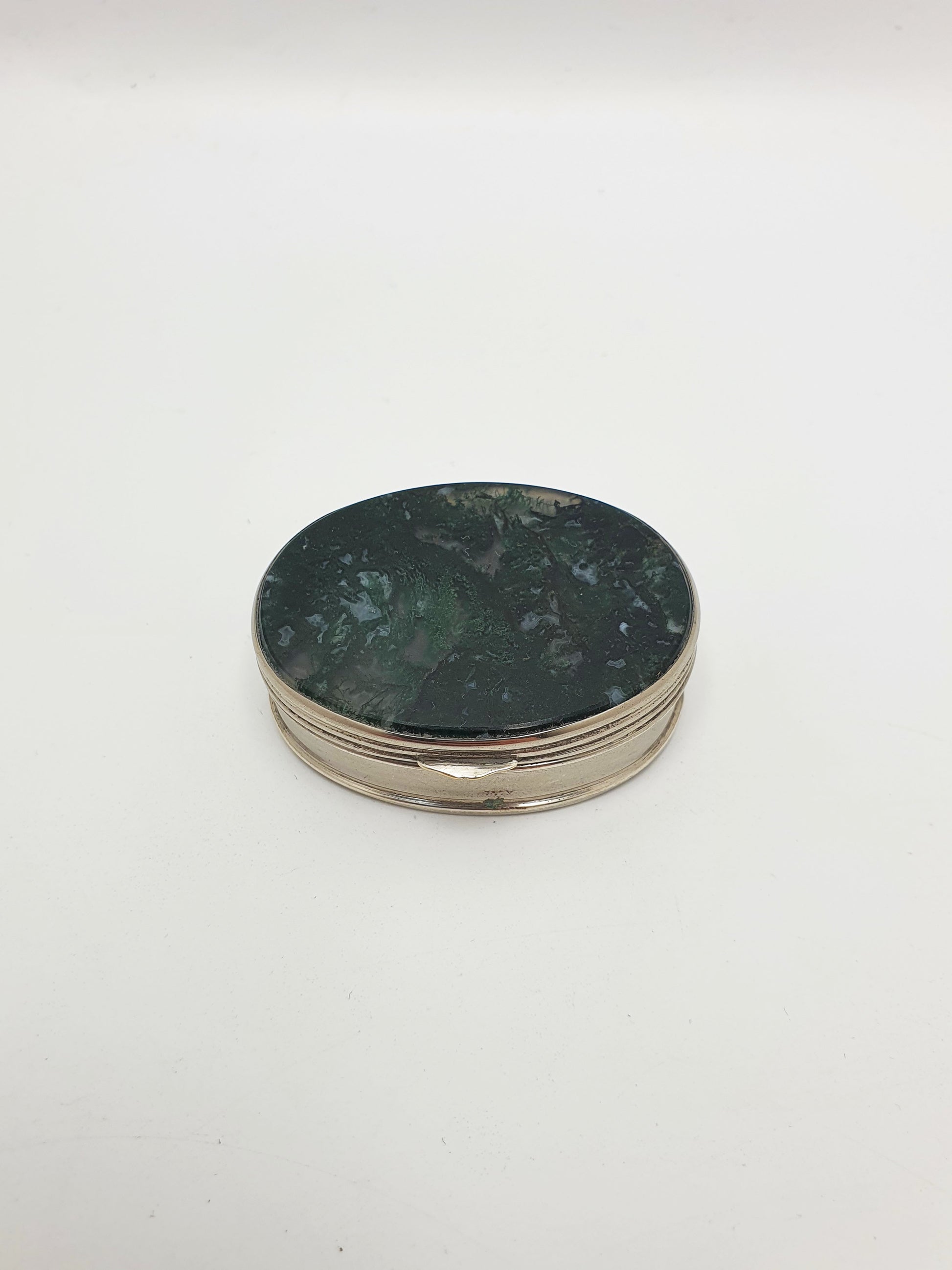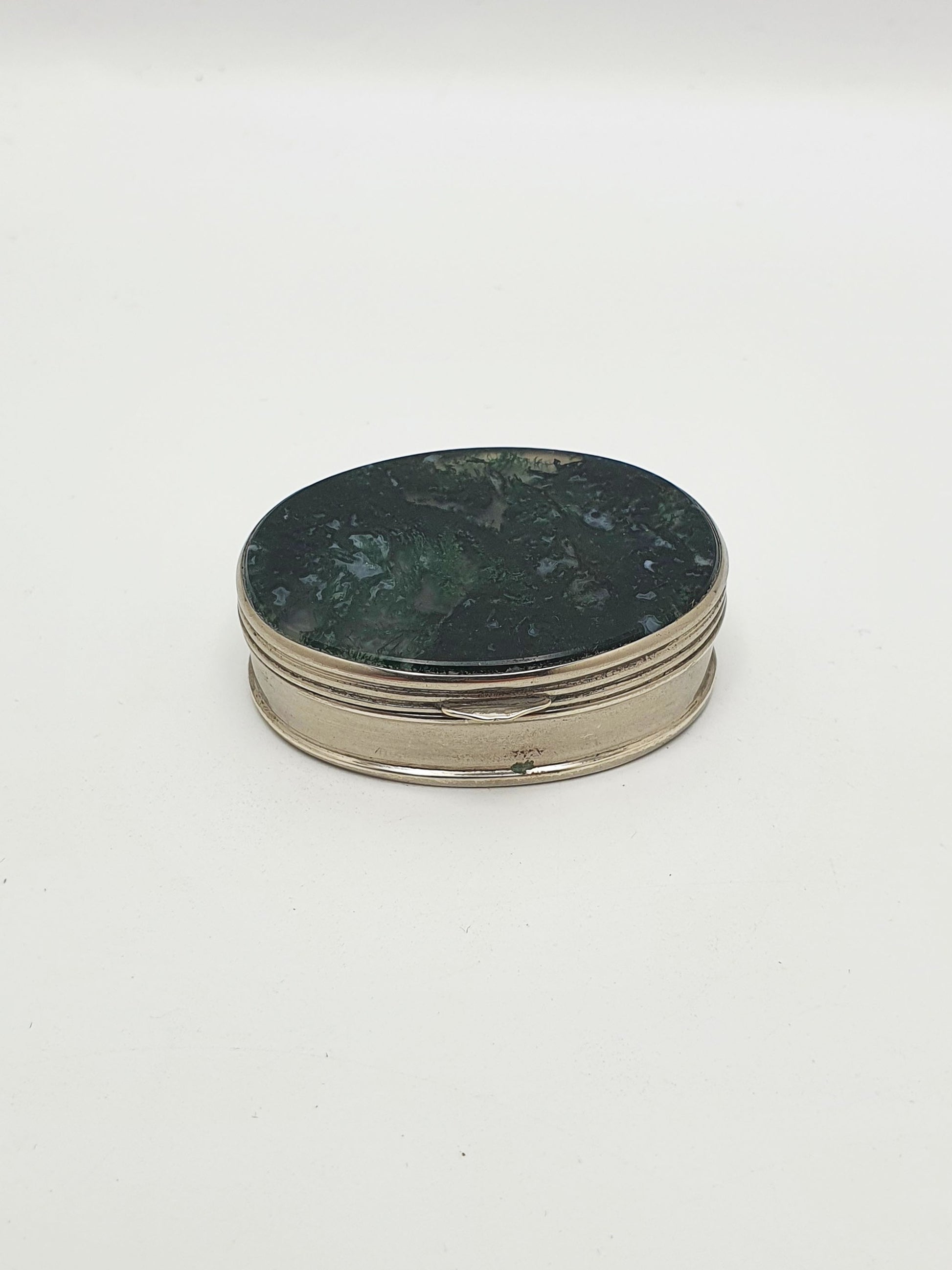 This exquisite oval nickel box is adorned with polished moss agate panels on the lid and base - a natural semiprecious stone known for its rich green, forest-like inclusions that resemble miniature landscapes. Dating to the late Victorian period, this compact and elegant piece would have originally served as a pill box, patch box, or a snuff container for refined personal use – circa 1890.