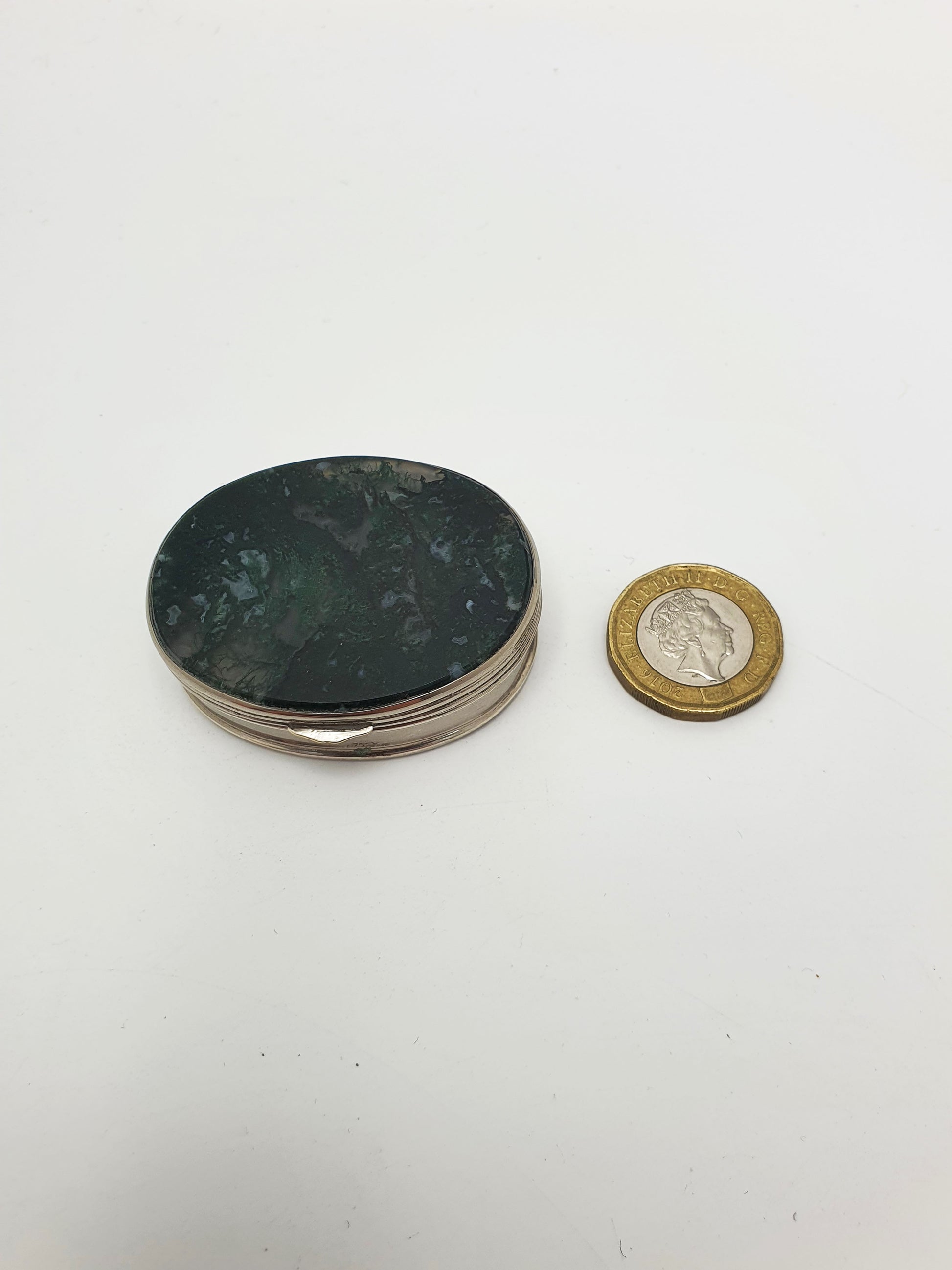 In good condition – Both moss agate panels are intact, with no chips or cracks. The natural veining and inclusions are well-preserved and show strong colour contrast. The lid opens and closes securely. Hinge functions smoothly without looseness.