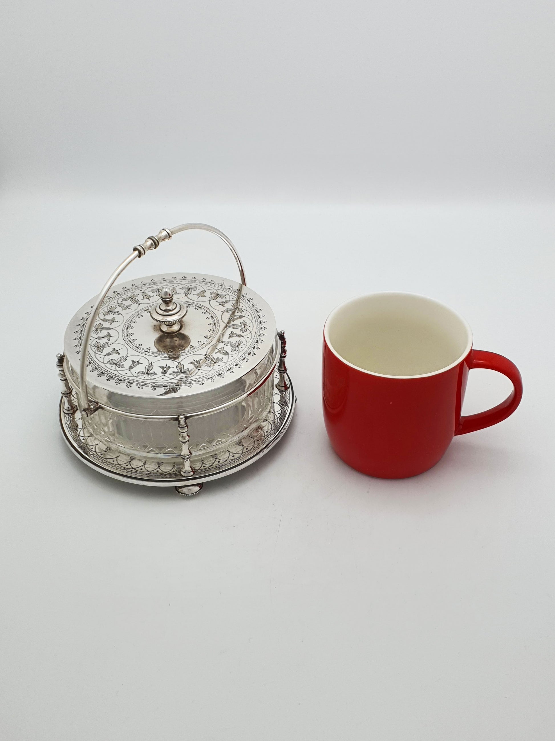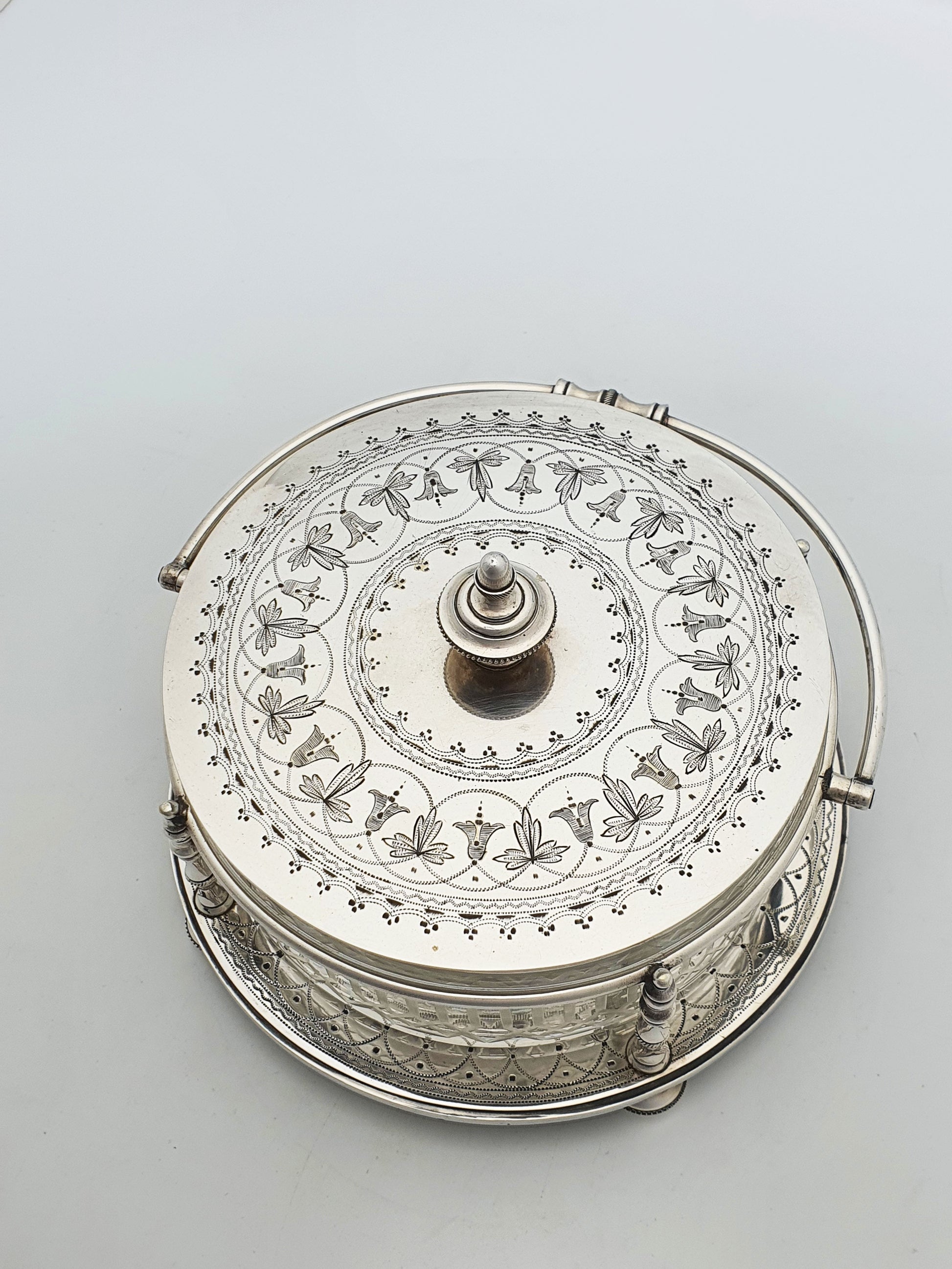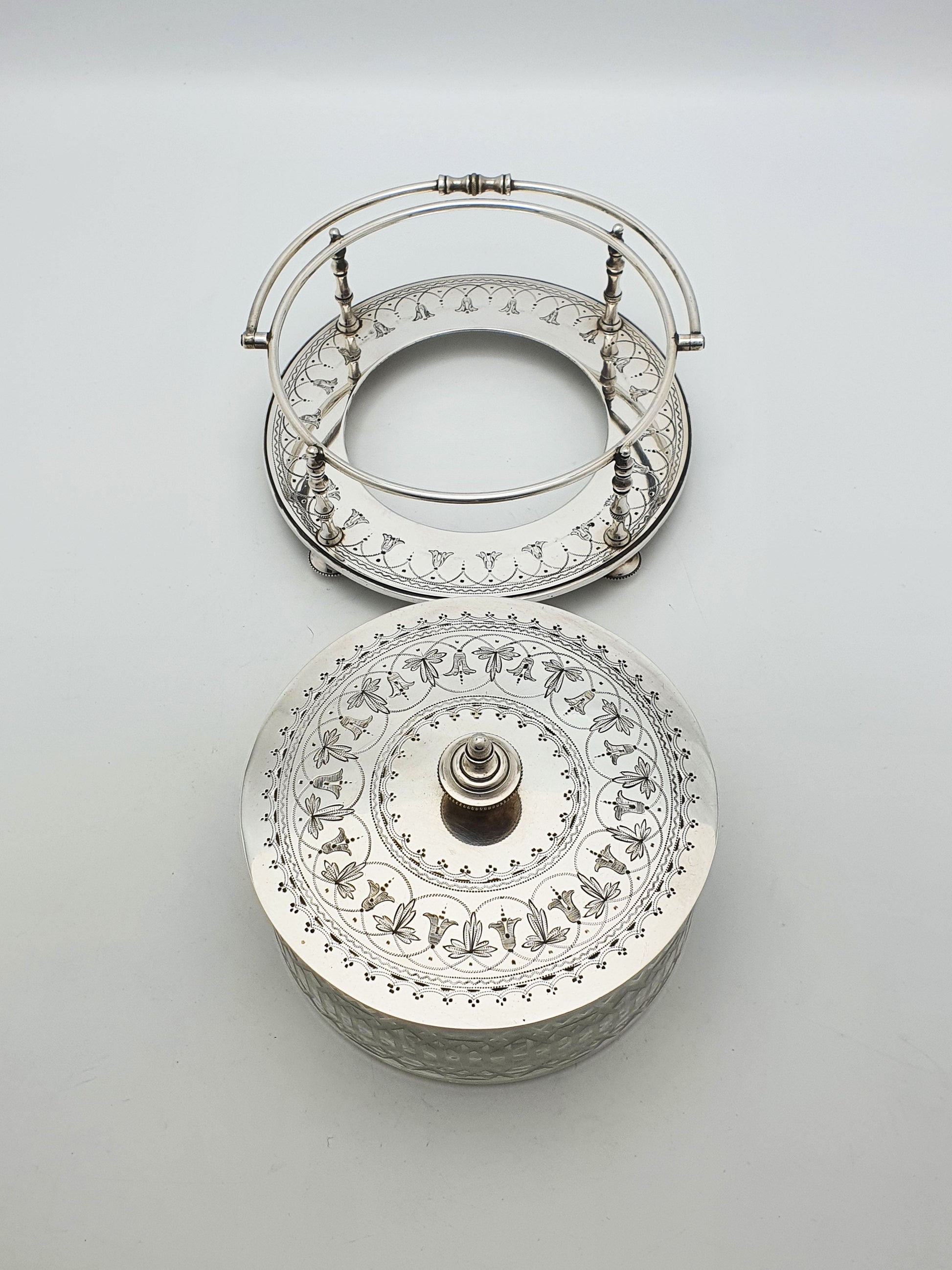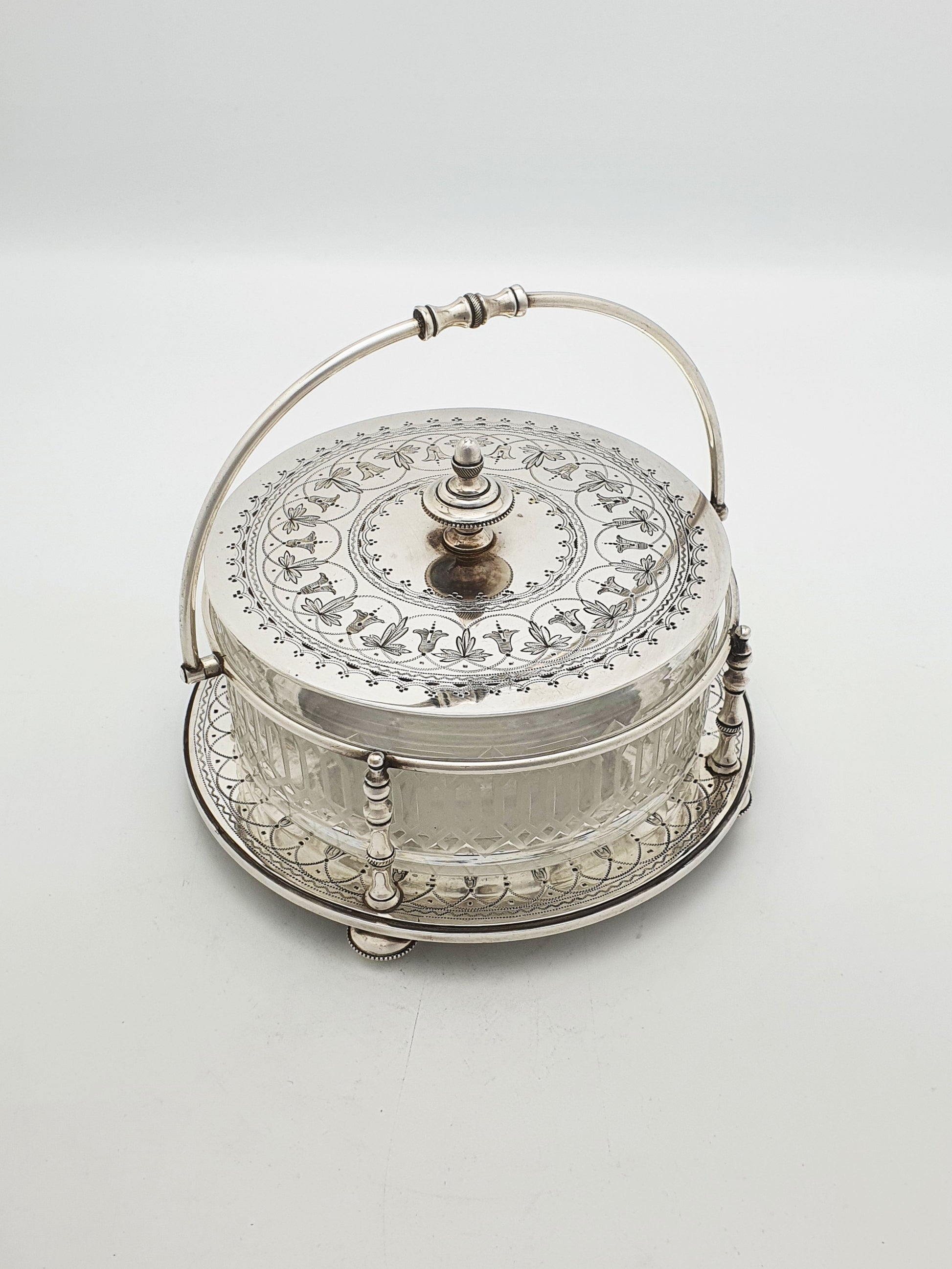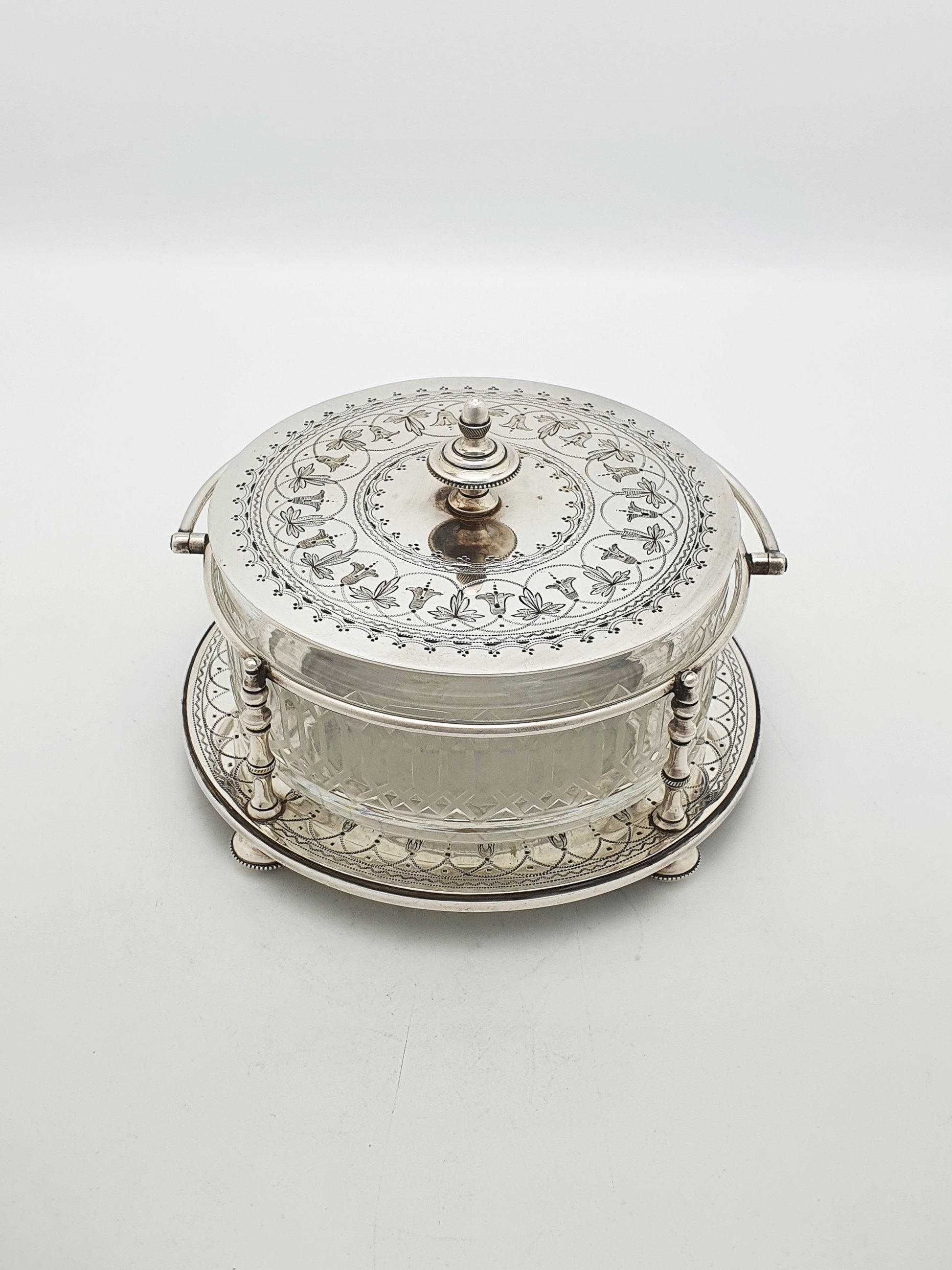 A Lovely Antique Victorian Serving Dish featuring a deep-cut glass bowl, finely engraved silver plate lid, and a decorative silver plate stand with a swing handle. It would have originally been used for a variety of table service needs - from sweet treats to condiments or side dishes – circa 1880.