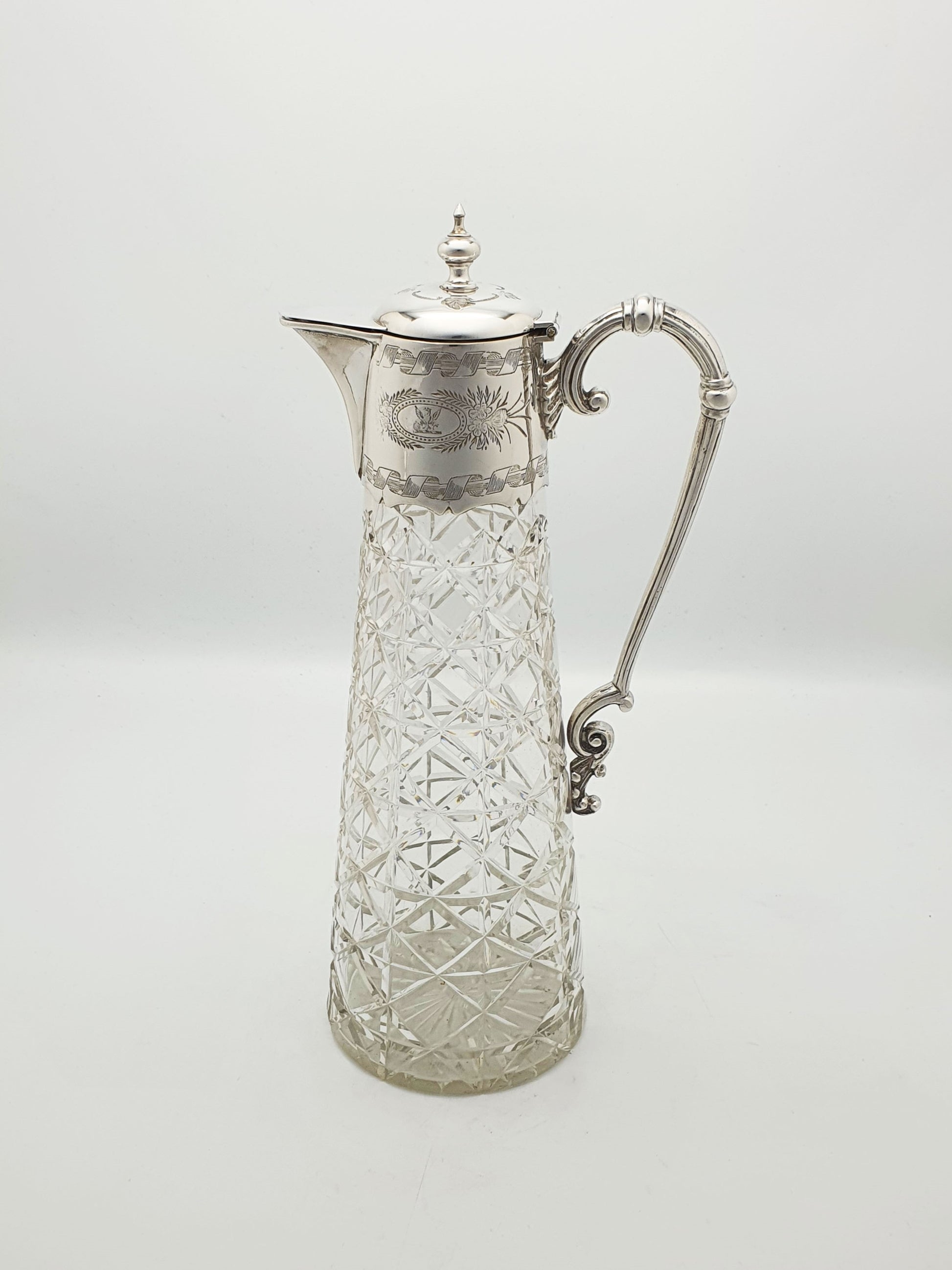 A Lovely Antique Victorian Claret Jug featuring a tapering conical body with a deep shaped diamond pattern, the jug is crowned with a hinged silver plated lid, ornate finial, and a beautifully cast handle - all hallmarks of classic late 19th-century craftsmanship. The silver plate mount is finely engraved with floral and foliate scrollwork and a central cartouche featuring a Pheonix Crest on one side and initials on the other – circa 1880.