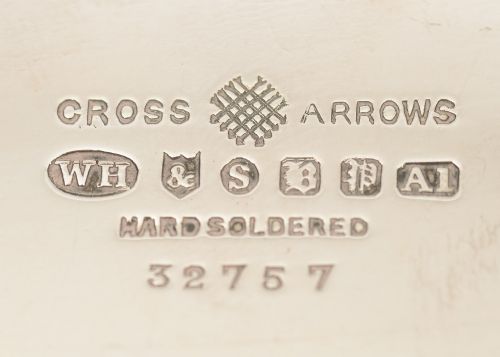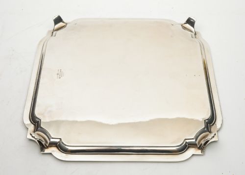 A Lovely Art Deco Silver Plated Salver of square design with molded chamfered corners and stands of four feet. Made by William Hutton & Sons Sheffield England. Circa 1930 FREE Worldwide & UK Delivery Measurements Height 1 1/2 ( approx 3.75 cm ) Length 14 ( approx 35 cm ) Width 14 ( approx 35 cm ) Weight 1500 g In good condition - any dark areas are just a reflection from the photography - there are no scuffs or marks to the plate