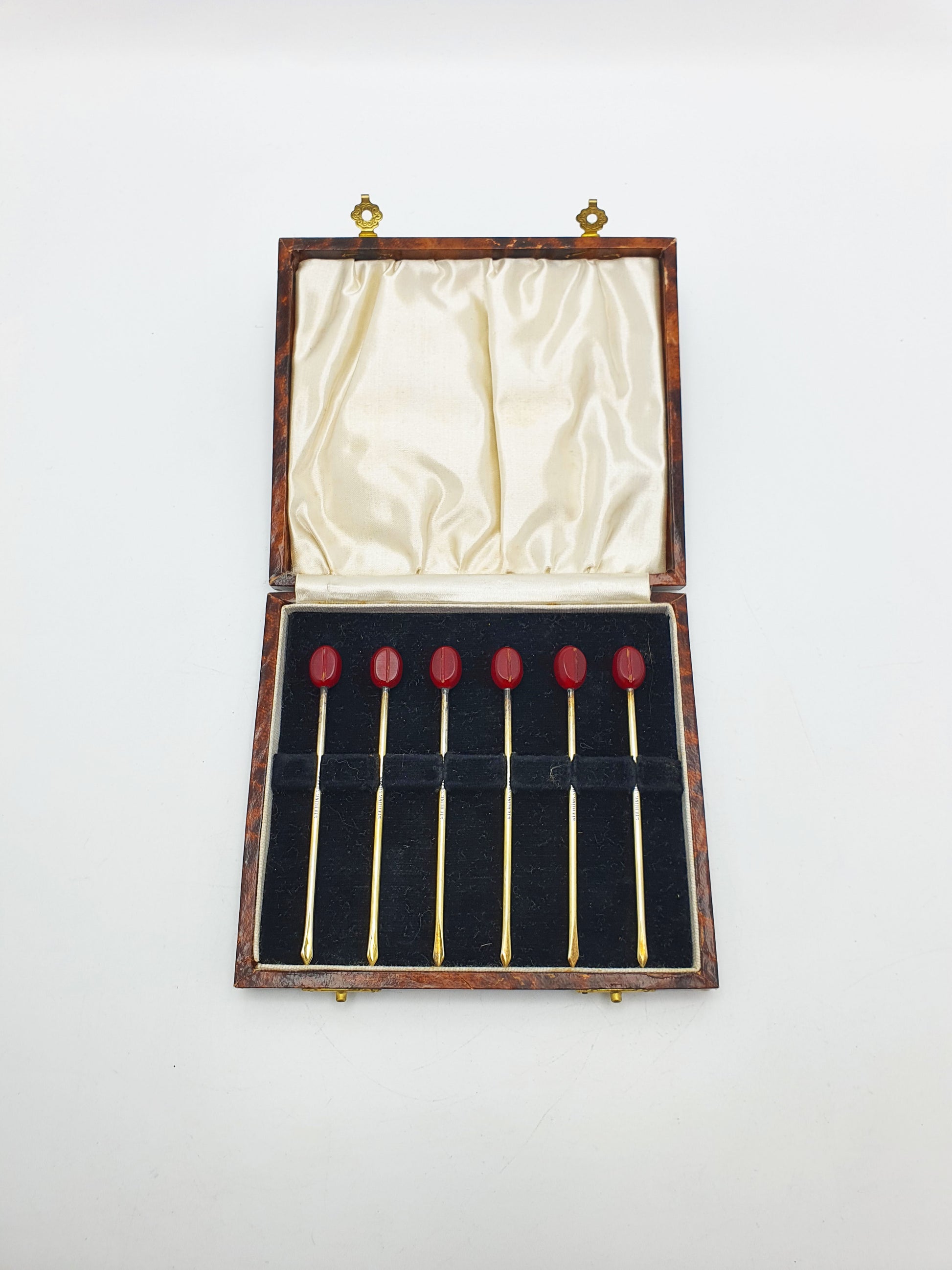 A Lovely Boxed Set of Antique Cocktail Sticks featuring elegant sterling silver-gilt shafts capped with coffee bean shaped, cherry-red bakelite finials. Each stick is marked “Sterling Silver” and retains a warm gold-toned finish, adding richness and warmth to the overall look. This set come in their original fitted case – circa 1920.
