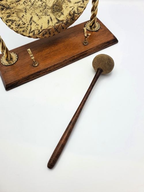 Lovely Edwardian Brass and Oak Dinner Gong with barley twist brass supports a hand wrought brass gong and an oak handled striker - 1905. *This dinner gong makes a really nice sound! Measurements: Height: 13 1/2 (approx. 34.5cm) Width: 14 1/2 (approx. 36cm) Depth: 5 (approx. 12.5cm) Total weight: 2790g In good condition.