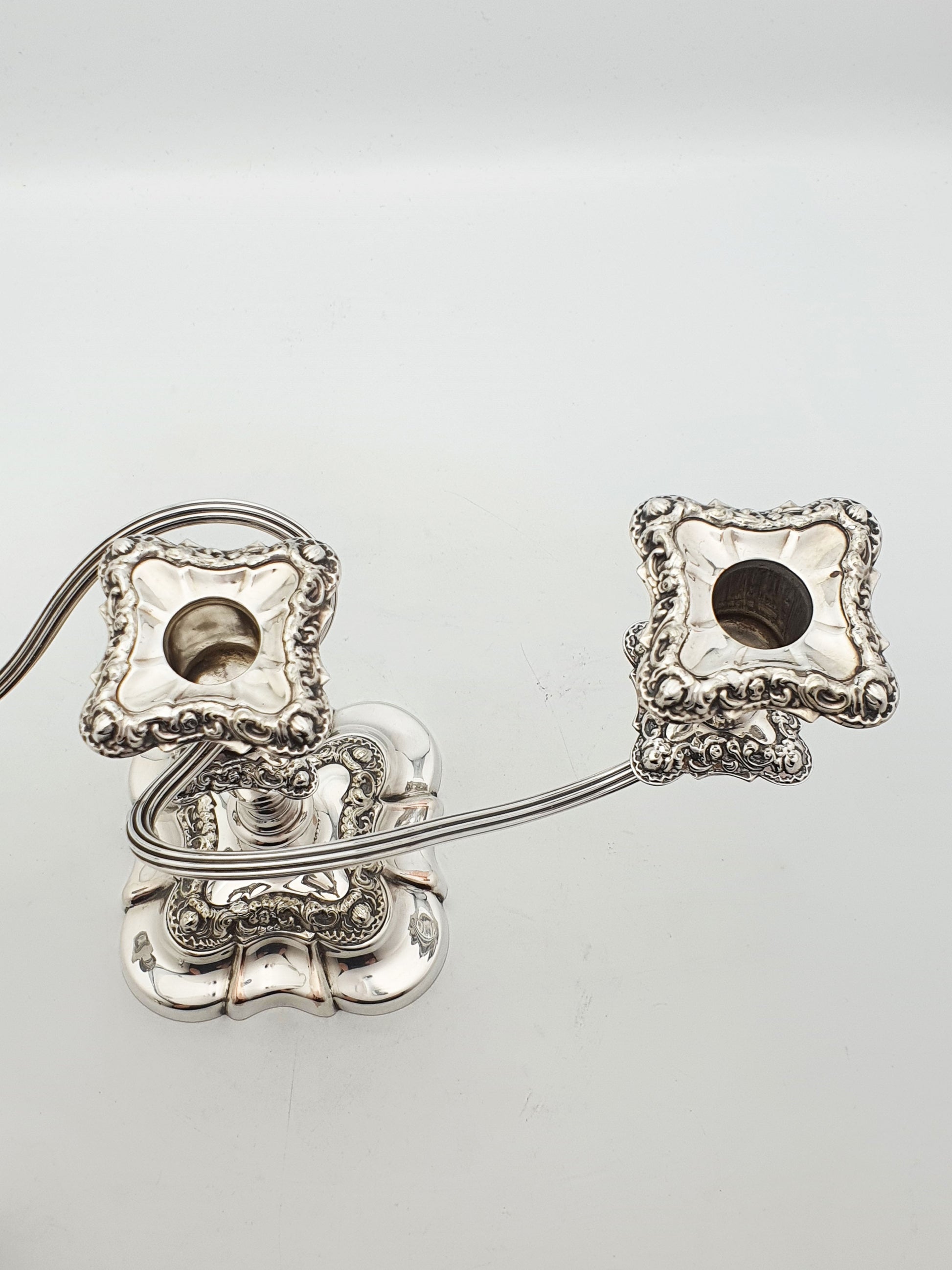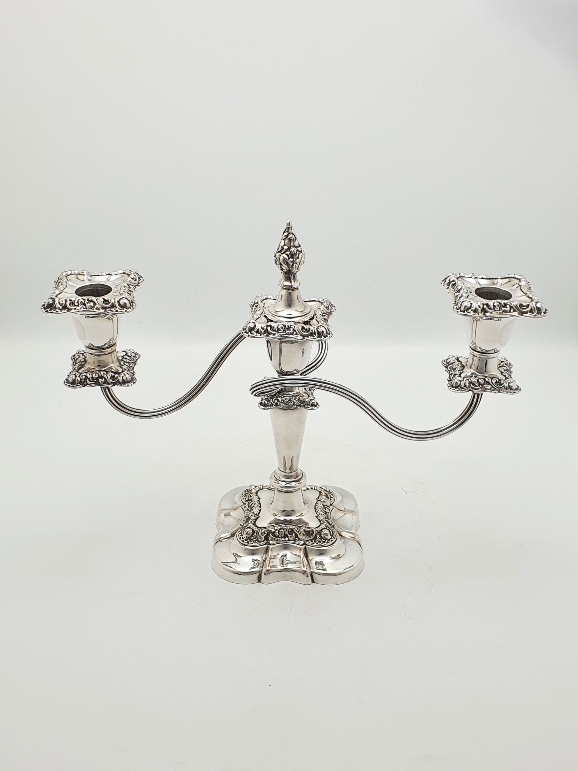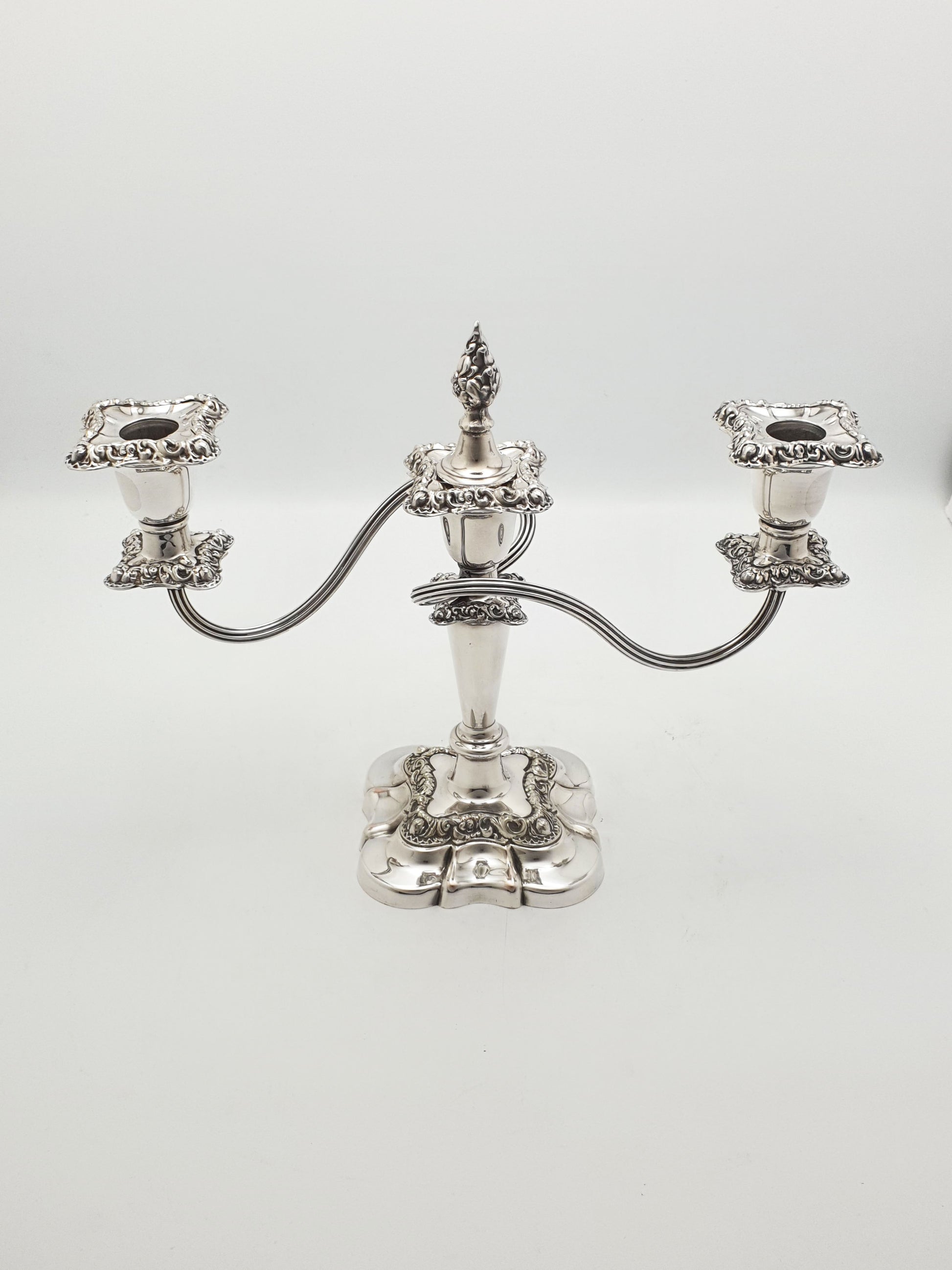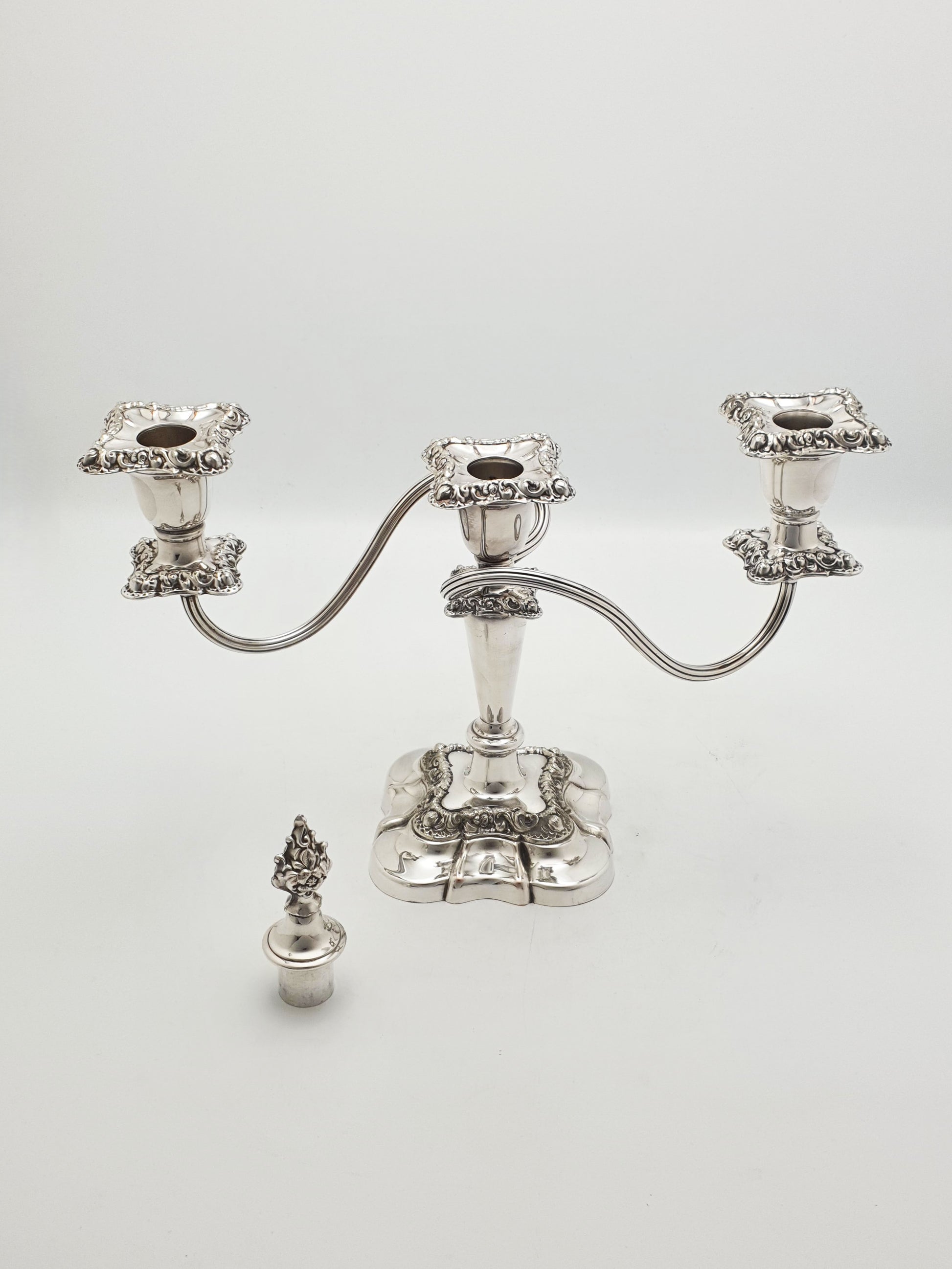 Excellent overall condition. Silver plate retains high polish with some wear through to the copper. All removable sconces and finials present and fit securely.
