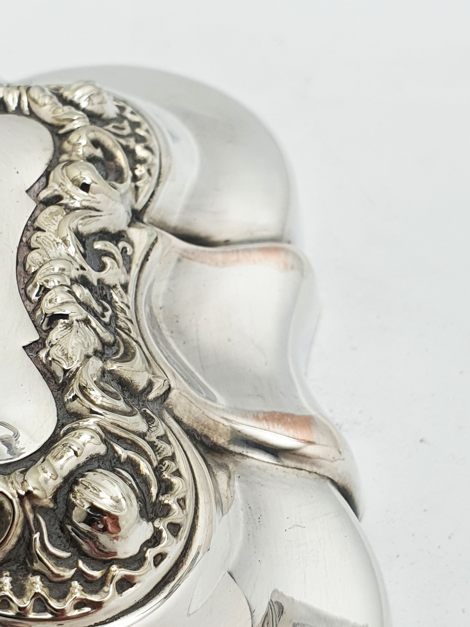 A Lovely Pair of Antique Three-Light Candelabra by the renowned British silversmiths Mappin & Webb, featuring ornate Rococo-inspired detailing and removable flame snuffers. These decorative centrepieces exemplify the firm’s tradition of refined craftsmanship and timeless design. Each candelabrum is crafted with a baluster-shaped central stem, from which two gently sweeping branches extend, supporting a total of three candle sconces per piece. Where the silver has gently worn, the underlying copper peeks through, lending a rich warmth that only adds to the piece’s antique charm.