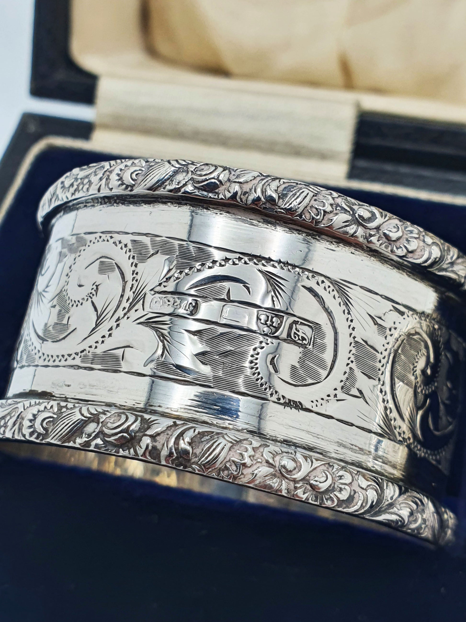 A Lovely Pair of Edwardian Sterling Silver Napkin Rings, hand engraved with scrolling foliage and ornate borders. Both napkin rings have vacant cartouches and come in a silk and velvet lined box. Hallmarked for Chester, 1906.