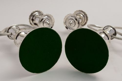 A pair of elegant Victorian candelabra with attractive bow shaped connecting arms. Circa 1880. Height 10 Base circumference 4 1/2 and from sconce to sconce is 12. They are in immaculate condition and would grace any fine table.