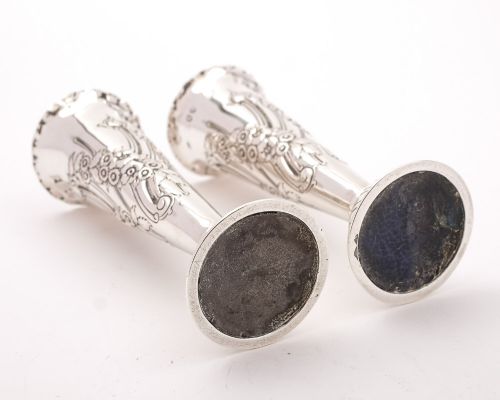 A lovely pair of Victorian Silver posey vases with weighted bases and flared tops with embossed floral decoration to sides. Hallmarked London 1895 FREE UK & worldwide delivery o most destinations Measurements: Height: 5 ” (approx. 12.5 cm) Diameter: 2” (approx 5cm) Total weight: 380 g In good condition - any dark areas are shadows from the photography there is no damage to the silver
