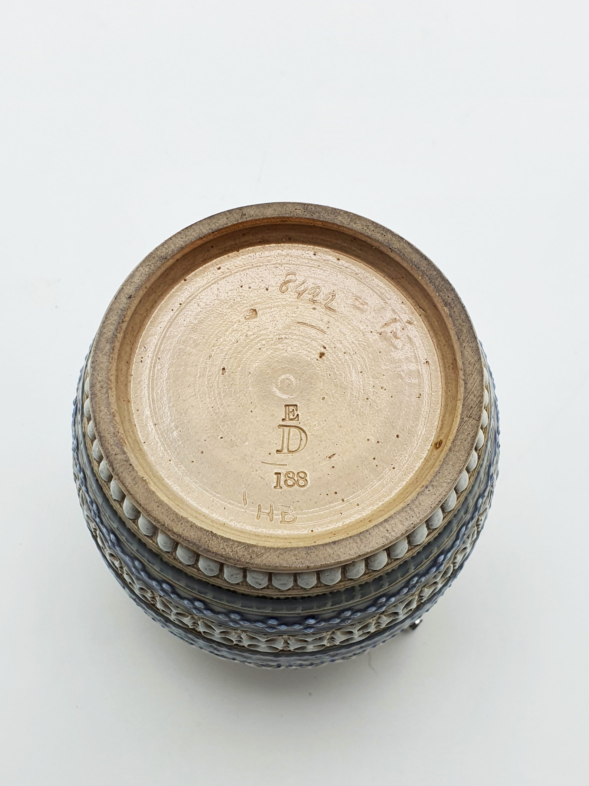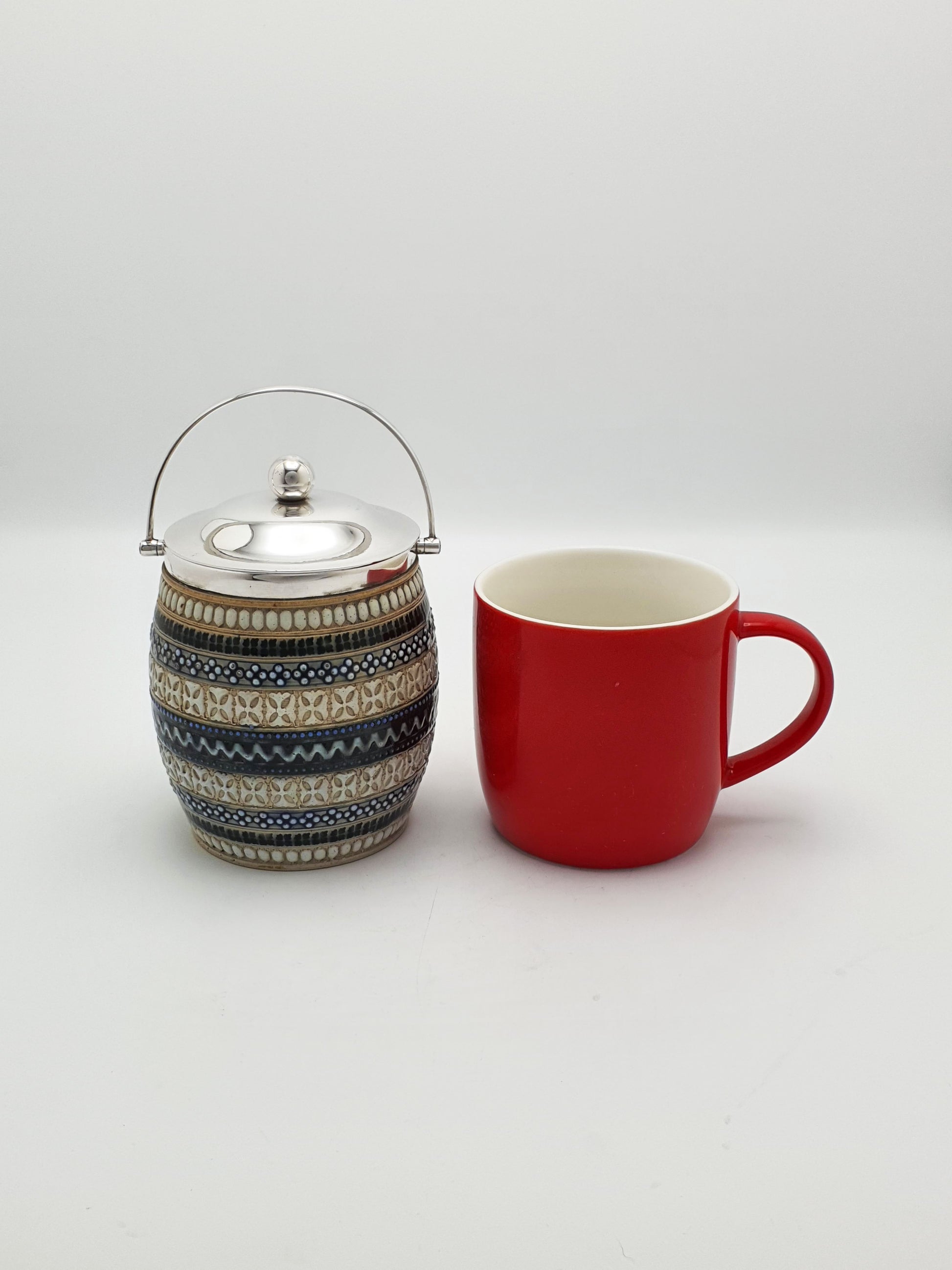 A Lovely Victorian Doulton Lambeth Stoneware Jam Pot rich in texture and decorative detail. The barrel features signature raised geometric bands in blue, white, and tan, and is finished with a polished silver-plated lid and swing handle - blending rustic artistry with refined function circa 1890.