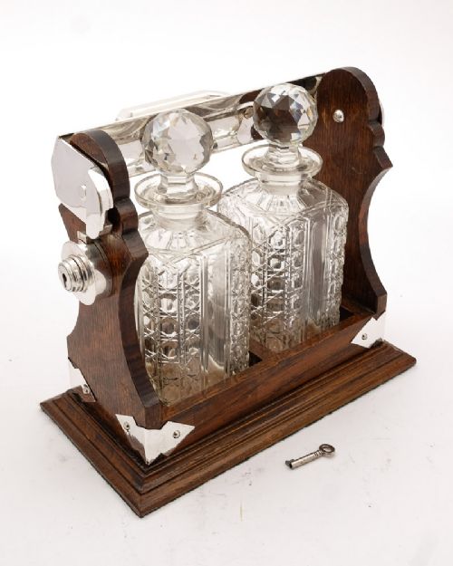 A lovely Victorian oak 2 bottle tantalus with silver plated mounts original key and stunning hobnail cut bottles. Circa 1890. FREE UK & Worldwide delivery to most destinations Measurements: Length: 11 ( approx. 28 cm ) Height: 12 ( approx. 30 cm ) Width of base: 6 ( approx. 15 cm ) In good condition and there is no damage to the decanters.