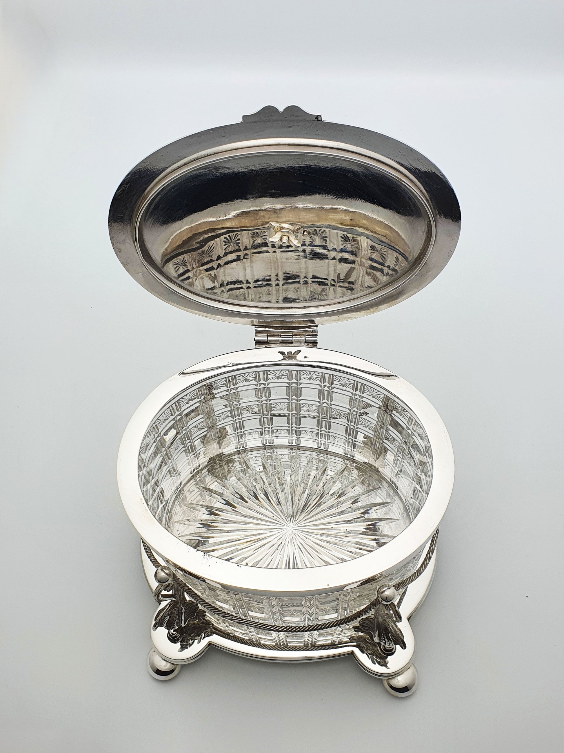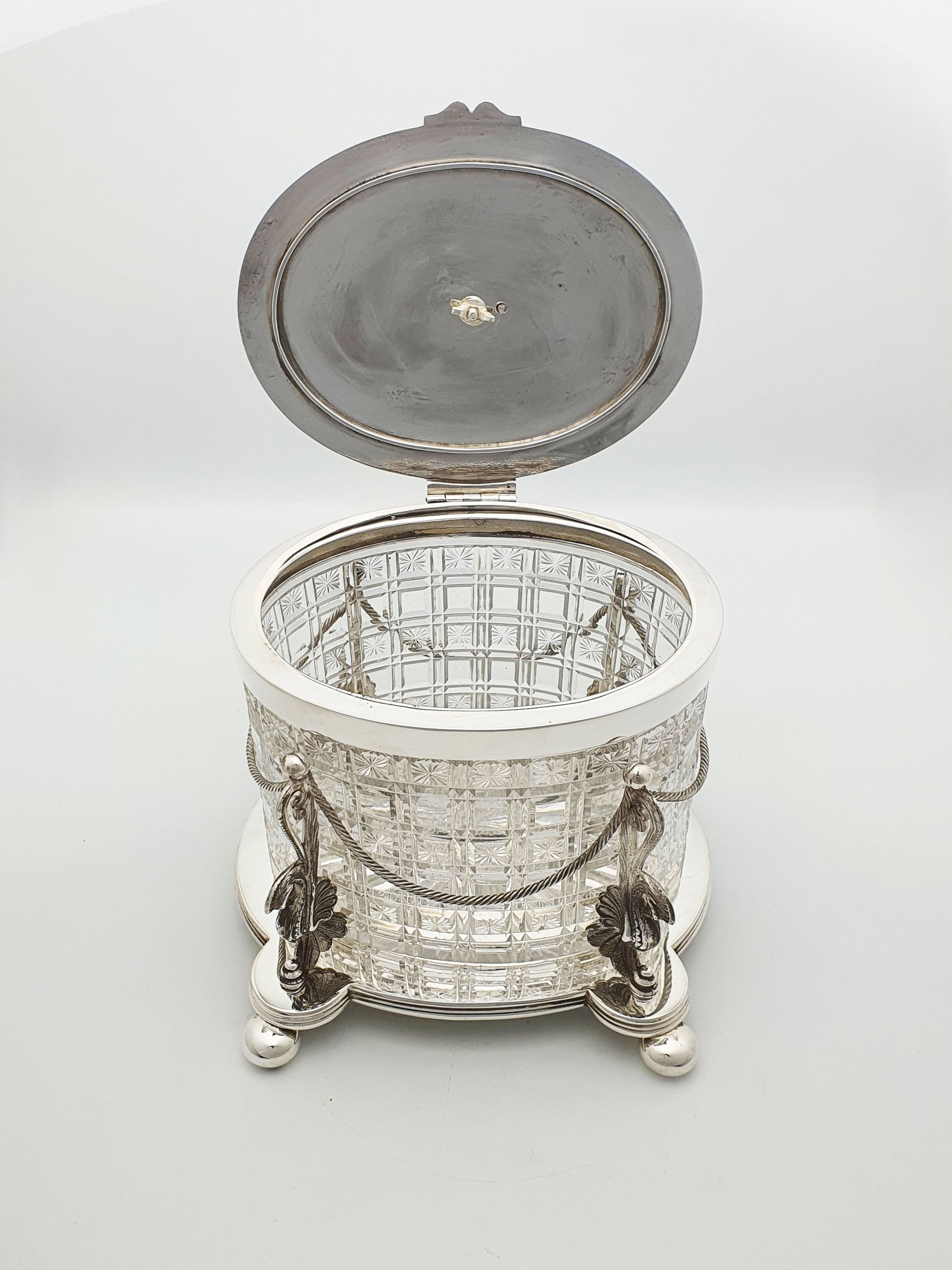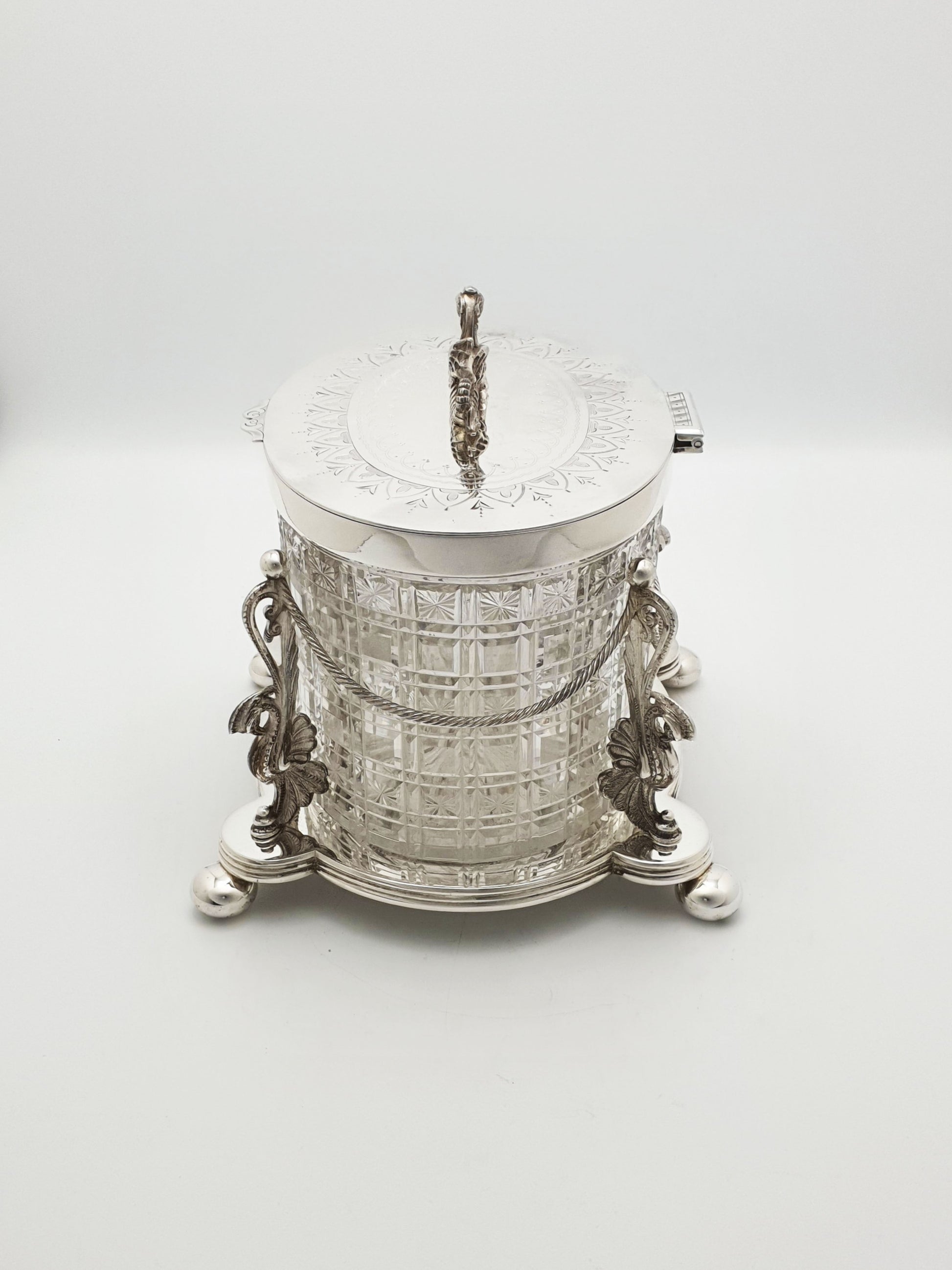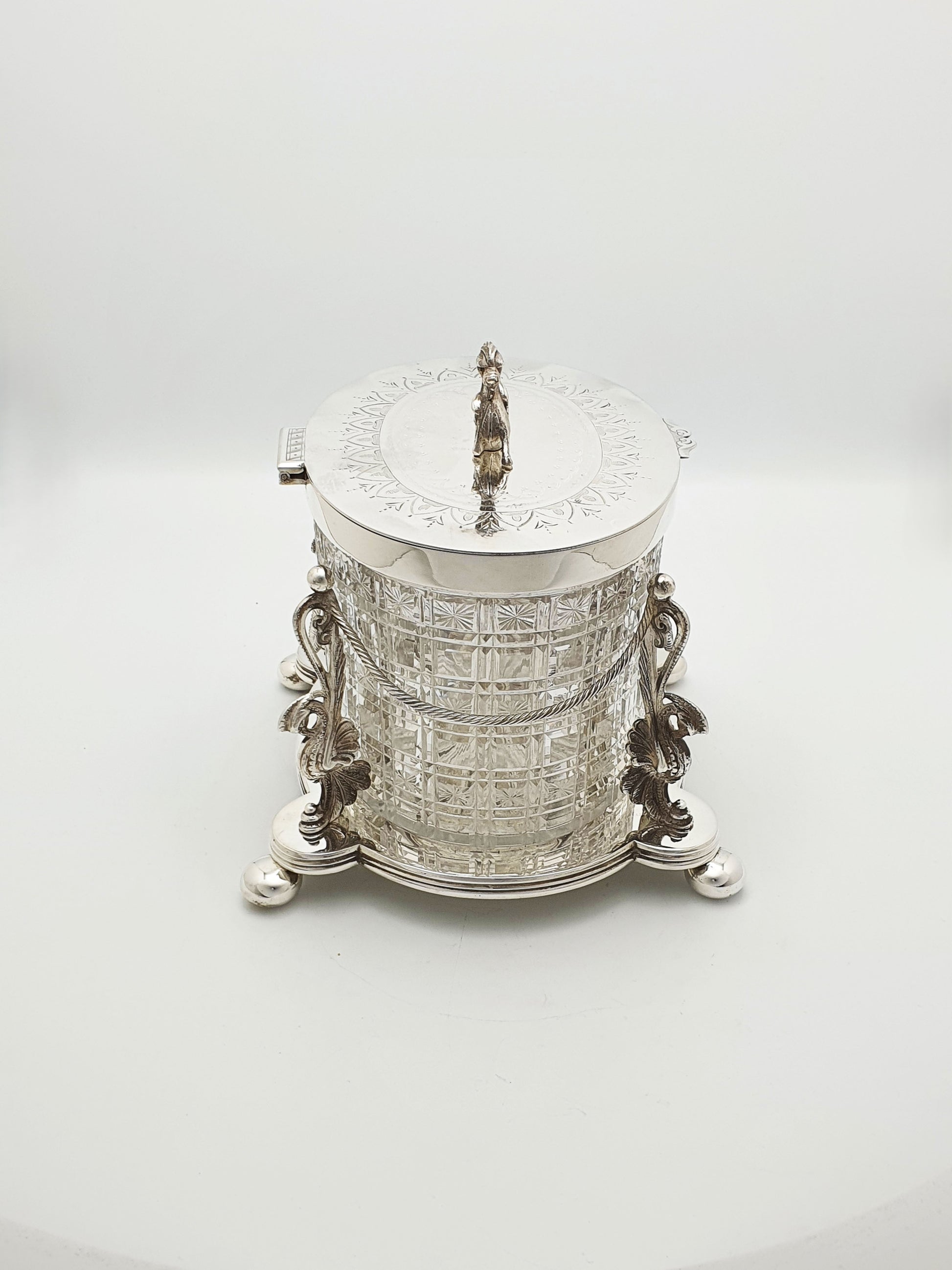 A Really Magnificent Antique Victorian Biscuit Barrel featuring a heavily cut crystal body, fitted into a detachable silver‑plated cradle supported by stylised griffins and garland rope work, crowned by a heraldic dragon finial on an engraved lid.