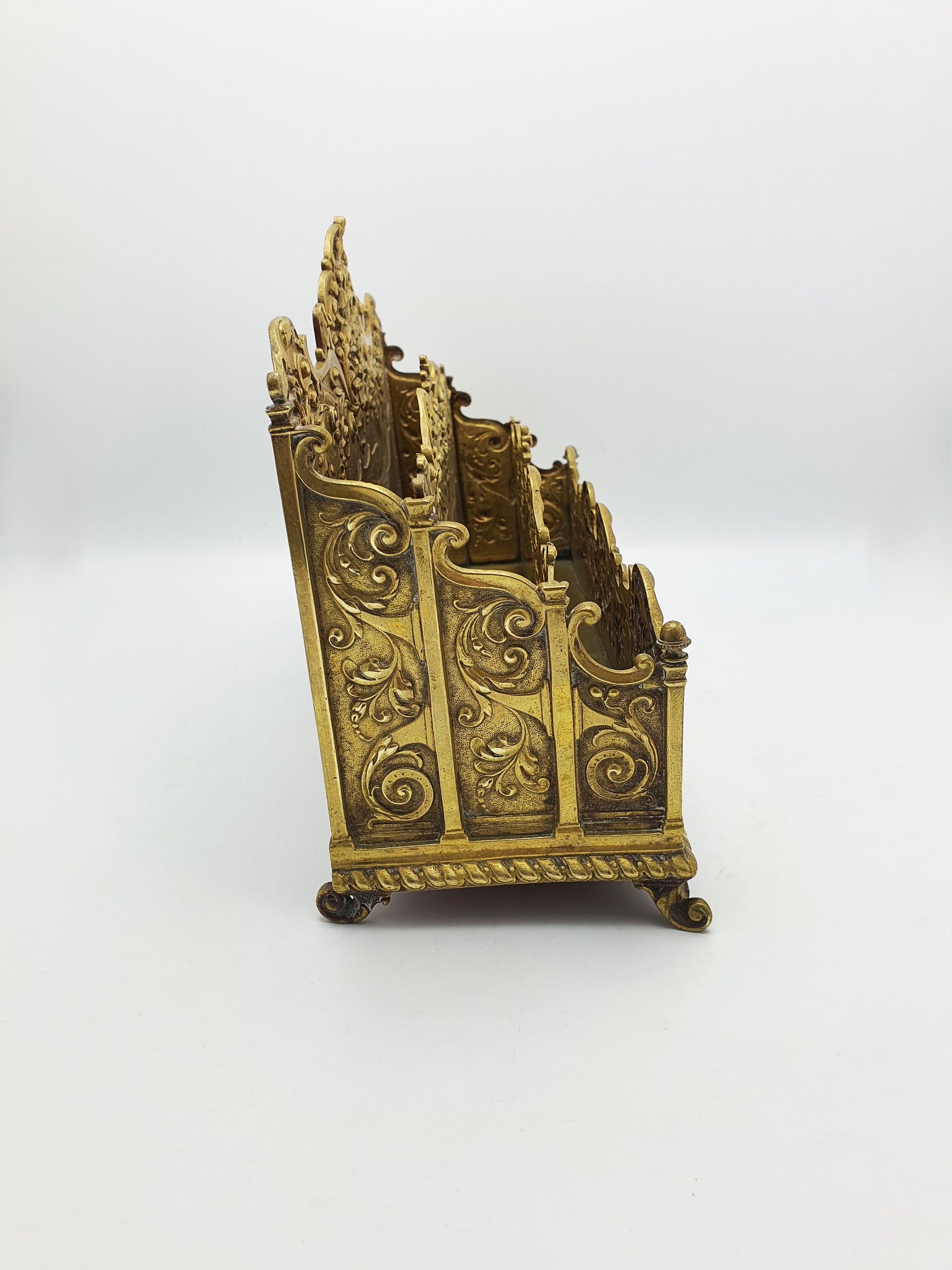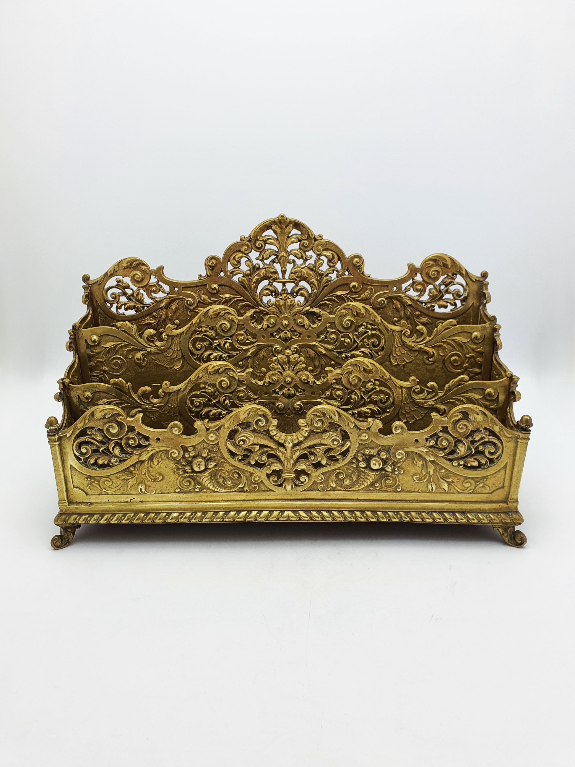 A superb and richly cast brass letter rack, dating to the mid-19th century and most likely produced in Italy for the Grand Tour market. This opulent desk accessory is a fine example of Rococo Revival styling, characterised by its deeply sculpted openwork ornament and classical influences — ideal for display in a refined writing room or study.