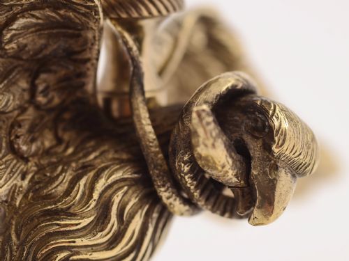 An unusual pair of French brass candlesticks depicting eagles with snakes in their beaks as central figures and detachable drip trays. There is a minor difference to the decoration at the bottom of the bases making these a matched pair. Circa 1870. Worldwide first class tracked and signed for delivery is included in the price. Measurements: Height: 7 1/2 (approx 19cm) Diameter of base: 3 (approx 7.5cm) Intriguing and highly decorative pair of candlesticks from the post Napoleon era In good condition