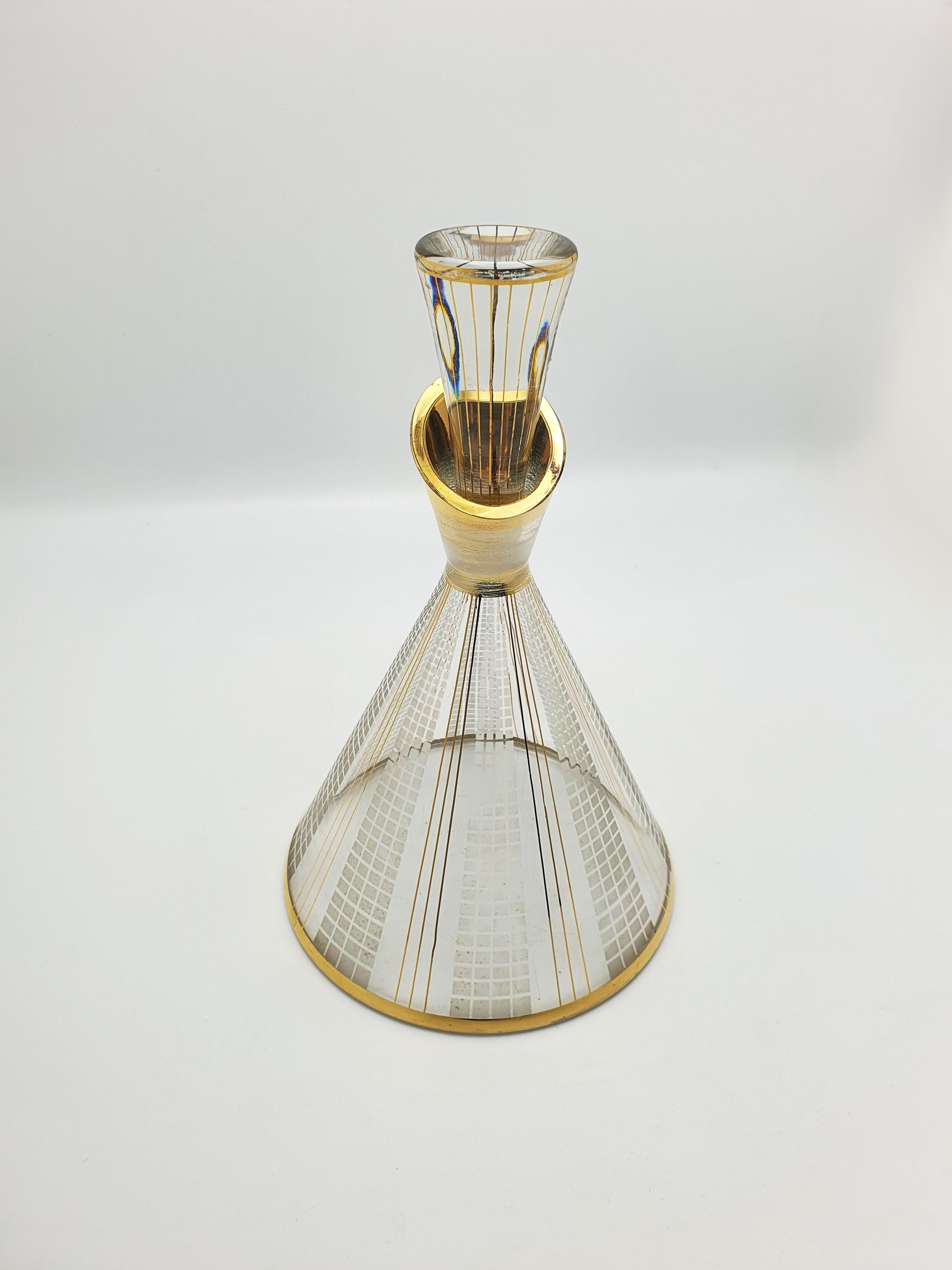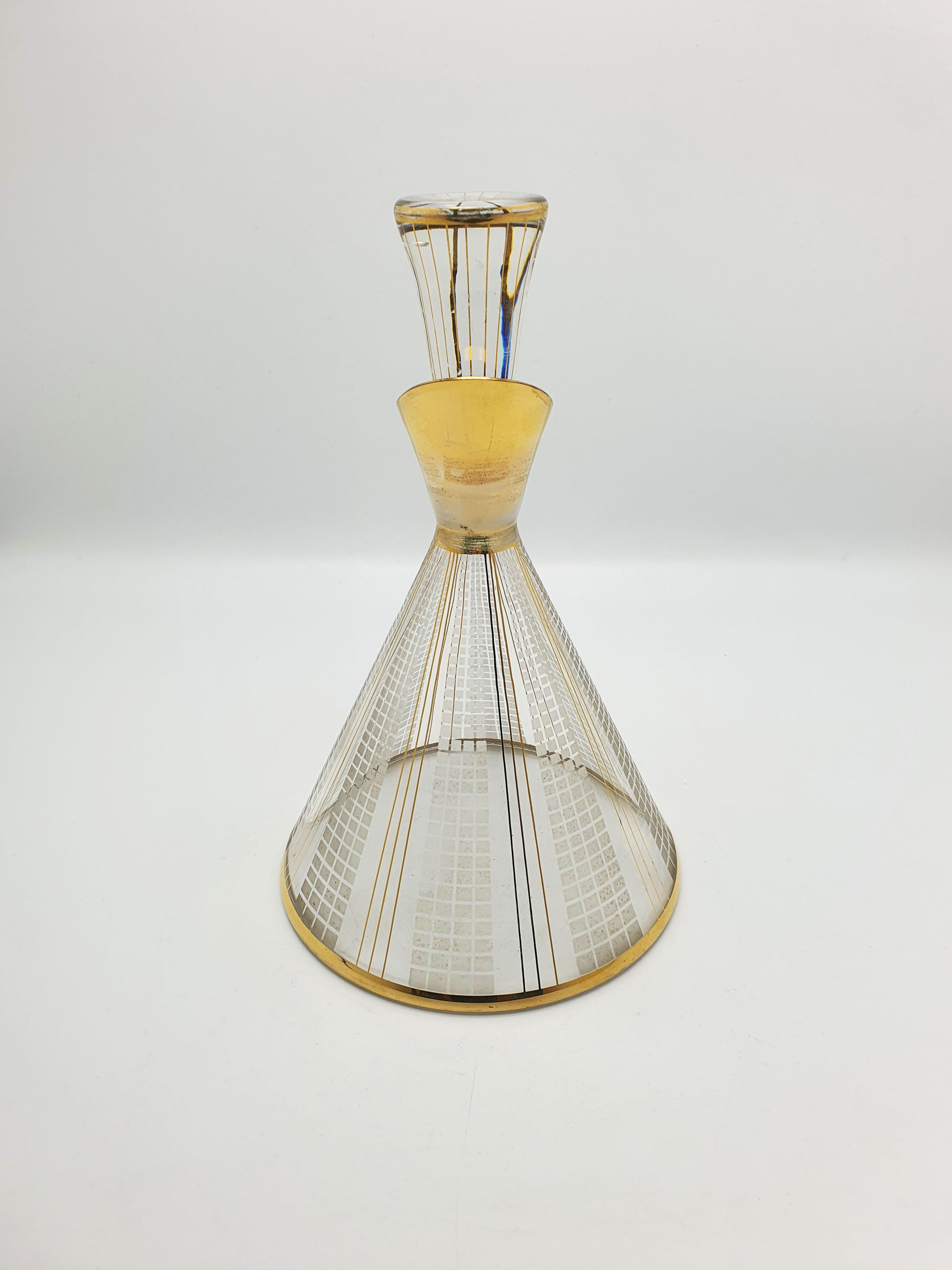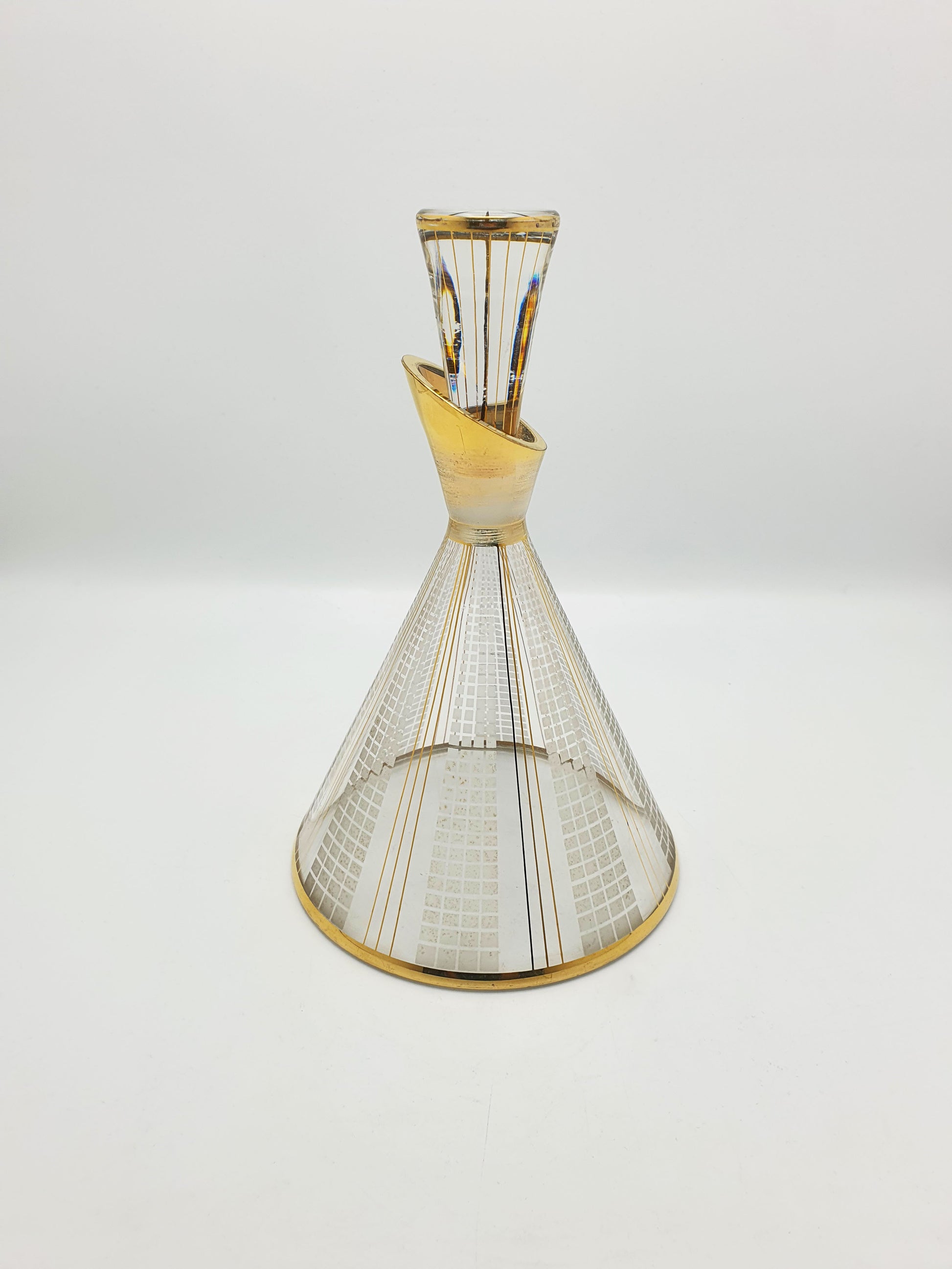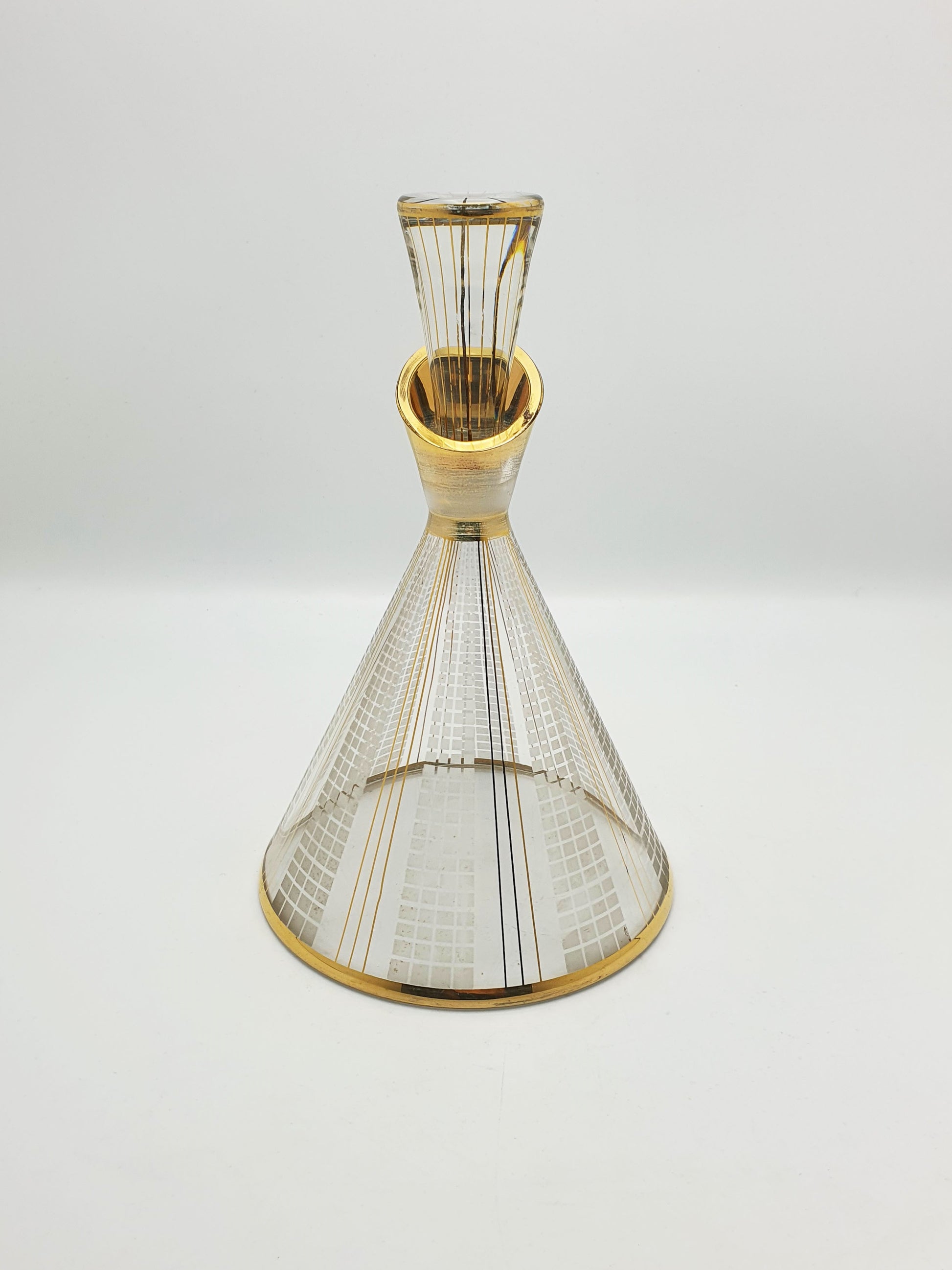 A Nice Mid-Century Modern Art Glass Decanter decorated with geometric etched grid patterns and hand-applied gold accents, the piece radiates sophistication and visual rhythm. The decanter's flared base and tapered stopper make it a true centerpiece, ideal for collectors of modernist glassware or lovers of refined cocktail culture – circa 1960.