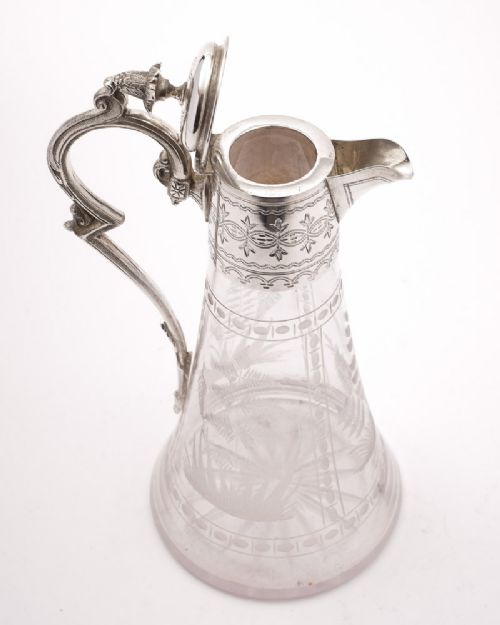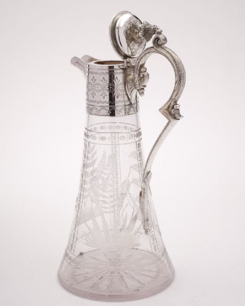 A Fabulous Victorian silver plated and glass Claret Jug with etched decoration to glass body and star cut base silver plated embossed & engraved top and handle with flip-up lid - circa 1890 FREE UK & Worldwide Delivery to most destinations Measurements Height 11 (approx. 28 cm ) Diameter of base 5 1/4 (approx. 13.5 cm ) Weight 1010 g In good condition = no cracks or chips to the glass