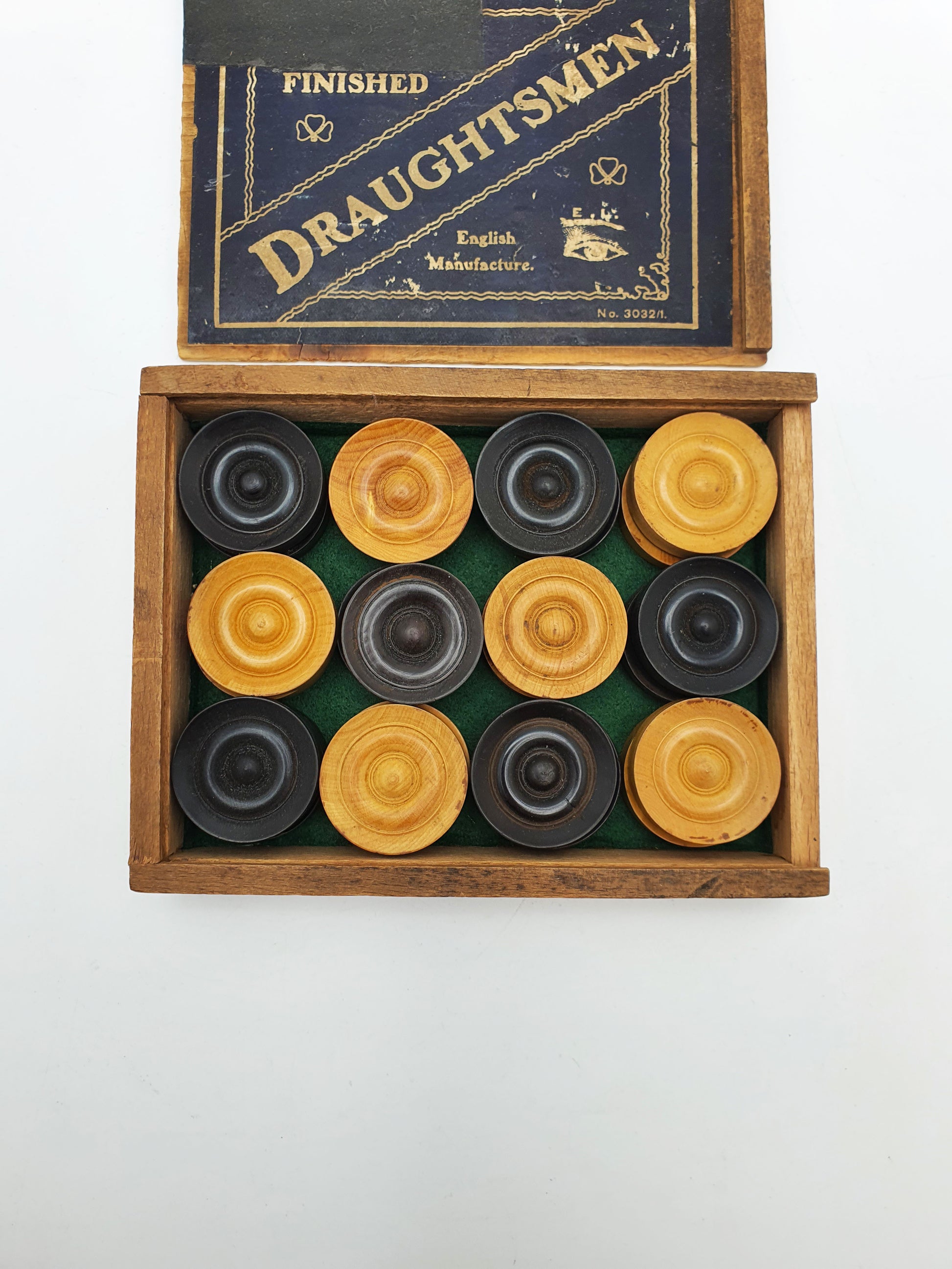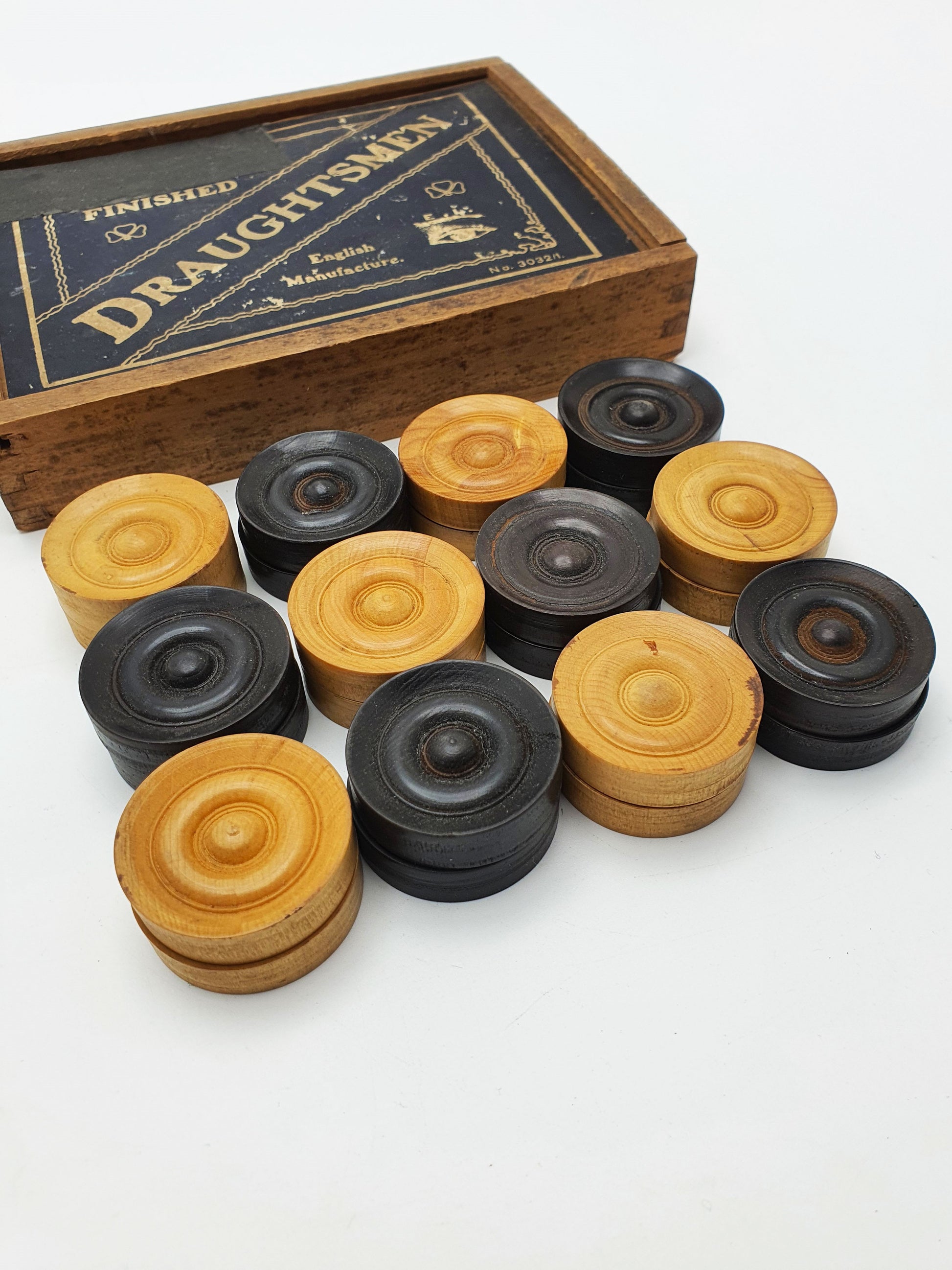 Nice Antique Boxwood & Ebony Draughts Set in Original Box – circa 1920