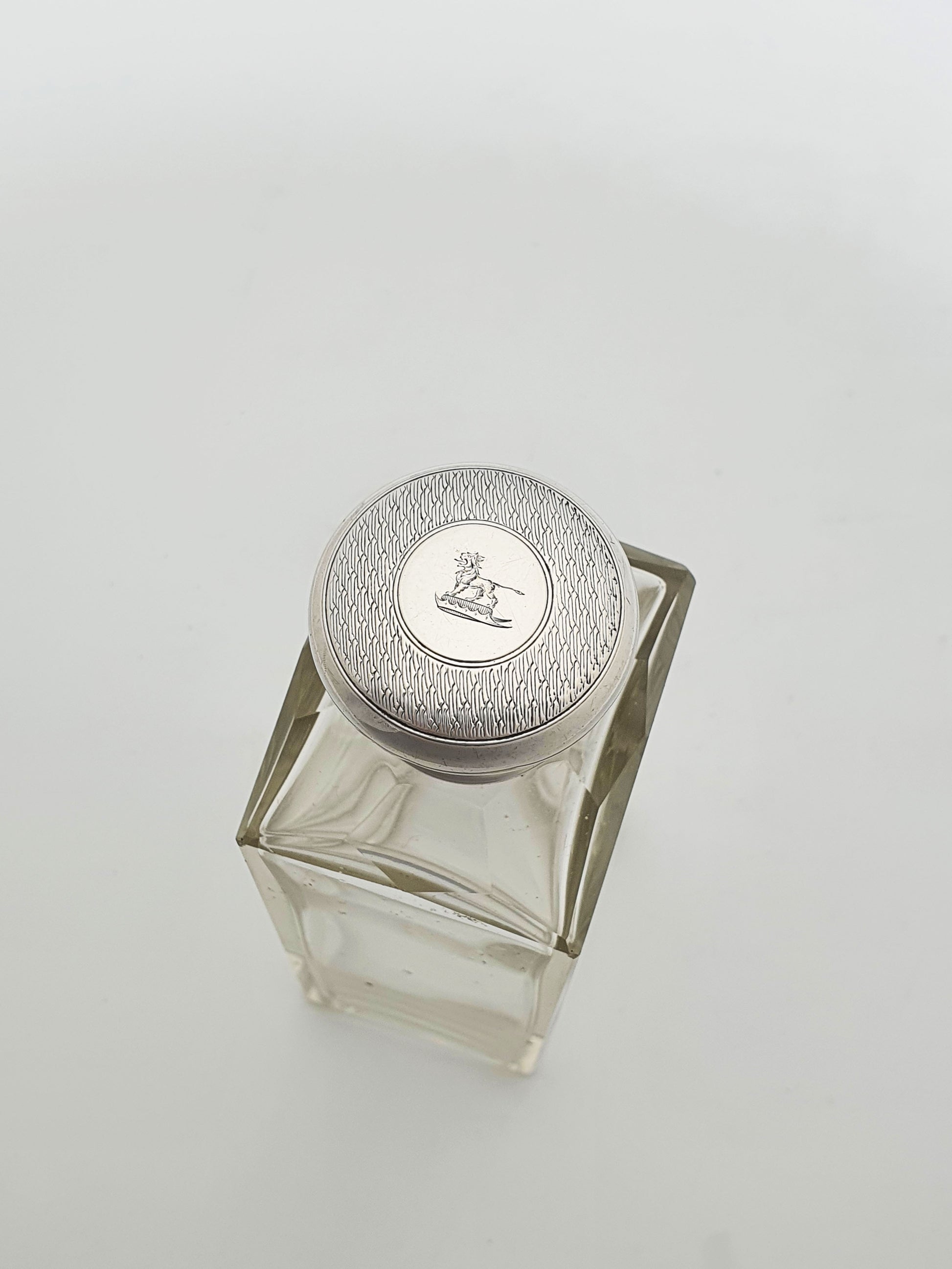 In good condition – Glass free from major chips or cracks, silver lid clean with crisp engraving and clear hallmarks. Minor surface wear consistent with age.