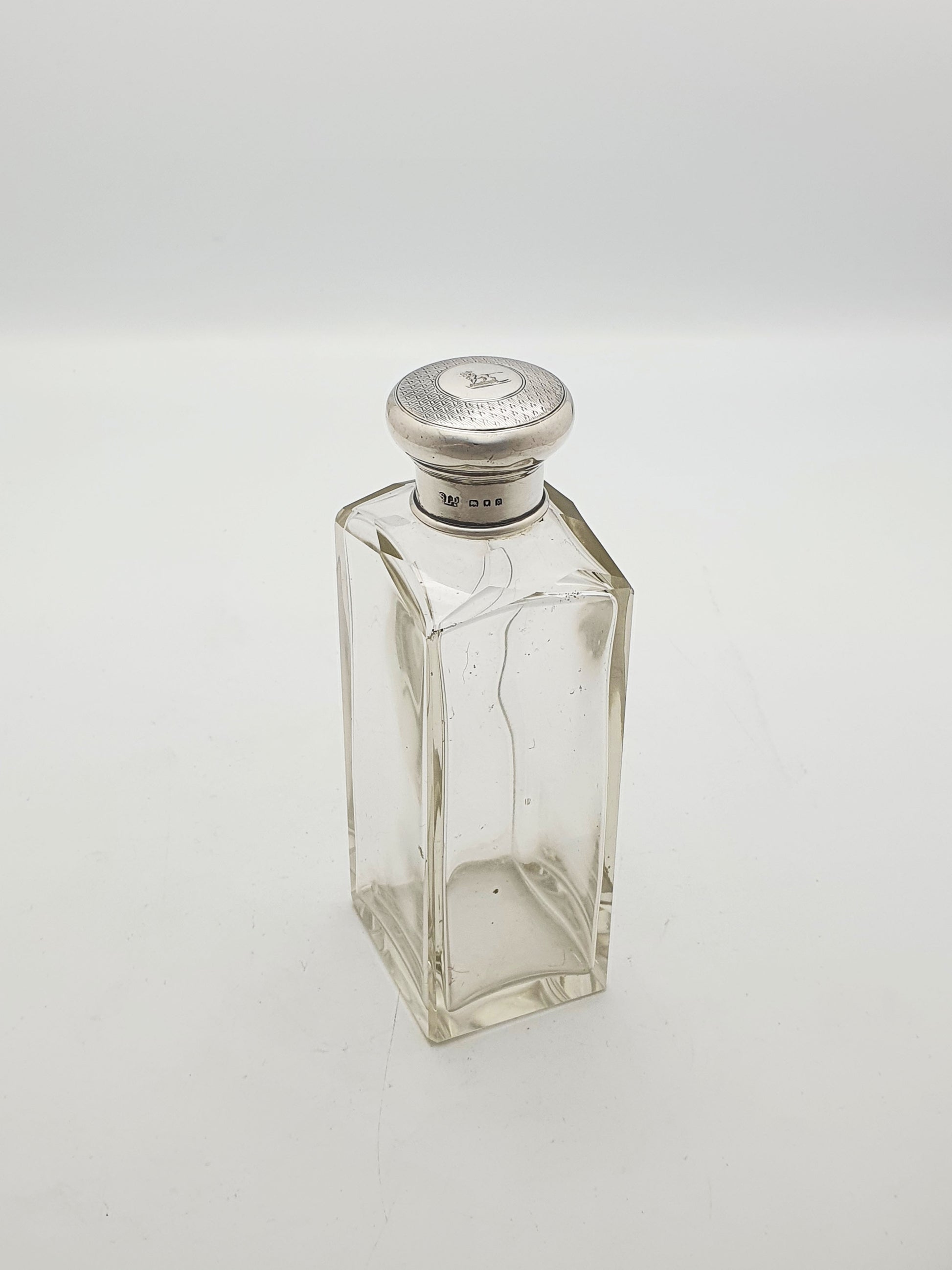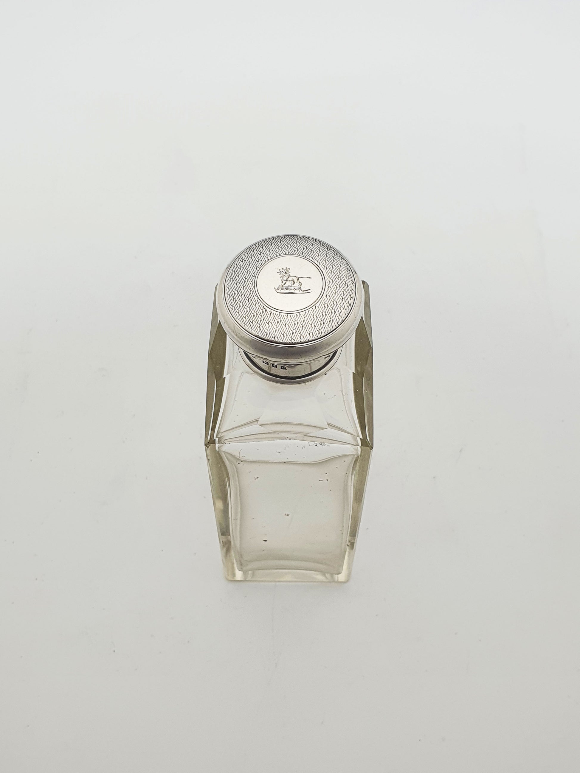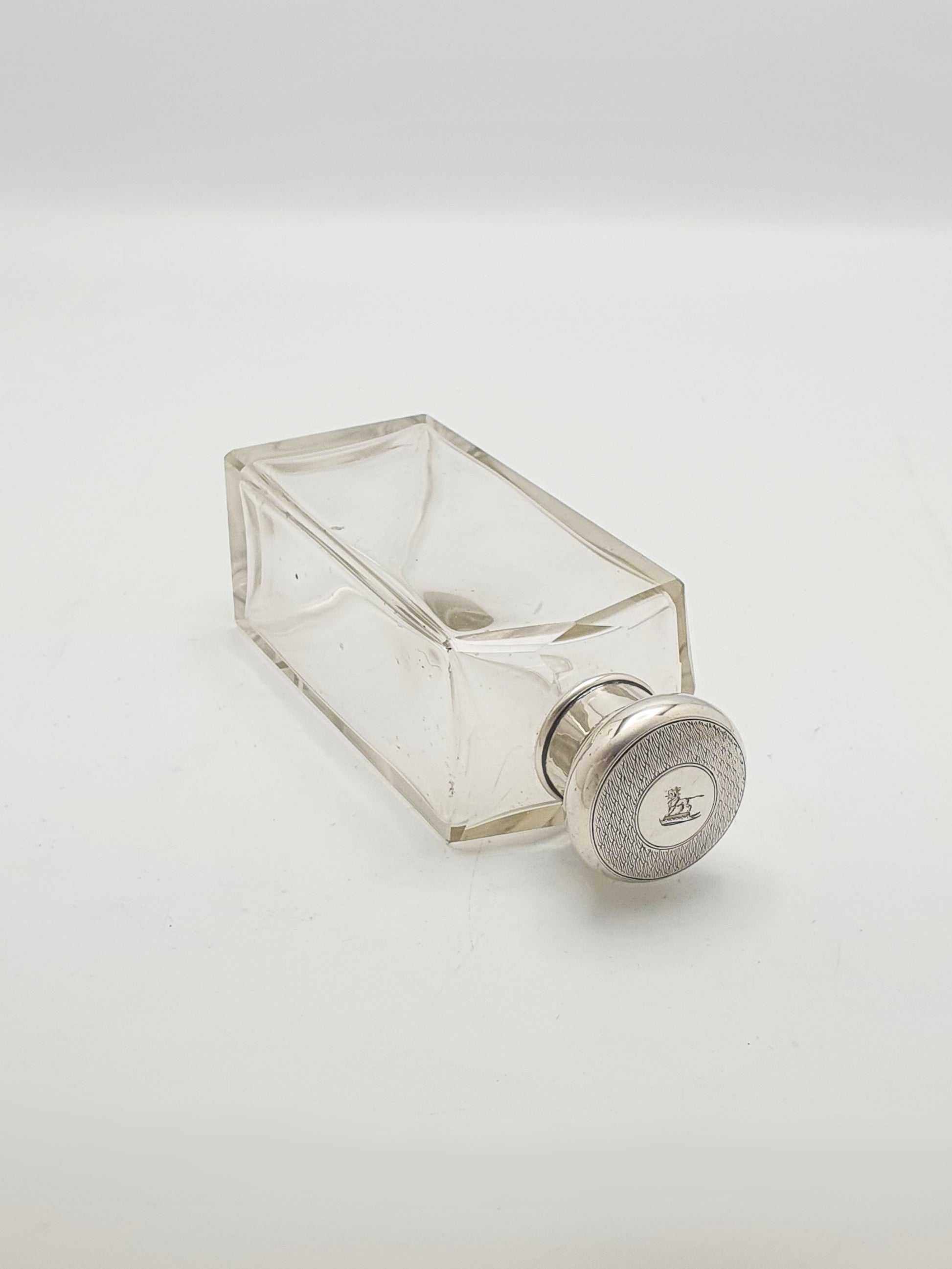 A Nice Antique Edwardian Glass and Silver Topped Scent Bottle with a rectangular cut glass body and a sterling silver screw-top lid, fully hallmarked for London, 1919. The lid is engine-turned with a central circular cartouche, engraved with a family crest depicting a lion stood atop a crown.