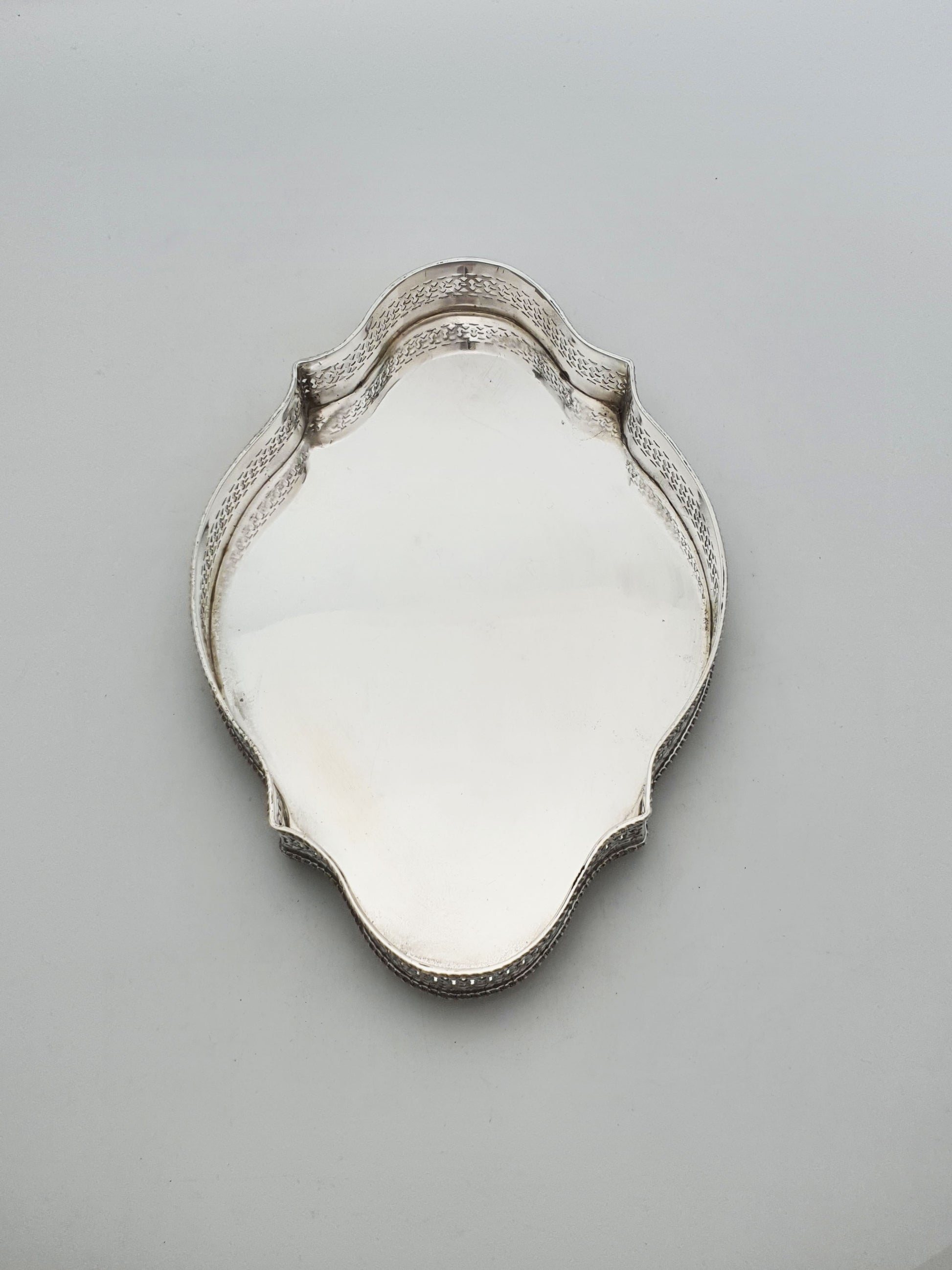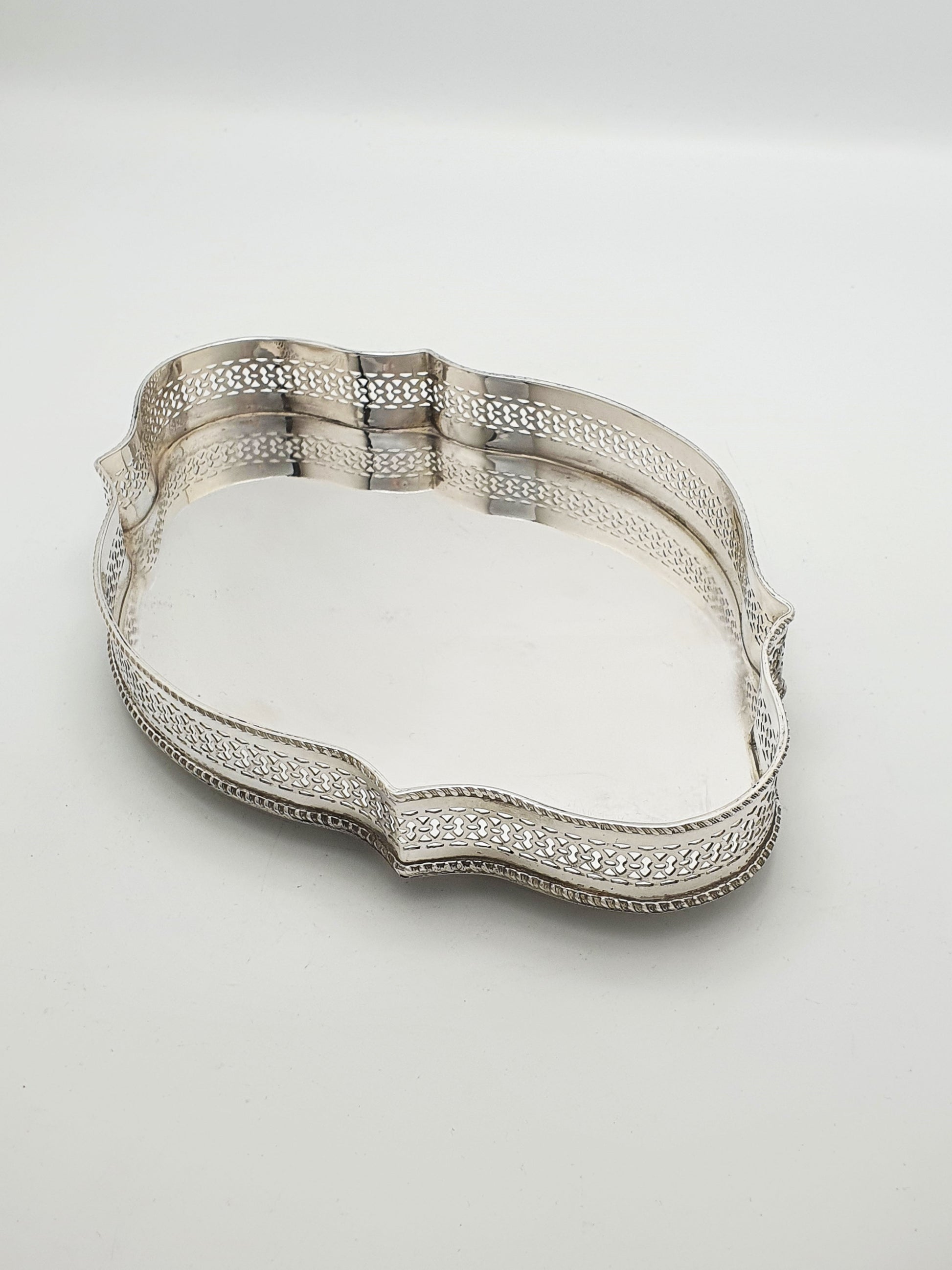 A Nice Antique Edwardian Silver-Plated Gallery Tray with a undulating, serpentine outline and pierced gallery border, it brings timeless sophistication to any tea table, drinks service, or vanity display. Crafted with a delicately shaped rim and a polished flat surface, this tray reflects both light and craftsmanship beautifully. The pierced gallery sides offer a glimpse into Edwardian taste for refined detailing - elevating this from a simple serving piece to a standout decorative accessory.