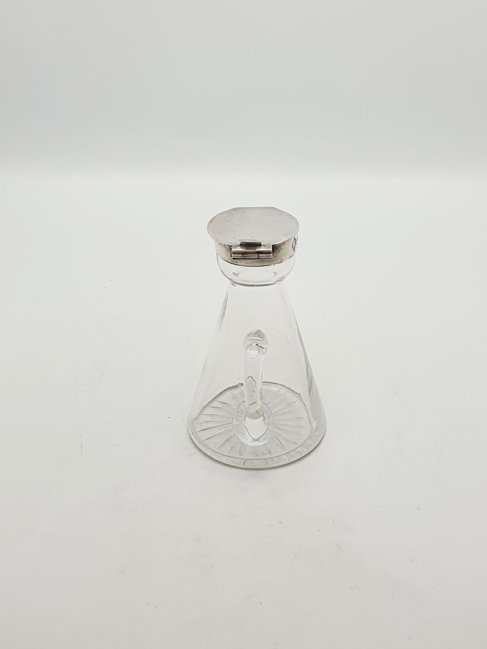 A Nice Edwardian whisky noggin with a fitted sterling silver collar and hinged lid. The silver mount is shaped with a defined pouring lip, giving controlled, neat dispensing. A short glass handle is applied to the body, offering a secure grip for careful pouring. Hallmarked for Birmingham, 1904.
