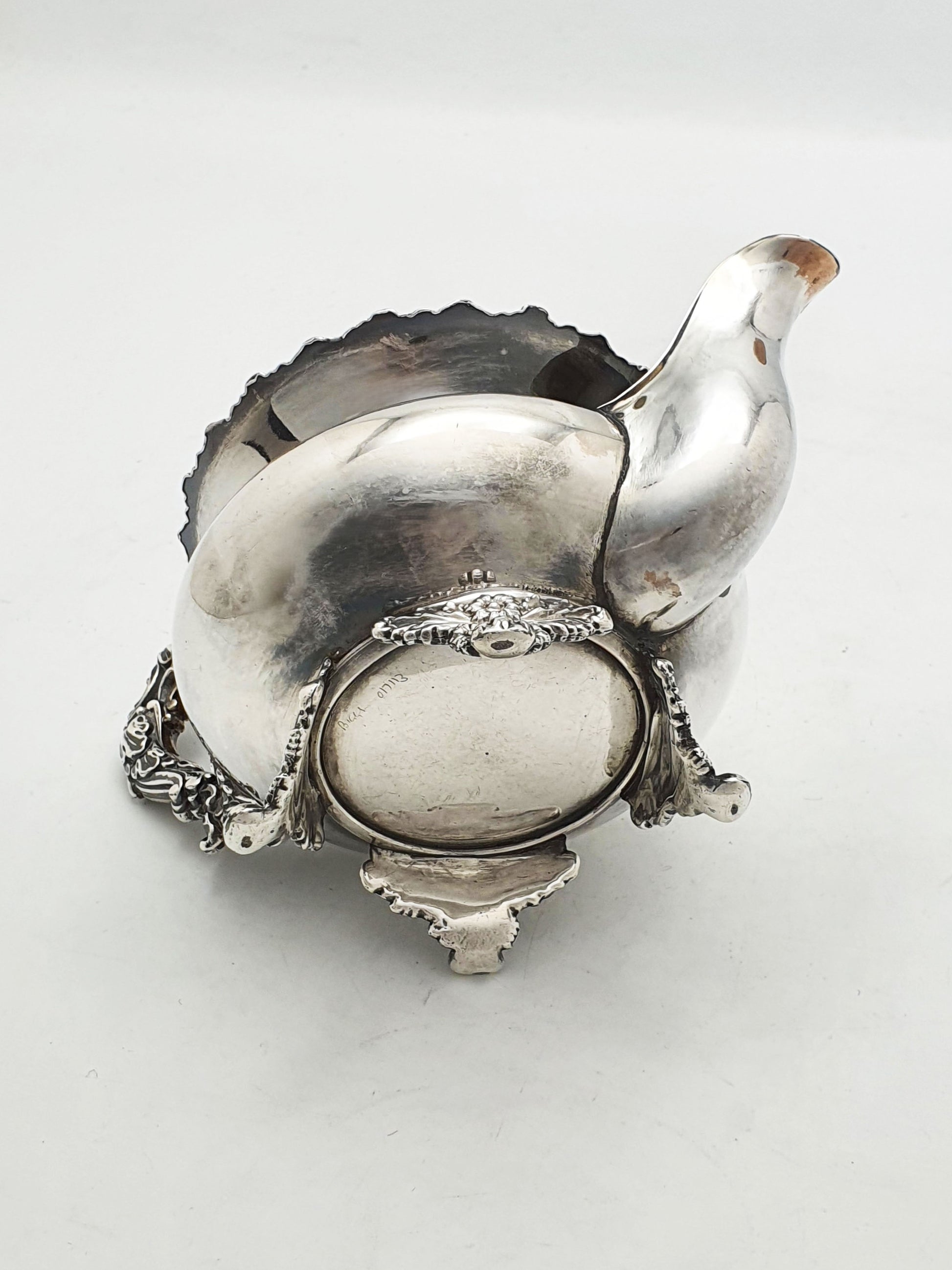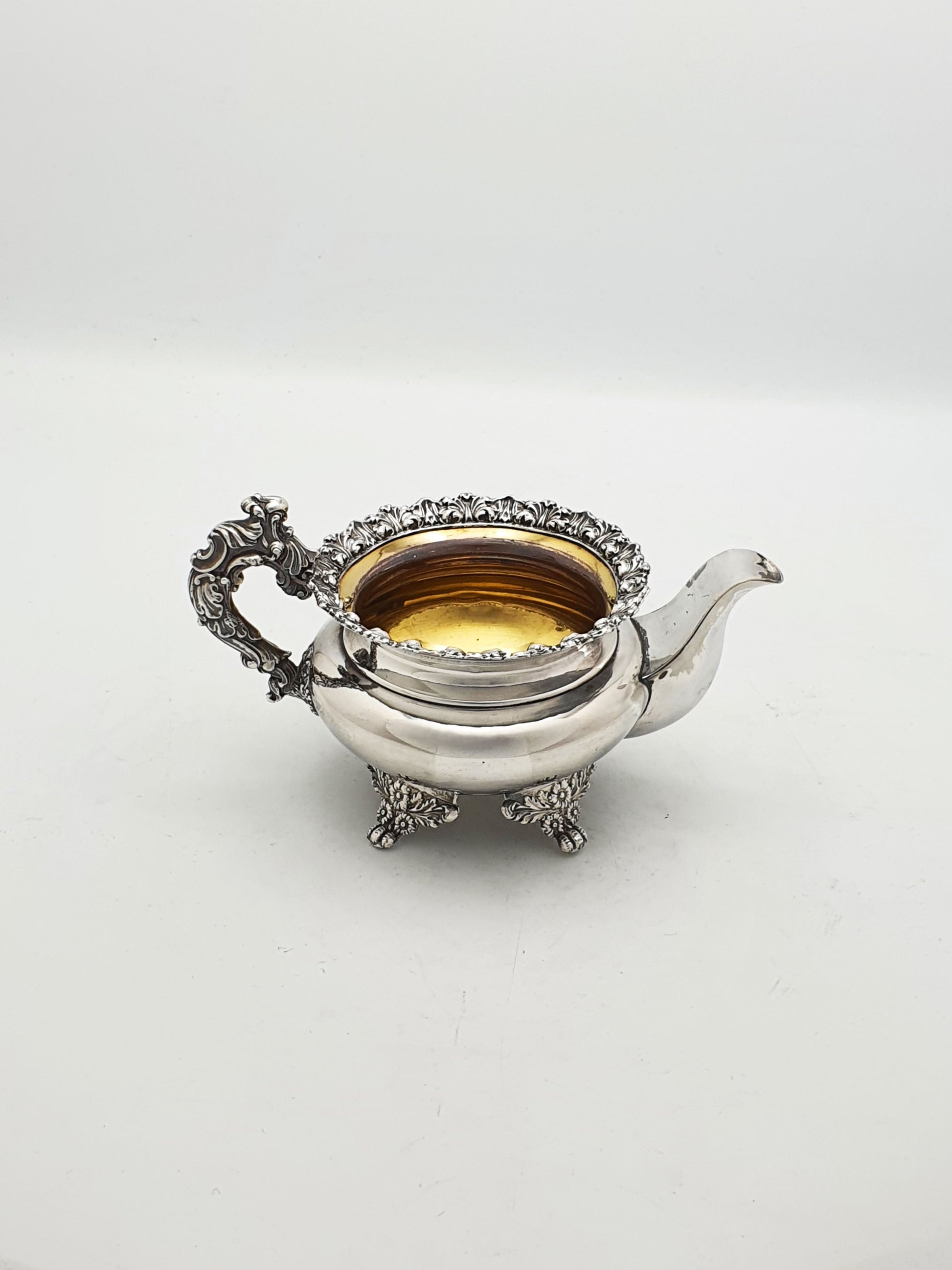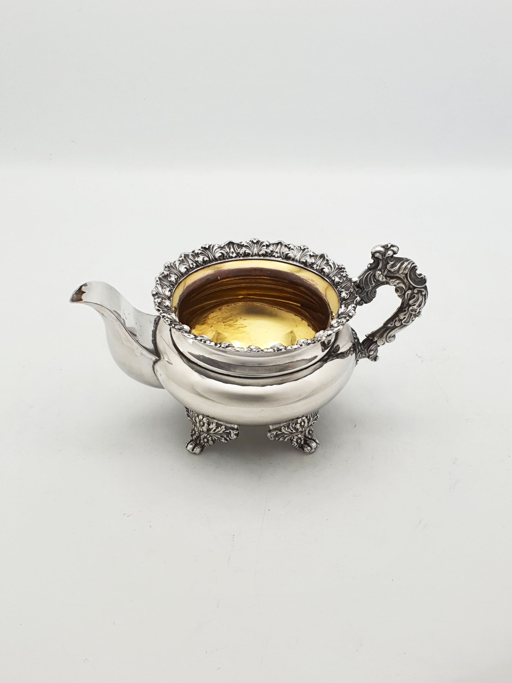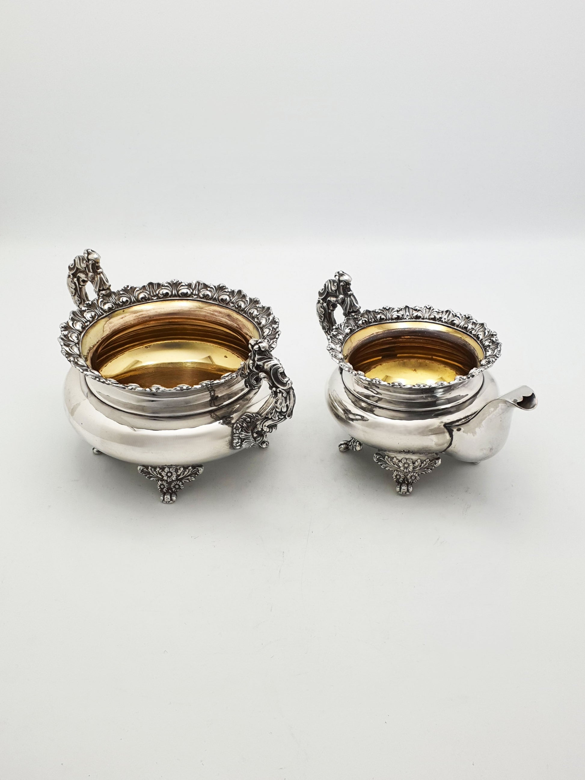 Inside, both the bowl and jug retain their original gilt-washed interiors, protecting the contents from tarnish while adding a luxurious, golden tone.