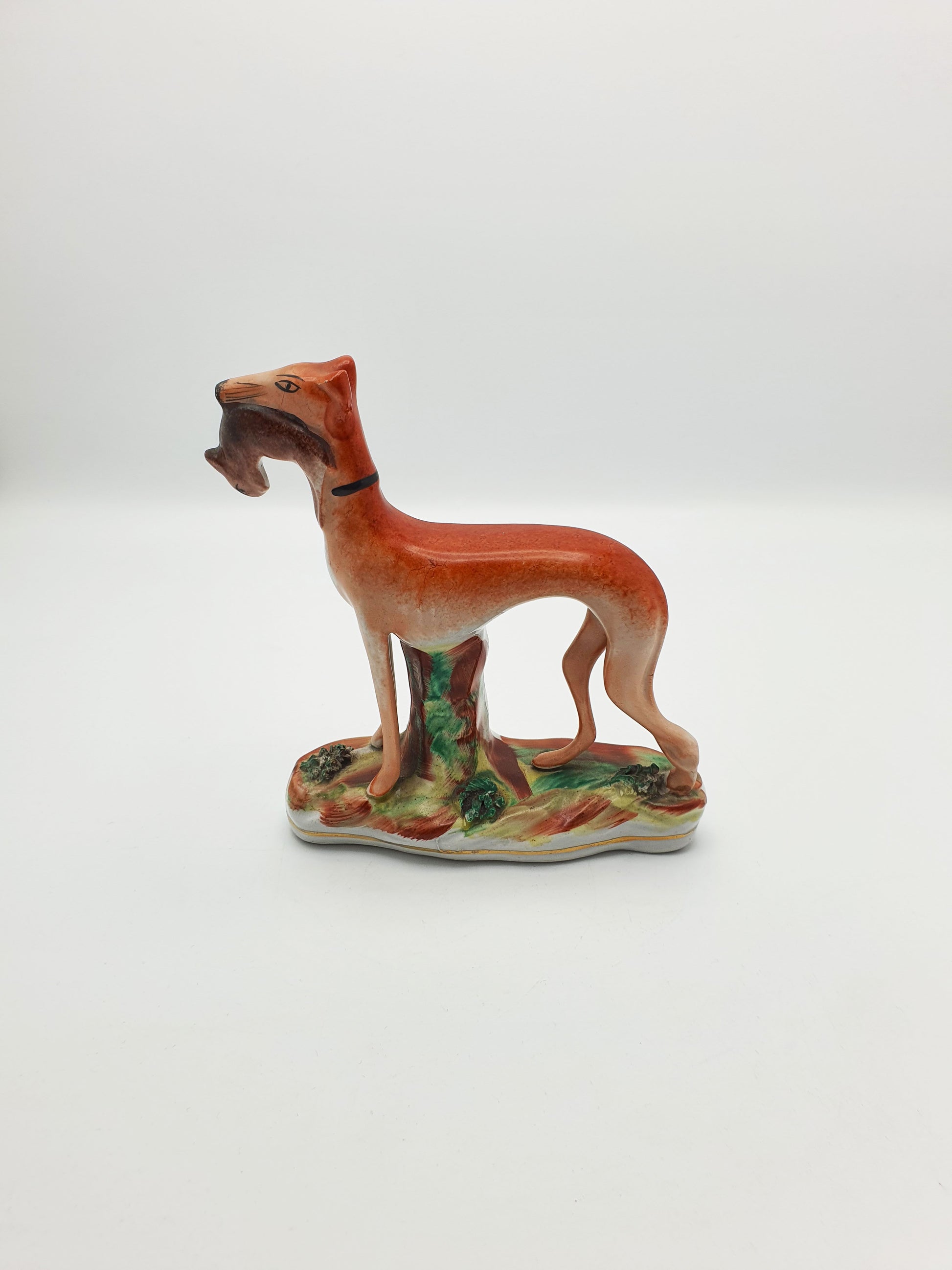 A Nice Antique Staffordshire figurine depicting a slender greyhound proudly holding a hare in its mouth, standing gracefully on a painted naturalistic base. With its hand-painted details and warm earthy tones, it captures the rural sporting life so beloved in Victorian England – circa 1870.