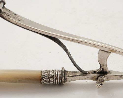 Nice Continental Silver Serving Tongs with Mother of Pearl handle. Lovely pierced & engraved decorative fish and basket flower decoration has small adjusting key on the handle - circa 1870 FREE UK & Worldwide Delivery Measurements Length 11 3/4 ( approx. 30 cm ) Width of servers 3 ( approx. 7.5 cm ) Weight 190 g In good condition - no splits or cracks to the Mother of Pearl any dark areas are from the photography