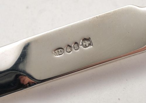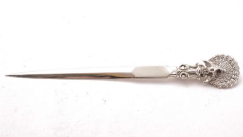 A nice English Edwardian silver plated paper knife with peacock decoration to the end. Marked JD & S for the renowned maker James Deakin & Sons. Circa 1905 FREE worldwide delivery. Measurements: Length: 9 (approx 23cm) Width to widest point: 1 1/2 (approx 3.75cm) Weight: 86g In good condition - any dark areas are shadows from the photography there is no damage to the silver plate.