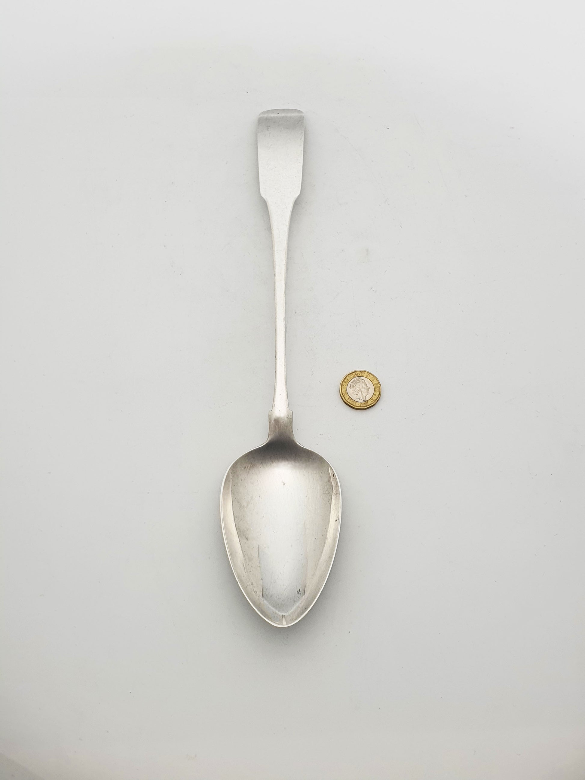 This impressive Georgian sterling silver basting spoon, hallmarked Dublin, 1809, is a fine example of early 19th-century Irish craftsmanship. With its elongated handle and generous bowl, this substantial piece would have been an essential tool in the well-appointed kitchen or dining room of the era - ideal for serving roasts, gravies, or puddings. Marked ‘RW’ for the maker‘Richard Whitford’.