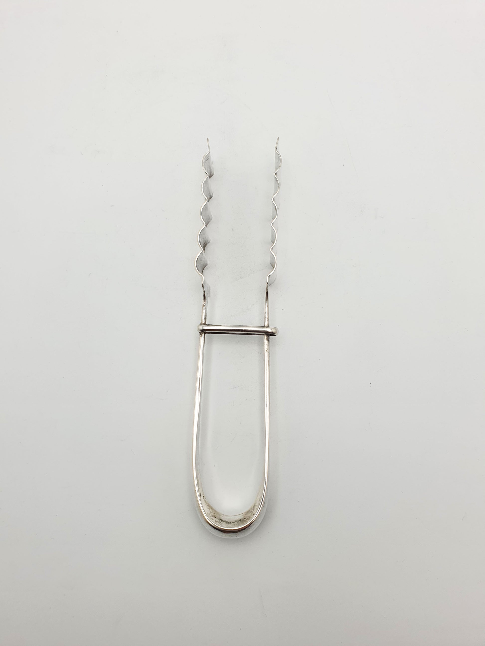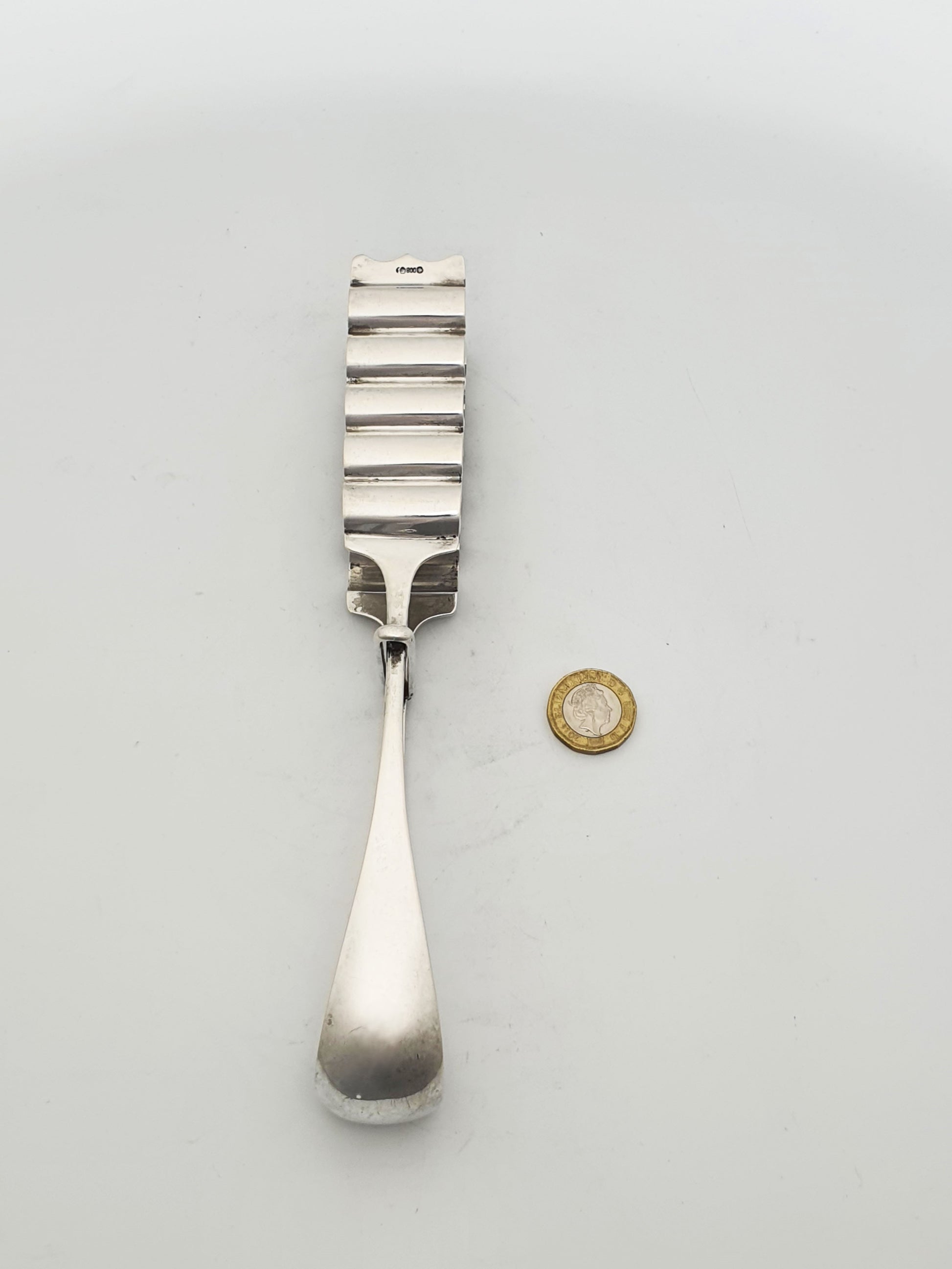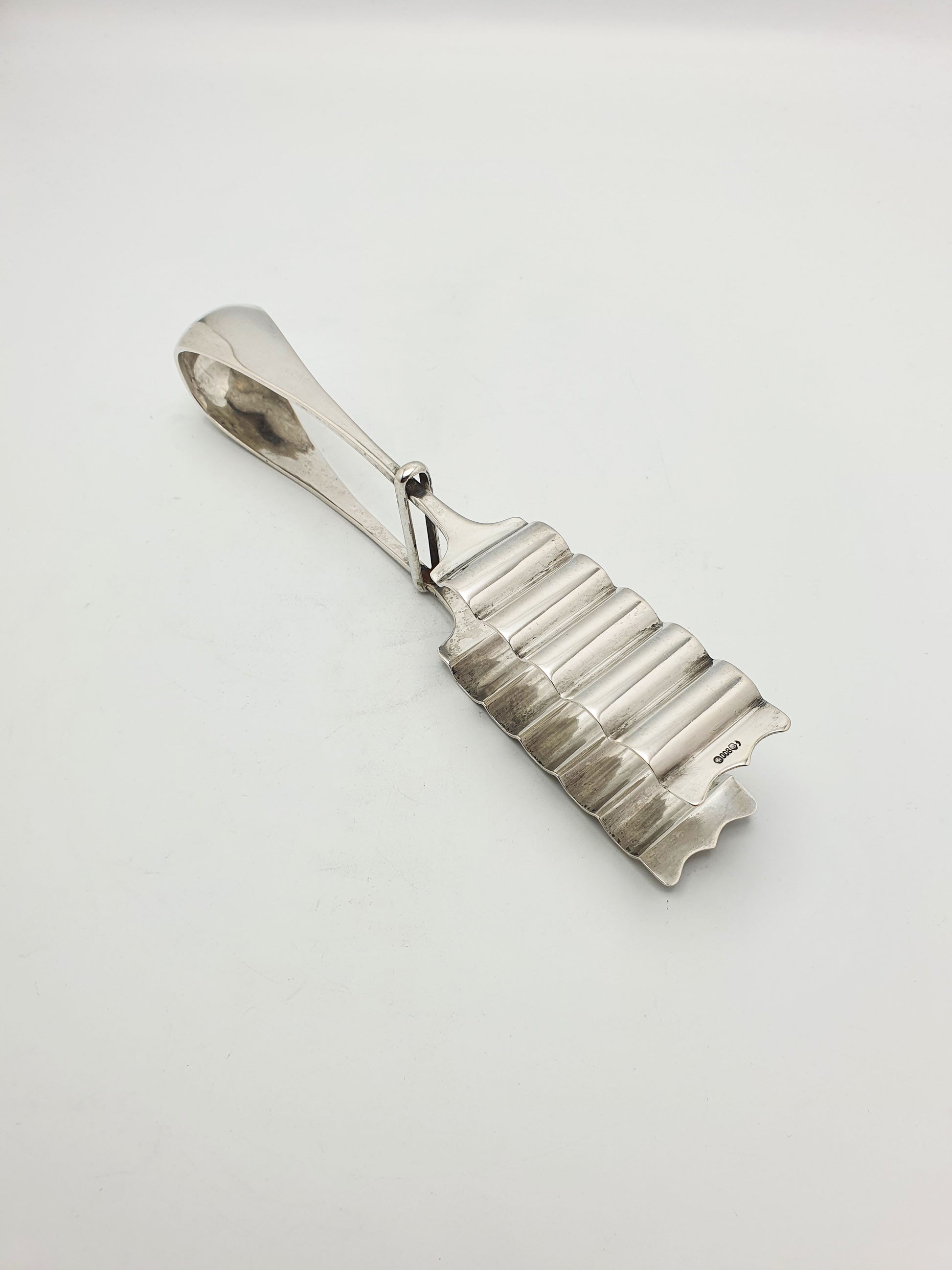 Very Nice German Silver Asparagus Tongs stamped for 800 purity silver, a common European standard. The tong tips are shaped with deep, curved fluting - perfect for gripping slender or slippery foods without damaging them. Elegant yet practical serving pieces from this era are less common and increasingly appreciated for their minimalist appeal – circa 1900.