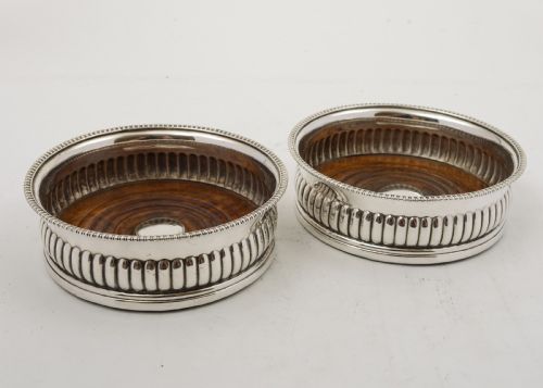 A Nice Pair of Georgian Coasters silver on copper with turned hardwood bases with central silver plated button and felt bases - circa 1820 Free Worldwide Deliver Measurements Height 2 ( approx 5 cm ) Diameter 4 1/2 ( approx 11.25 cm) Total Weight 510 g In good condition - there are no cracks of split to wood - any dark areas are from the photography