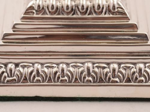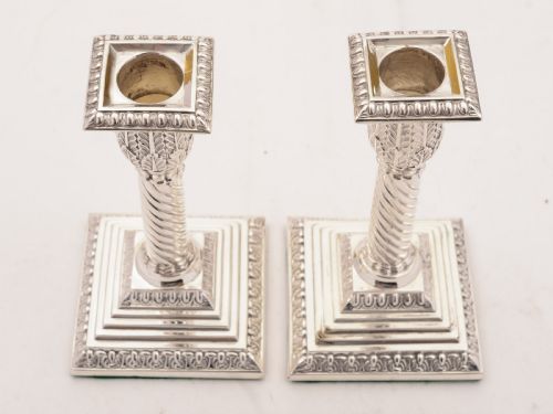 A nice pair of English Edwardian silver plated small candlesticks. They have square bases spiral stems and removable drip trays with lovely embossed decoration to bases and tops. Circa 1905 FREE worldwide delivery. Measurements: Height: 6” (approx. 15cm) Length: 3 ¼” (approx. 8cm) Width: 3 ¼” (approx. 8cm) Total weight: 637g In good condition - any dark areas are shadows from the photography there is no damage to the silver plate.