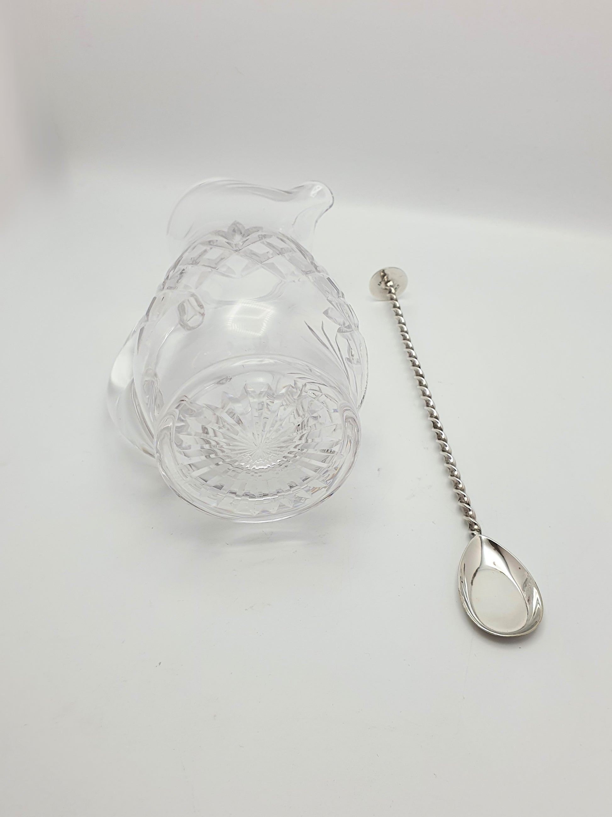 A Nice Retro Glass Cocktail Mixing Jug with shaped pouring lip and cut-glass decoration to the body and a star cut base. Comes with silver plated mixing spoon - circa 1950.