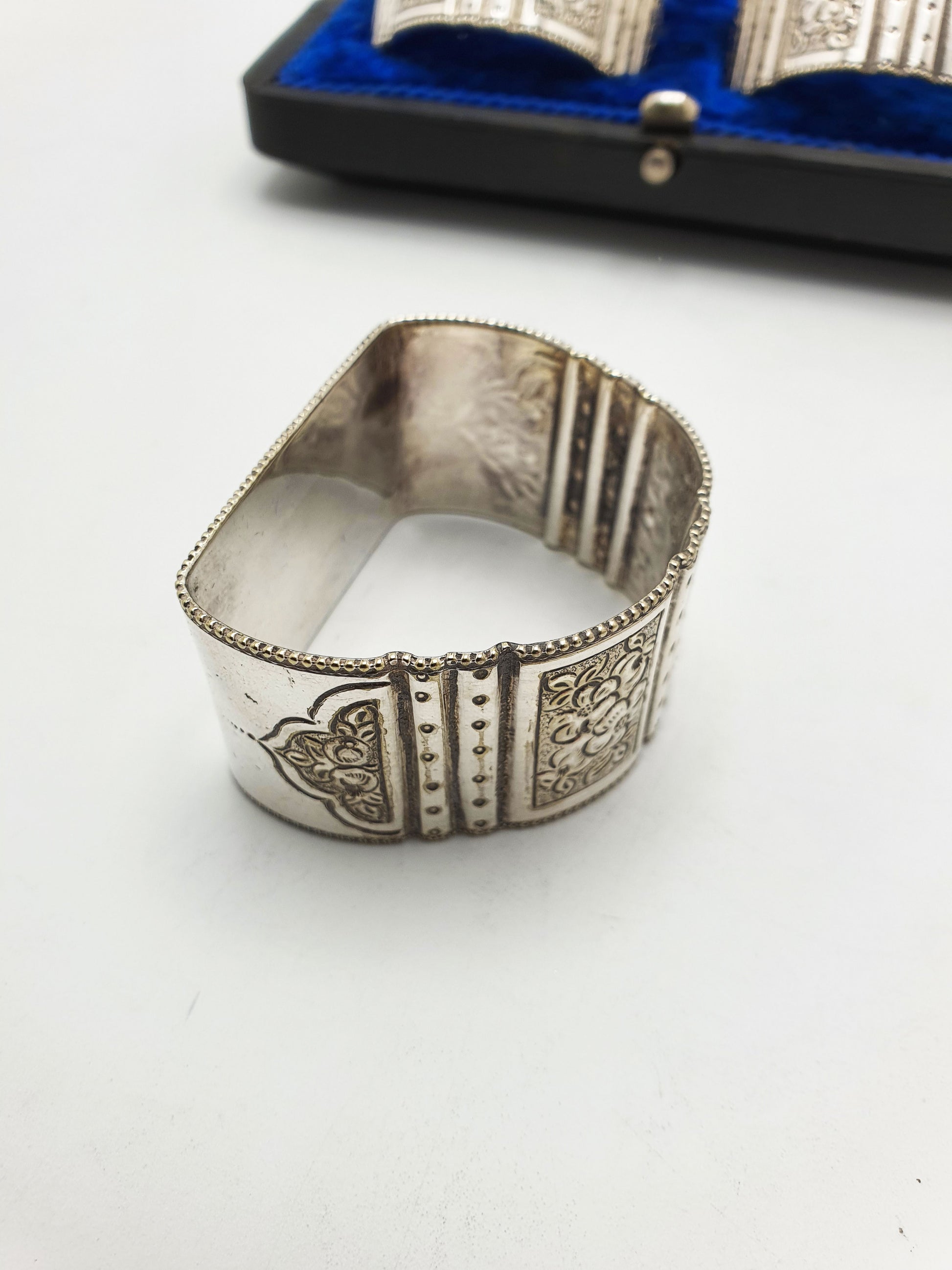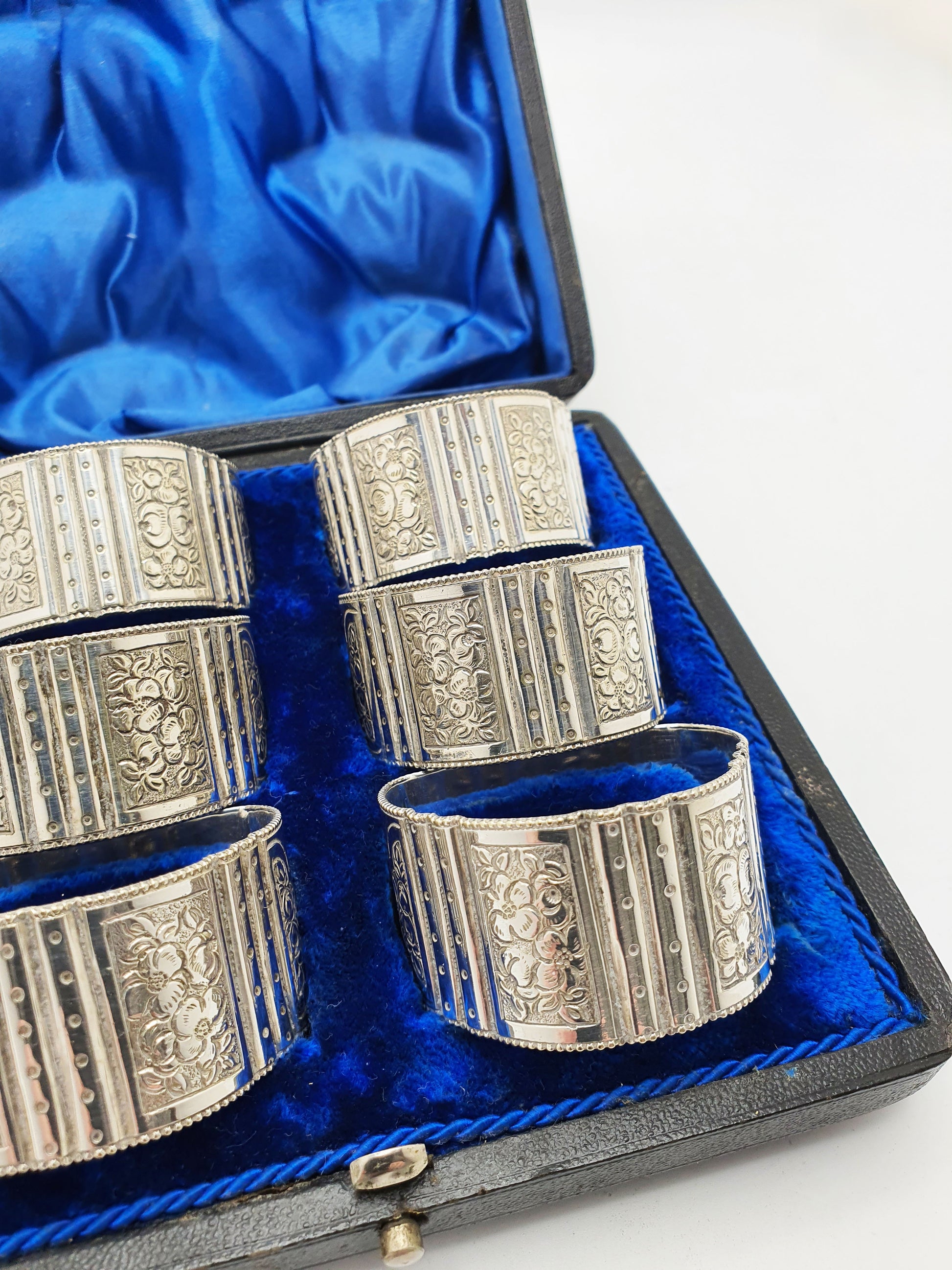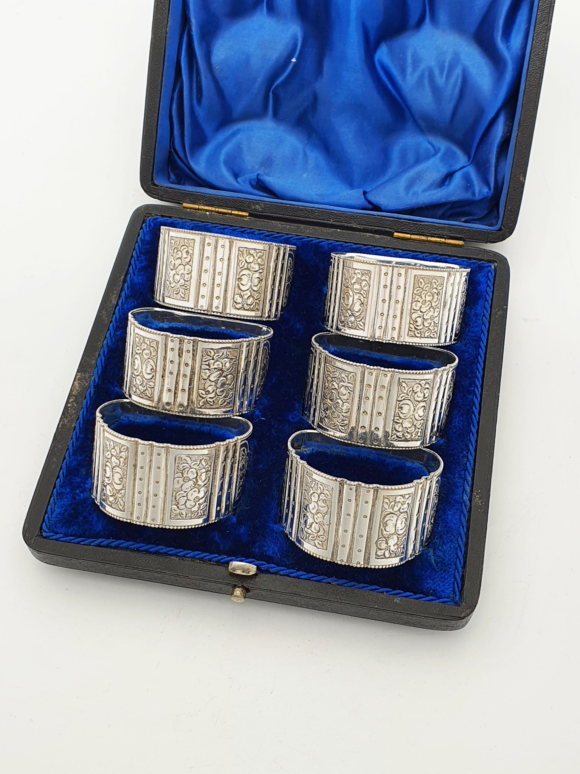 A Nice Set of 6 Antique Edwardian Silver-Plated Napkin Rings beautifully housed in their original fitted case. Each ring features a detailed floral and beaded design, with alternating bands of engraving and raised dotwork, giving them a rich and decorative texture. A luxurious deep blue velvet interior cradles each piece, offering both protection and display appeal – circa 1905.