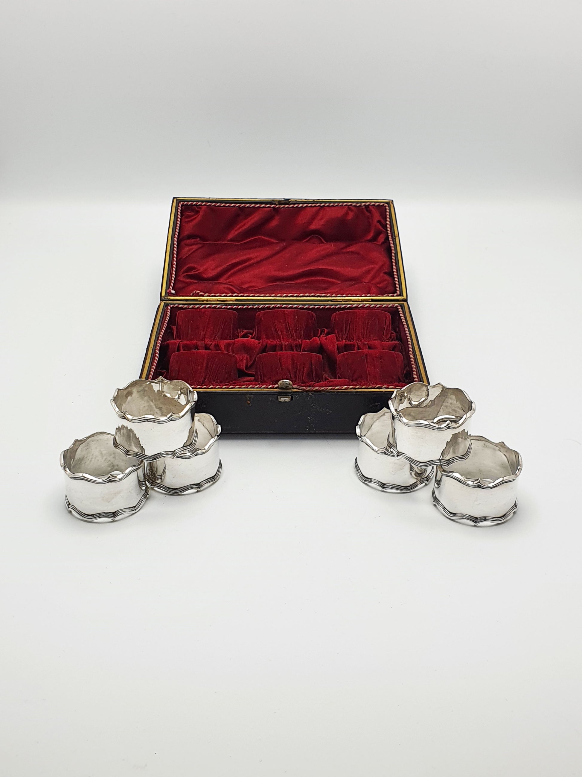 A Nice Set of Six Antique Edwardian Silver-Plated Napkin Rings featuring a graceful, panelled design with scalloped edges, these rings bring both formality and flair to any table setting. The hinged leatherette case features gold tooling and a secure clasp and is lined in rich red satin and velvet, allowing each ring to nest snugly into its own individual compartment – circa 1905.