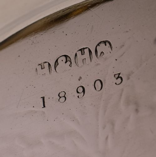 A nice English Victorian small silver plated salver/tray with embossed flower decoration to the edge and engraved flower decoration to the main body with vacant central cartouche and stands on 3 ball feet. Made by the renowned maker Hukin & Heath circa 1880. FREE worldwide delivery. Measurements: Height: 1 1/2 (approx 3.7cm) Diameter: 8 (approx 20cm) Weight: 365 In good condition - any dark areas are shadows from the photography there is no damage to the silver plate.