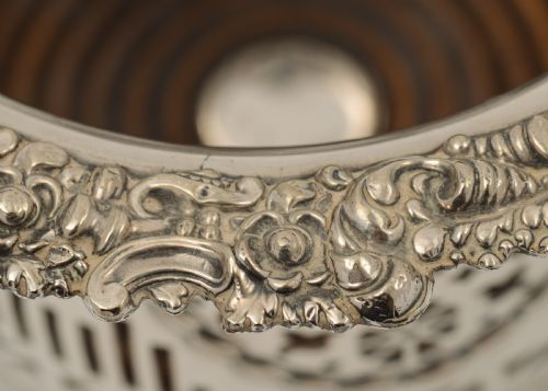 A Nice Victorian silver on copper Bottle Coaster with pierced and embossed decoration and hard wood turned base with silver plated button to centre and felt base. Slight wear with copper coming through usual for age. Circa 1880 Free Worldwide Delivery Measurements; Height 5 ( approx 12.5 cm ) Width across top 7 ( approx 17.5 cm ) Width across bottom 5 ( approx 12.5 cm ) Weight 702 g In good condition slight wear with copper coming through - usual for age
